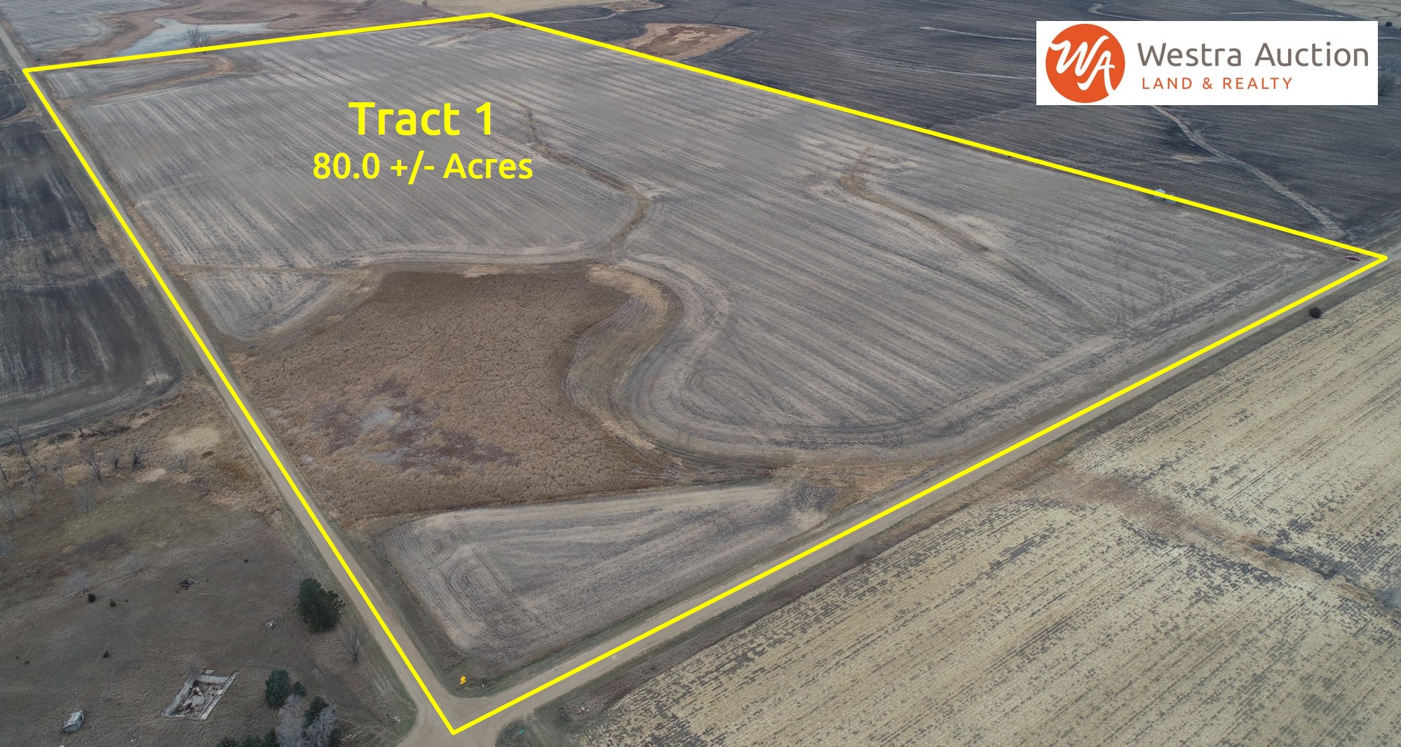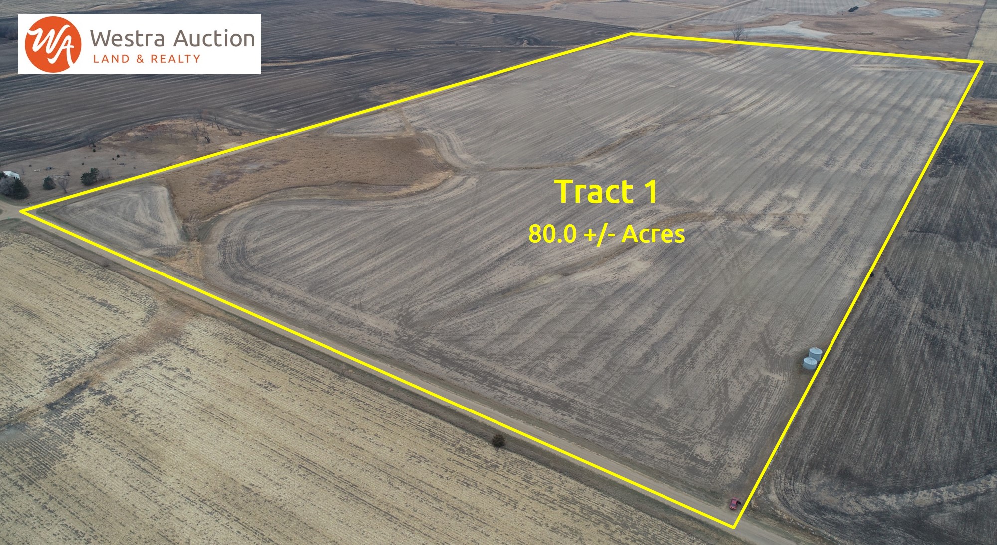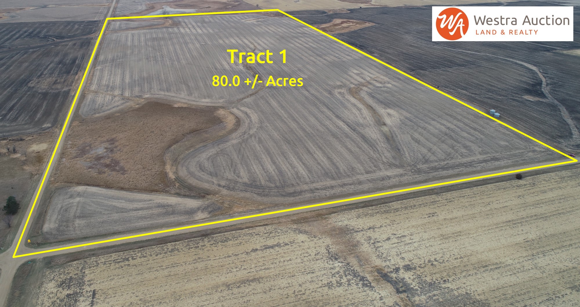 Tract 1: 80 +/- Acres.  Legal Description: S ½ SE ¼, 31-100-51 Lincoln County, SD. Located from Tea, SD, 3 miles west on County Rd 106 (272nd St) and ¾ mile south on 465th Ave.  The land has a soil rating of .723 and according to Surety-AgriData a productivity rating of 65.2.  Primary soils include: Egan-Worthing complex, 0-6% slopes (44.6% of field) and Egan-Shindler complex, 2-6% slopes (27.0% of field).  Taxes: $1,606.80.  Land includes 2 building eligibilities.  According to the FSA office there is approximately 77.10 acres of cropland, a 35.10-acre corn base/118-bushel PLC yield, 35.70-acre soybean base/36-bushel PLC yield.