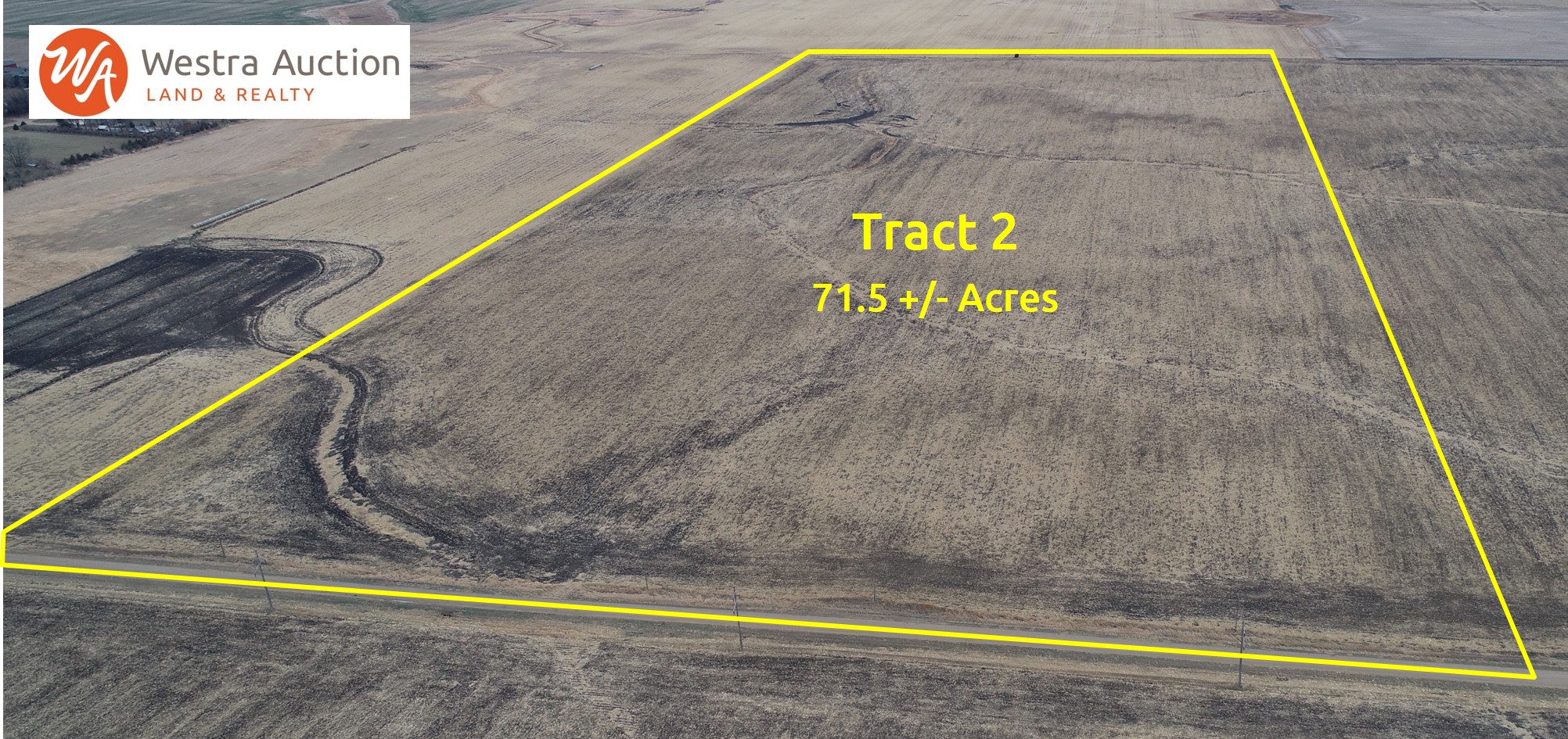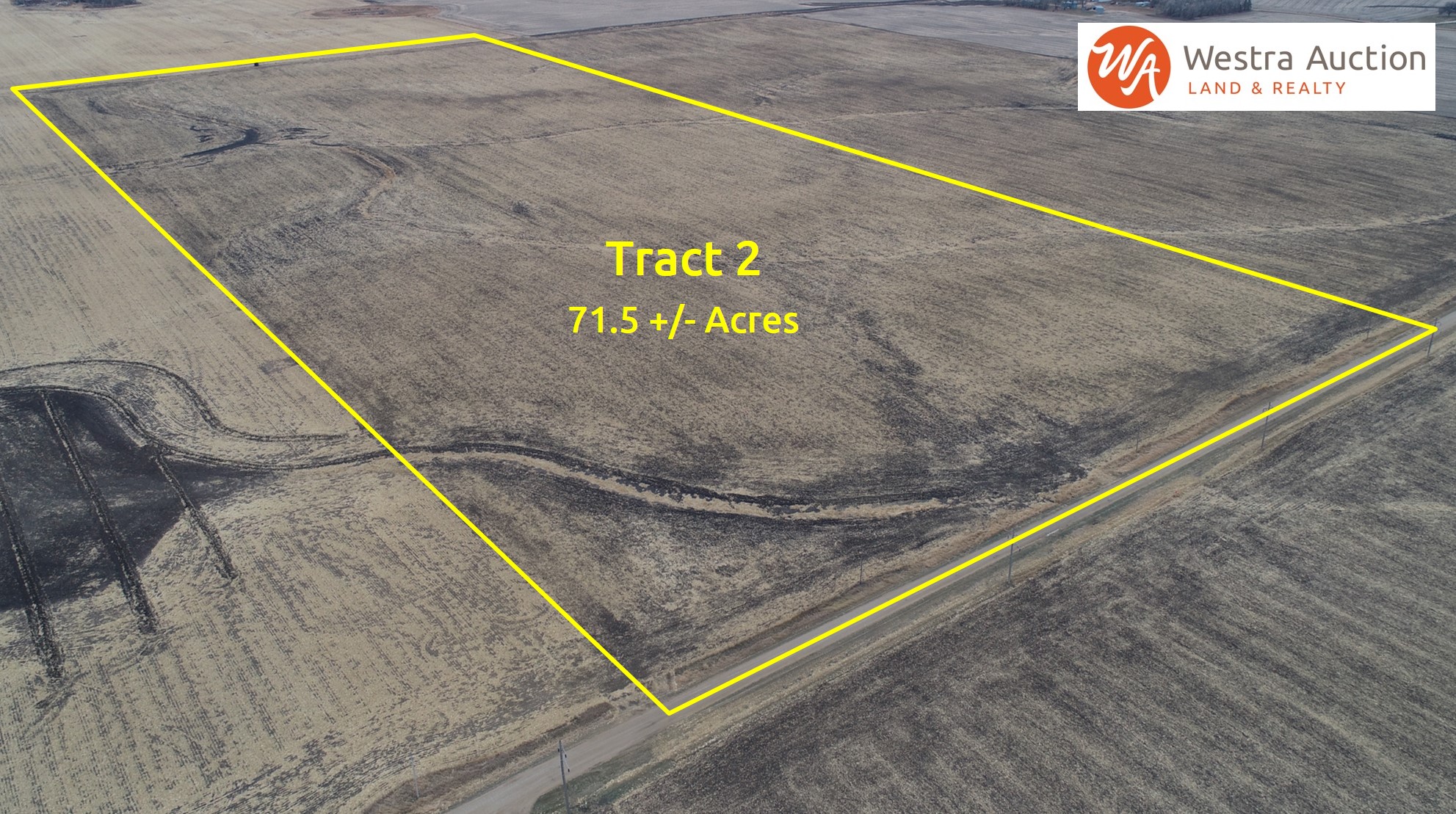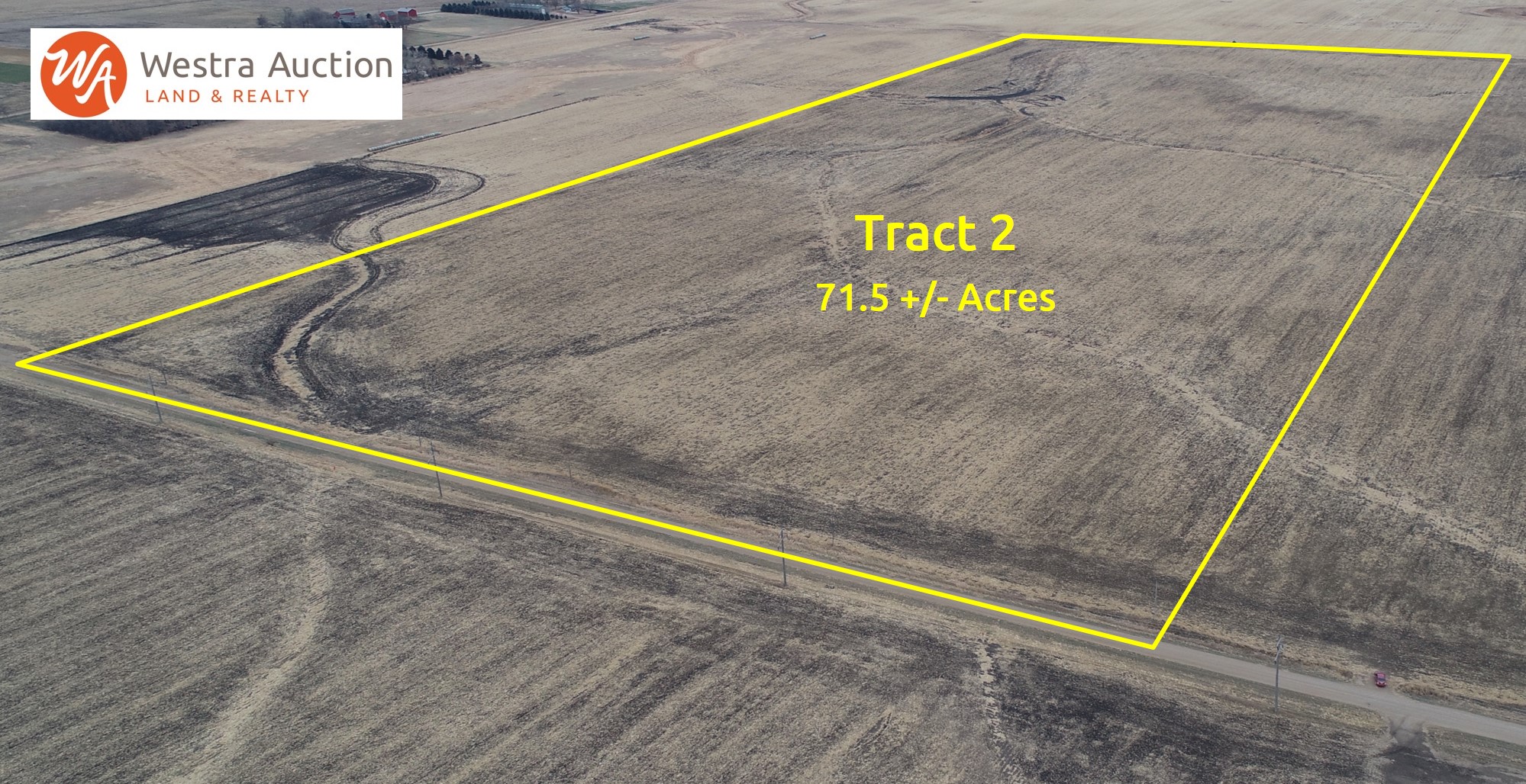 Tract 2: 71.50 +/- Acres.  Legal Description: W ½ NE ¼, except 8.5 acres, 7-99-51, Lincoln County, SD.   Located from Lennox, SD, 4 miles north on SD Hwy 17 and 1 ¼ miles west on 274th St.  The land has a soil rating of .795 and according to Surety-AgriData a productivity rating of 71.7.  Primary soils include: Egan-silty clay loam, 3-6% slopes (28.0% of field), Egan-Shindler complex, 2-6% slopes (26.0% of field) and Worthing silty clay loam, 0-1% slopes (18.7% of field).  Taxes: $1,562.92. Land includes 2 building eligibilities.  The FSA office estimates there is 70.60 acres of cropland, 32.90-acre corn base/119-bushel PLC yield, 32.7-acre soybean base/36-bushel yield.