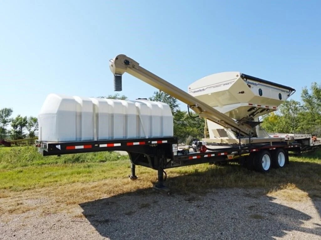 2021 Jet Co 102” x 35’ Step Deck Trailer, TA, Spring Ride, w/ Unverferth 3755XL Seed Tender w/ Honda GX390 Motor & Self Contained Hyd Scale, Remote Control, 1250 Gal Poly Fert Starter Tank w/ Honda Motor & Pump, 2” Hose & Fill Side Ladder, One Owner, Set Up Right – Nice!