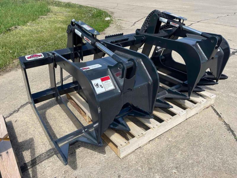 Skidloader Grapple Buckets: Stout Skidloader 72” Brush Grapple Bucket–8” spacing; Stout Skidloader 62” Brush Grapple Bucket–3” spacing, cylinder shields; Stout Skidloader 78” Brush Grapple Bucket–3” spacing, cylinder shields; Stout Skidloader 69” Brush Grapple Bucket–3” spacing, cylinder shields; 2023 Wolverine 72” Skidloader Grapple Bucket–SN:ZW-02489, flat bucket
