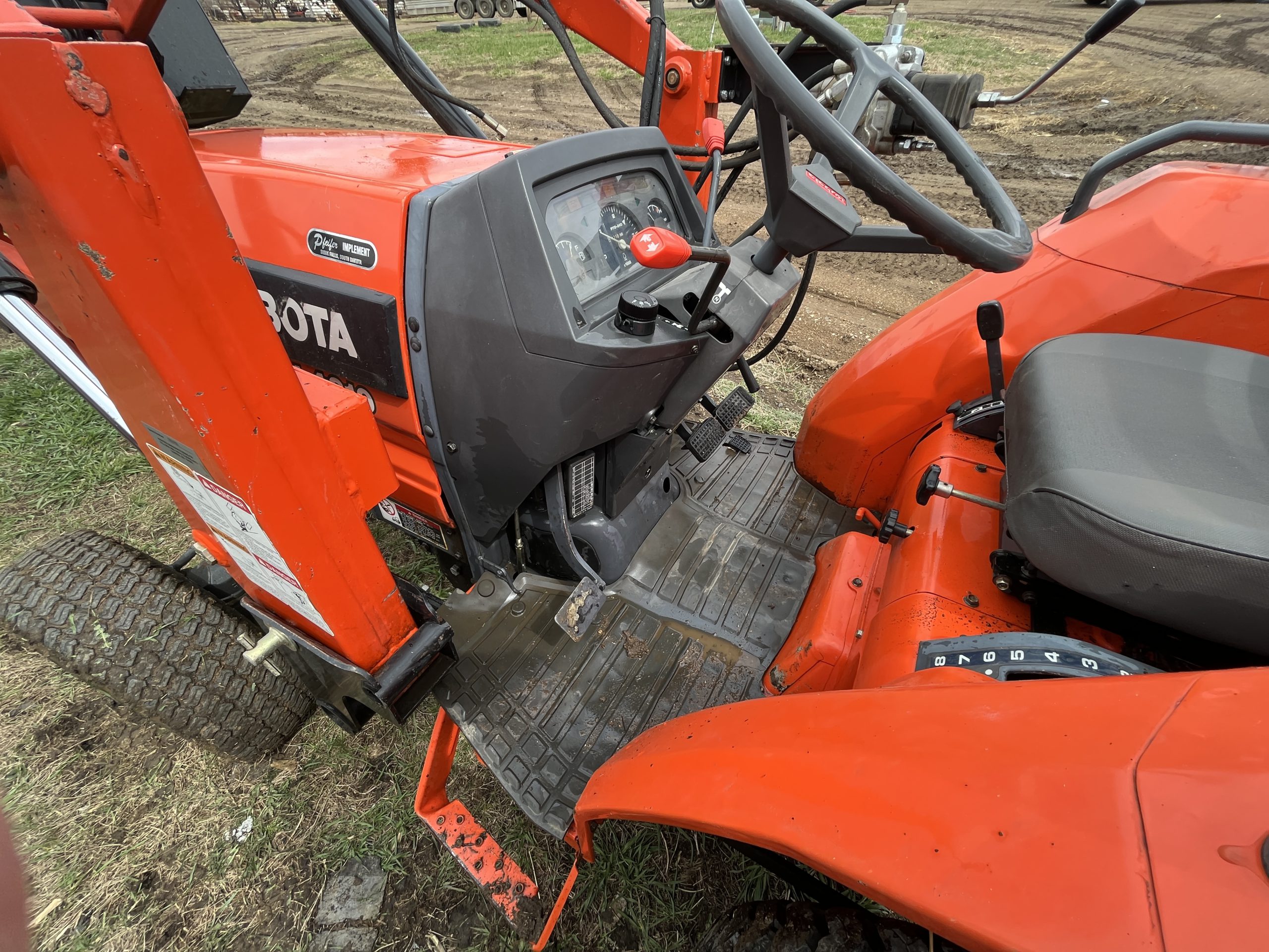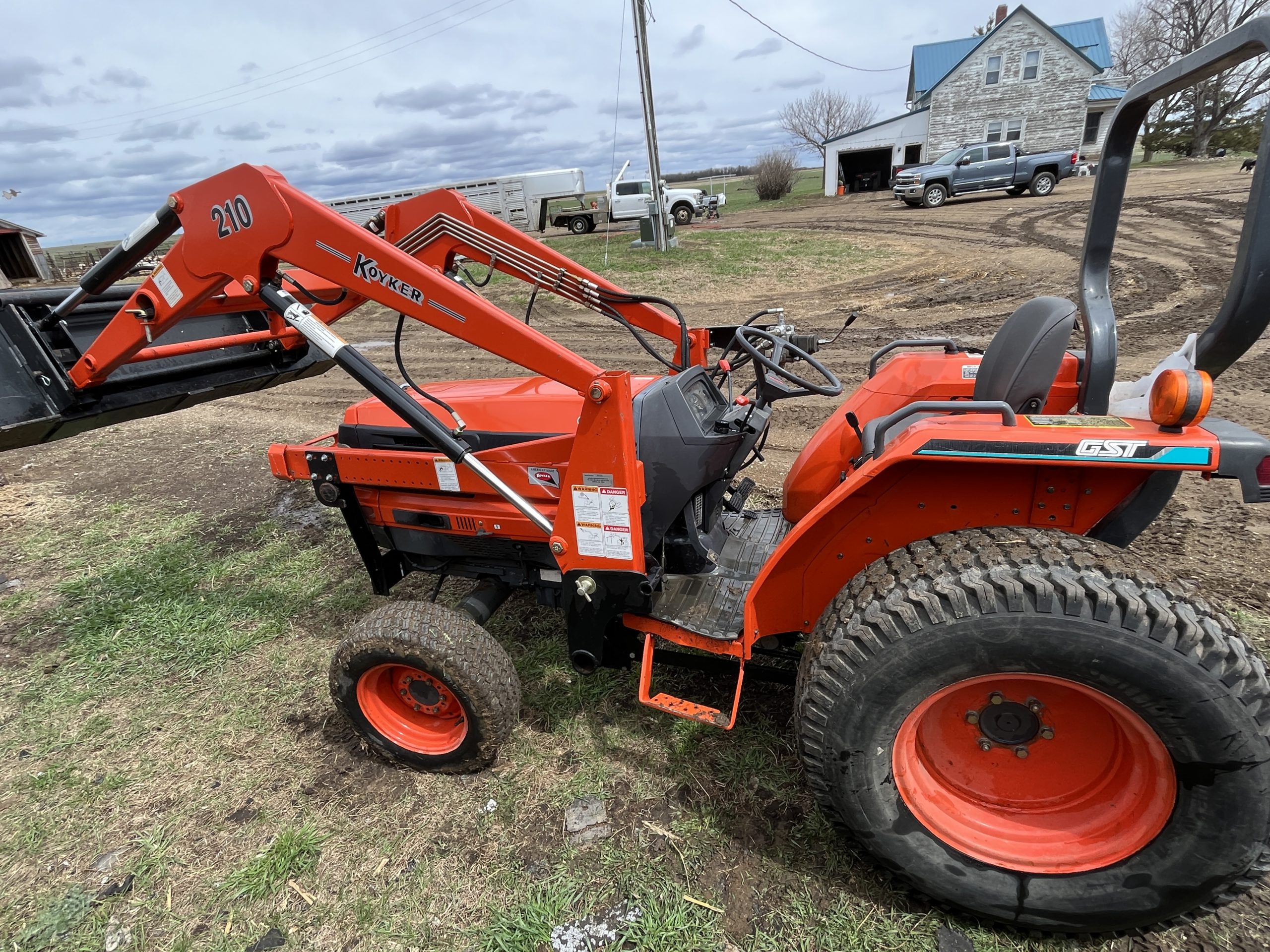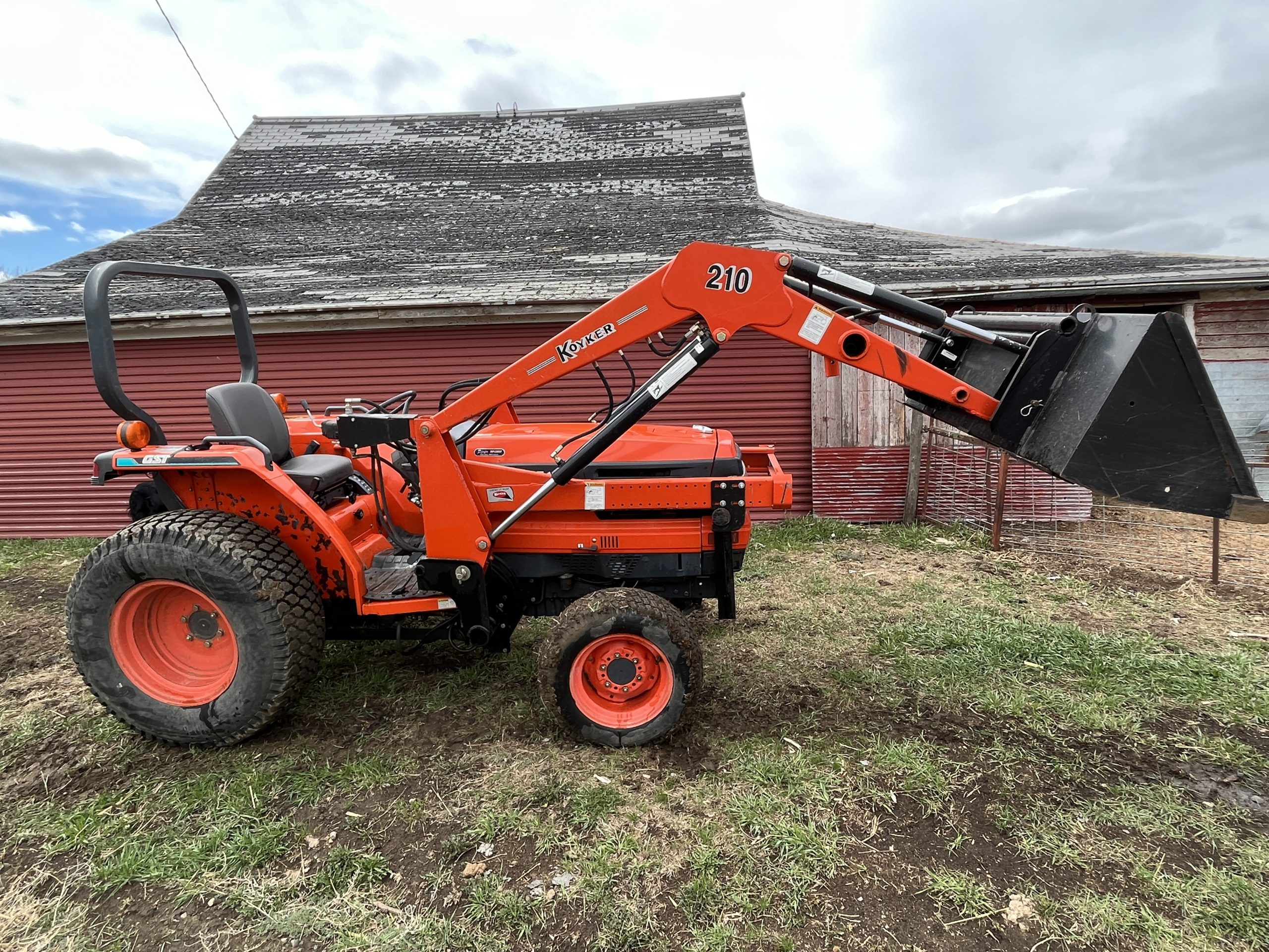 8-speed glide-shift transmission, turf tires, auxiliary hyd, quick hitch, locking diff, nice. 43 hp, SN: L4310061269; Sold with 2001 Koyker 210 loader with 6′ bucket, quick tach, very nice.