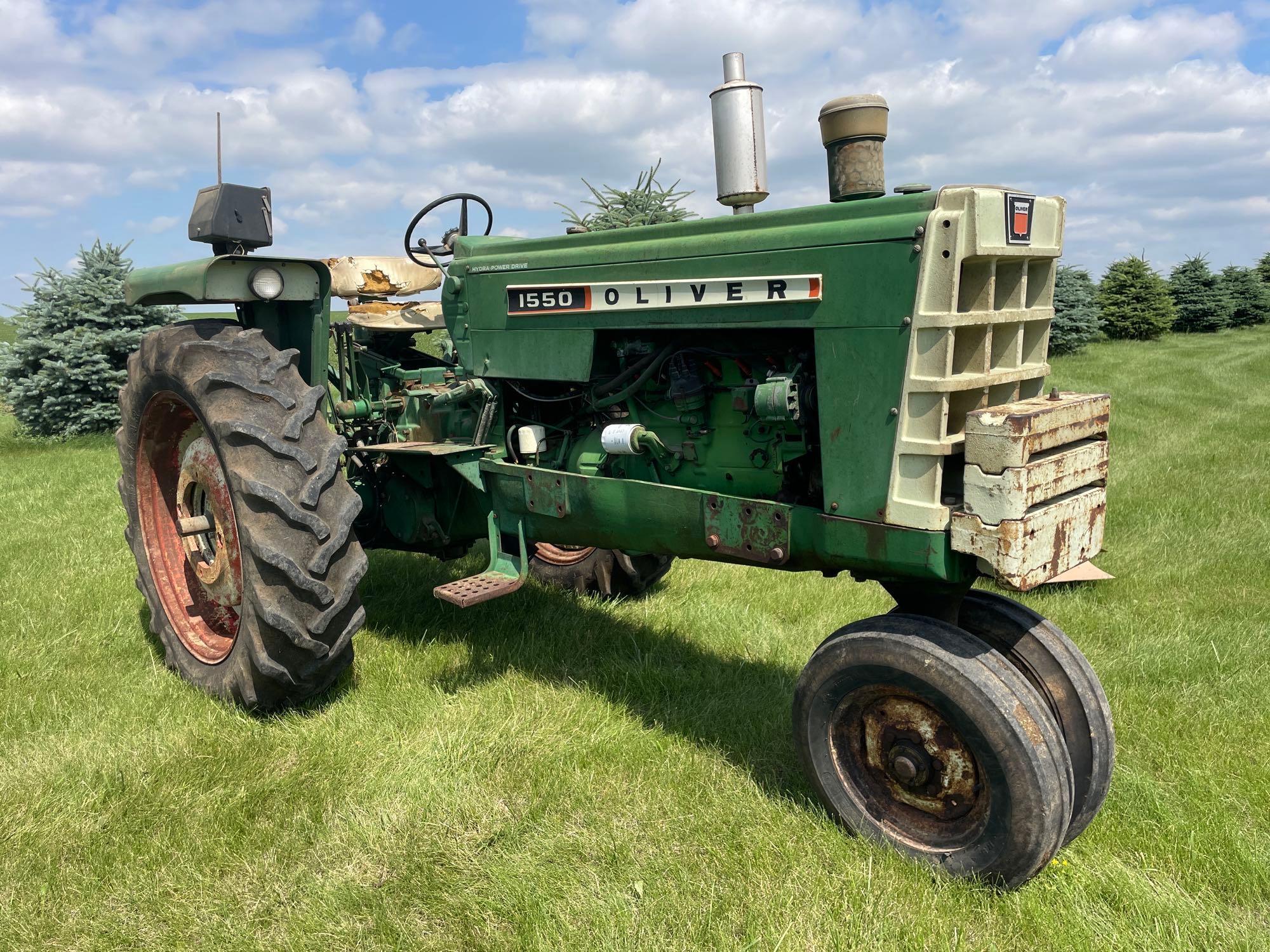 Oliver 1650 Tractor—SN:172-971-504, shows 3396 hours which are believed to be original hours, hydra power drive, 2 sets of rear wheel weights, 3pt, 540 pto, 15.5-38 rear tires, rear fenders, front weights, new seat included, tractor was purchased by current owners grandfather brand new