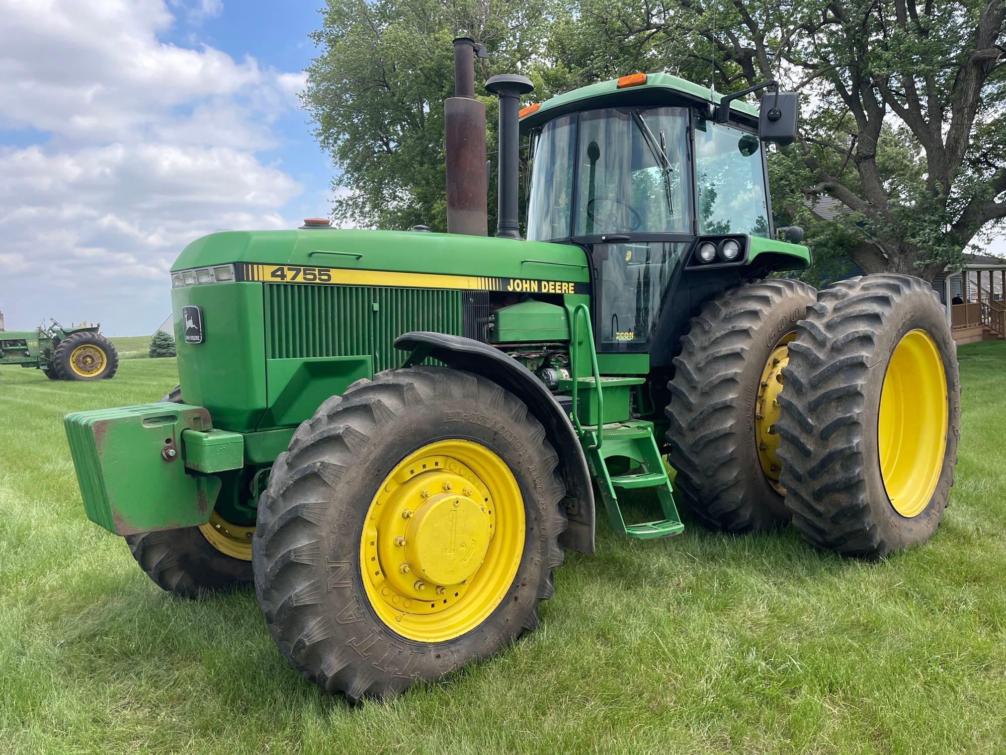 John Deere 4755 MFWD Tractor—SN:RW4755P001267, shows 7117 hours, powershift transmission, 3pt, 1000 pto, 3 remotes, 380/85R30 front tires, 10 front suitcase weights, quick hitch, 18.4R42 rear tires with duals, approx 150 hours on a transmission rebuild, rear differential, pto clutch and new brake pads with paperwork (Over $15,600.00 spent)! CLICK HERE TO VIEW PAPERWORK