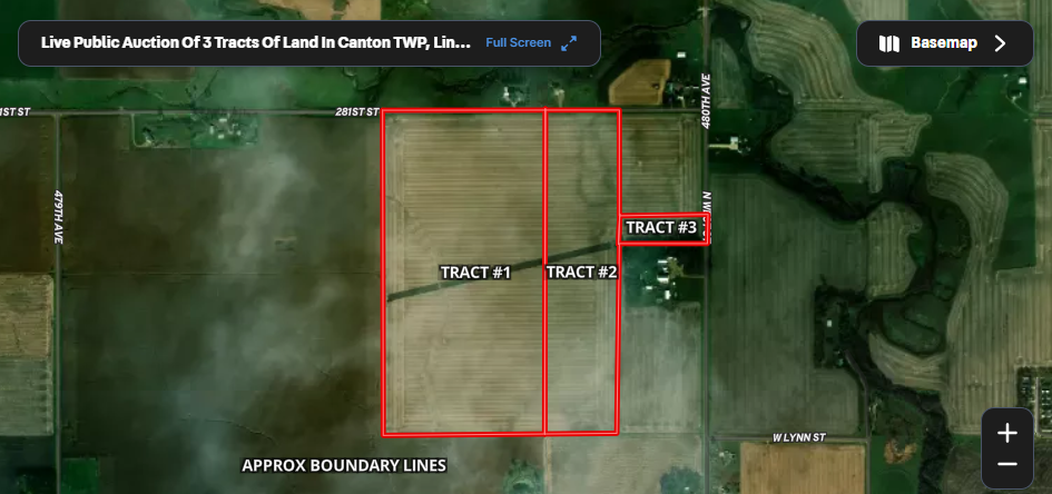 Property Location: From Caseys in Canton, SD go approx. 1 mile West on HWY 18 to 480th Ave. then go North on 480th Ave. for 3/4 of a mile to Tract 3. Tract 1 and 2 are located directly West of Tract 3 and are both accessed by going 1/4 mile North from Tract 3 to 281st ST. and then goin approx. 1/4 mile West on 281st ST. Tract 1 and 2 are located on the South side of 281st ST and Tract 3 is located on the West side of 480th Ave. The Auction will be held at the site of the farmland.