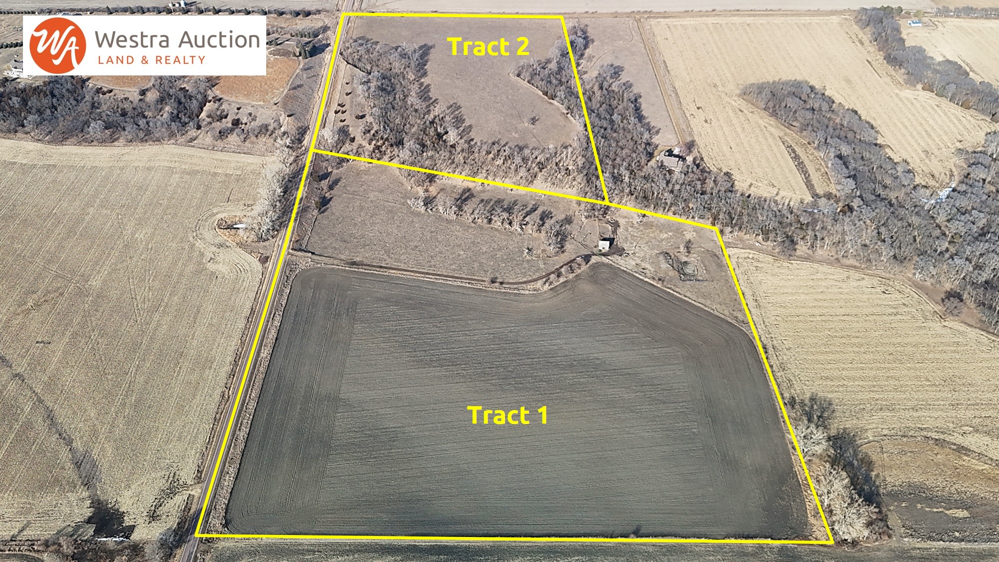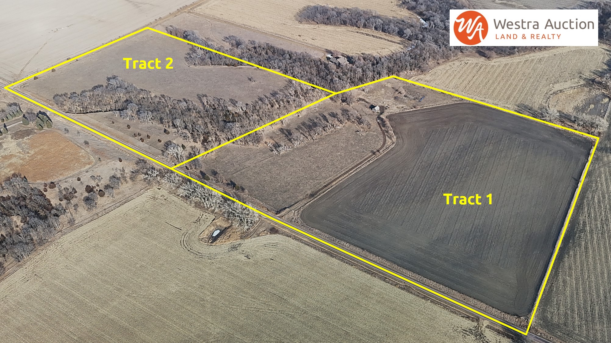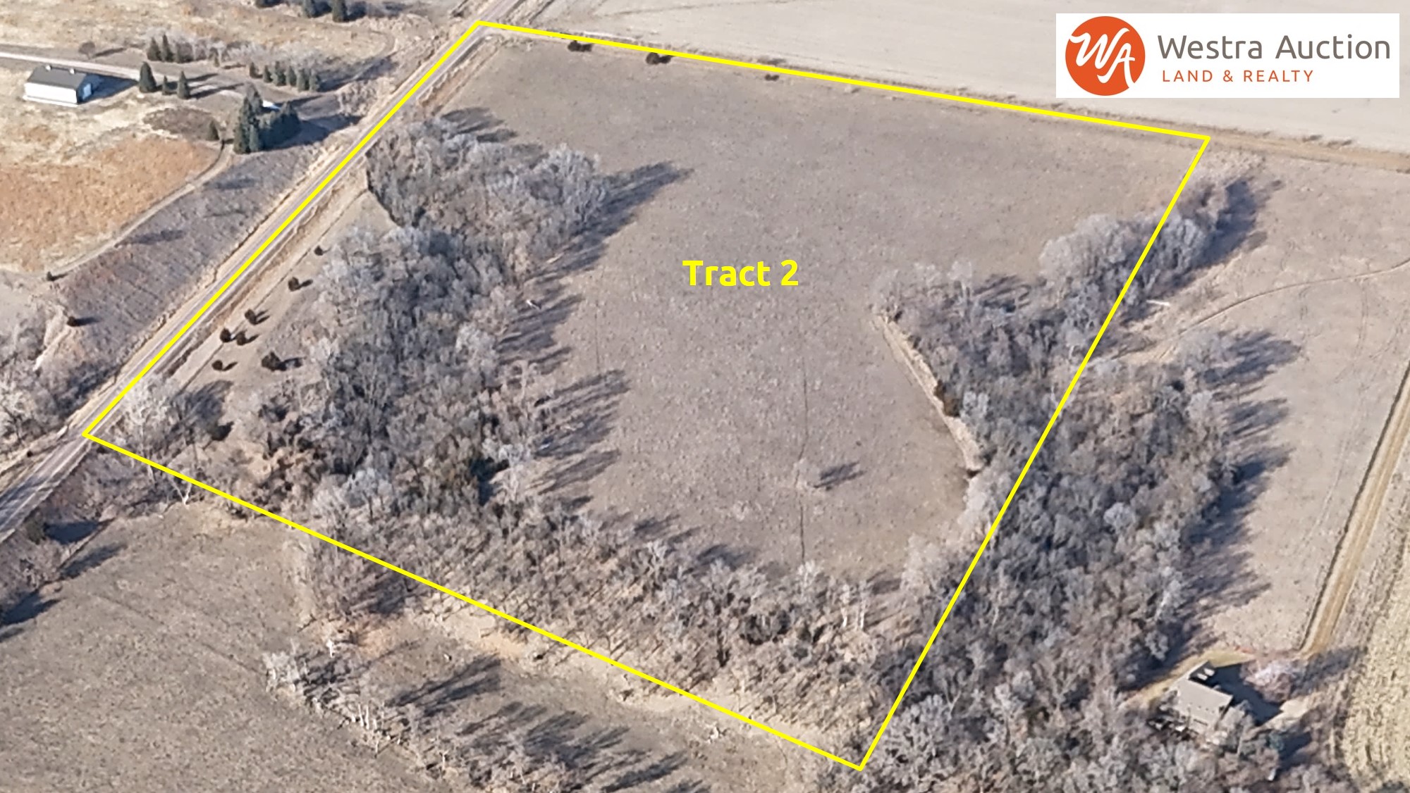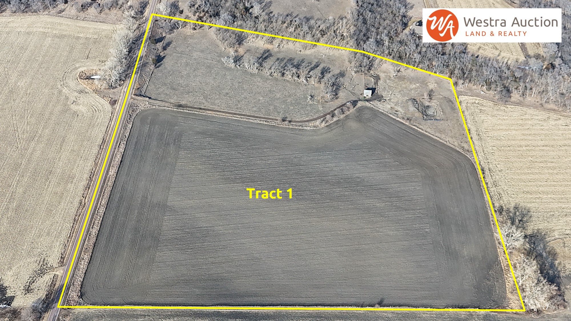 Tract 1:  39.43 +/- acres, 1 building eligibility.  The land includes approximately 25 acres cropland with the balance of the land in pasture, trees, dugout, well and older outbuildings.  According to Surety-AgriData, the land has a productivity index of 82.2. The cropland is leased for the 2025 crop year and the buyer will be credited the 2025 crop lease payment.