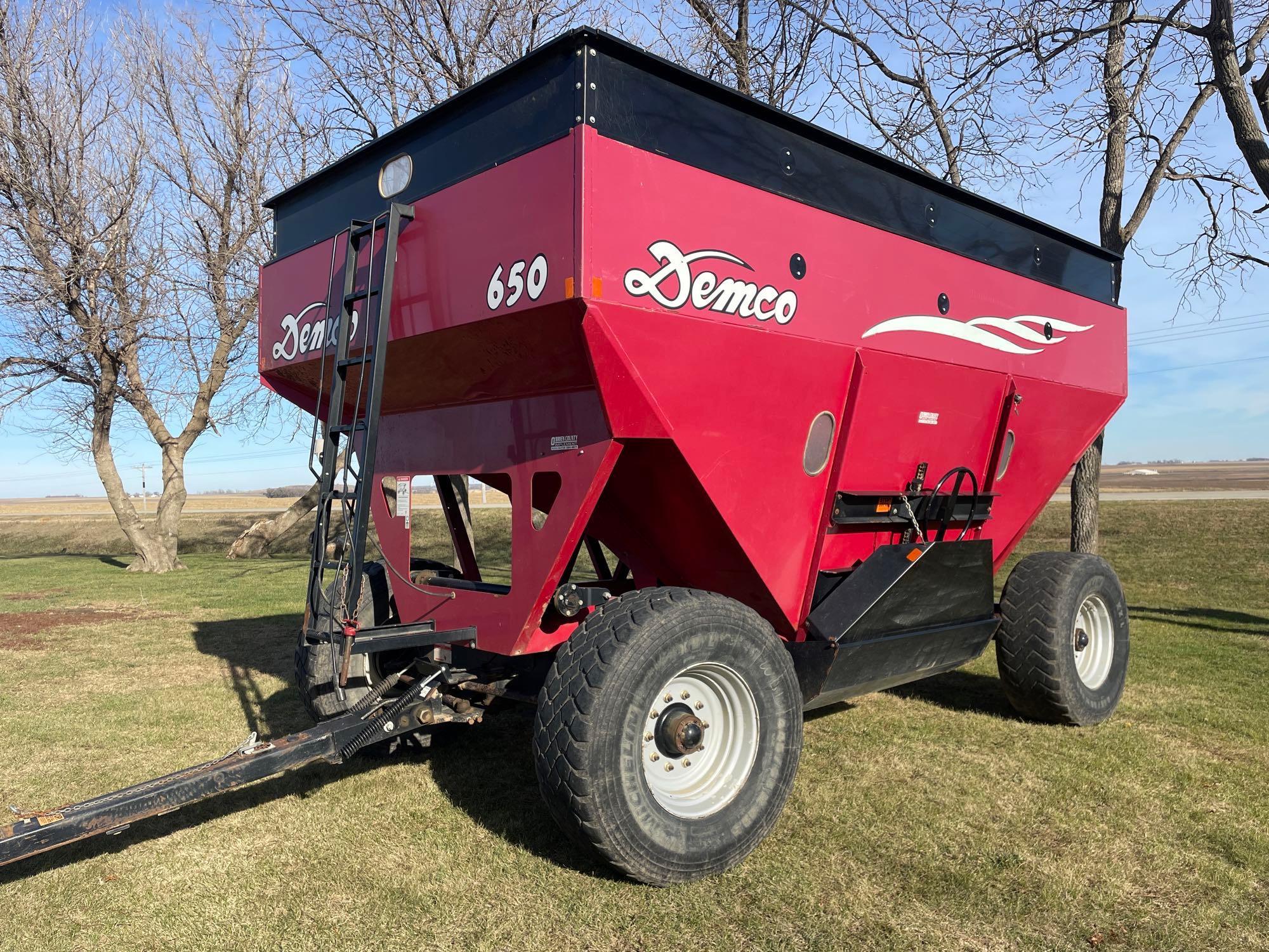 Gravity Wagons: 2018 Demco 750 Bushel SS Gravity Wagon—1 Owner—SN:K28314, fenders, 445/65R22.5 tires, wagon has an manual/elec gate (elec portion not currently working); 2014 Demco 750 Bushel Gravity Wagon (Green)—1 Owner—SN:E56077, brakes, side viewing windows, lights, ext tongue, 445/65R22.5 tires; 2014 Demco 750 Bushel Gravity Wagon (Green)—1 Owner—SN:E56078, brakes, side viewing windows, lights, ext tongue, 445/65R22.5 tires; 2011 Demco 650 Bushel Gravity Wagon—SN:B08790, brakes, lights, ext tongue; 2009 Demco 650 Bushel Gravity Wagon—1 Owner-SN:Z08342, brakes, ext tongue, lights, 445/65R22.5 tires, side viewing windows