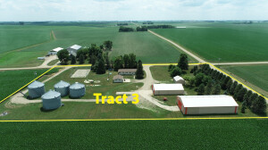 General Description of Tract 3: Acreage Buyers if you have been searching for a great acreage with lots of potential then be sure to check out this property today! This acreage site has been surveyed to be 5.37 gross acres! This acreage site features a 2+ bedroom ranch style home with an attached garage and several updates! The main floor of the home features 2 bedrooms, sitting room, living room, dining room and a bathroom with a tub/shower! The bedrooms and living room recently had new carpet installed in Nov of 2020! The lower level of the home is partially finished with a possible bedroom, a kitchenette area, family room, storm shelter room and a mechanical/laundry room! This home has asphalt shingles, vinyl siding and also just had all new vinyl windows installed in approx. 2013. This home has a propane furnace and central a/c. The outbuildings on the property consist of a 44 x 72 Morton Machine shed which is insulated and heated with a cement floor, a 54 x 108 Machine shed with cement floor, a 24 x 34 storage building and a 24 x 32 detached double garage. This property also features 4 grain bins which have a total combined storage space of approx. 79,000bu.!! This property is on REC elec and also has 3 phase elec to the property! This property is on rural water and also has well which is no longer in use. The buyer shall be required to inspect and update at the buyers sole expense the septic system to Iowa Code if the septic system does not pass inspection. The grain bins on the property are leased until June 30, 2022 and the new buyer will receive pro-rated rent for the grain bins and will be reimbursed for electricity used by the grain bins over the monthly minimum pro-rated accordingly. This property has been well maintained and would make an excellent acreage for you or your family to establish your families legacy! Be sure to attend an open house or schedule a private tour of this property today! Buyer of this tract will be required to grant an ingress/egress access easement to the buyer of Tract 2 for access in the SE corner of the acreage site as shown by survey.