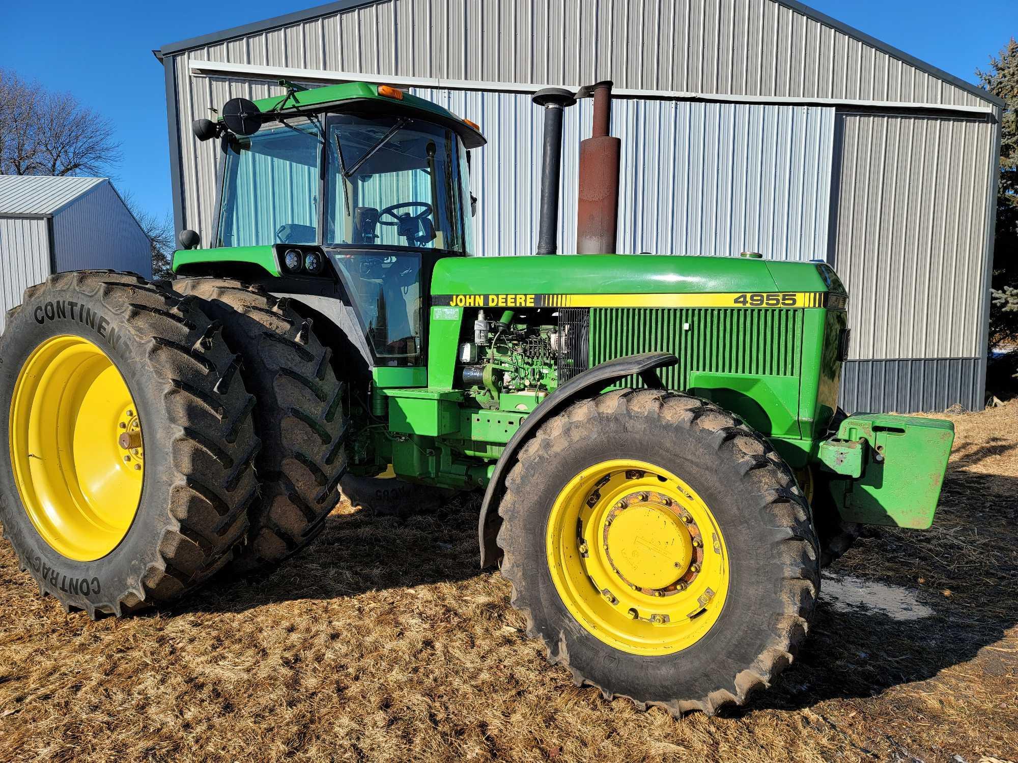 1991 John Deere 4955 MFD Tractor: 9751hrs., poweshift, 18-4r46 Radial rear tires and duals, both mains and duals match at 65% Front tires 14.9R30 radials at 70%, 10 front weights, LED lights, large 1000 pto, 4 hyd., quick hitch, 300 ATU autostart, brown box with SF1 key card, new owner will need to provide globe! Front fenders. Ser# RW4955P008247. Very nice straight tractor!