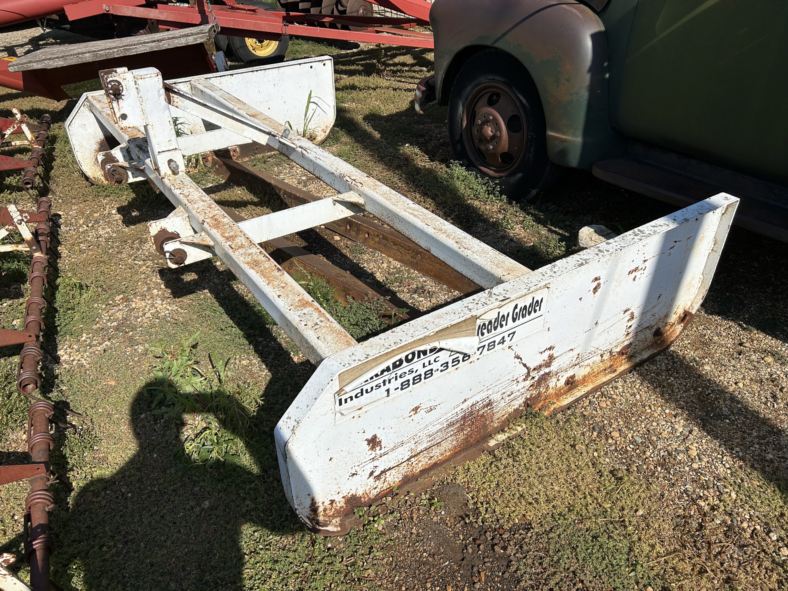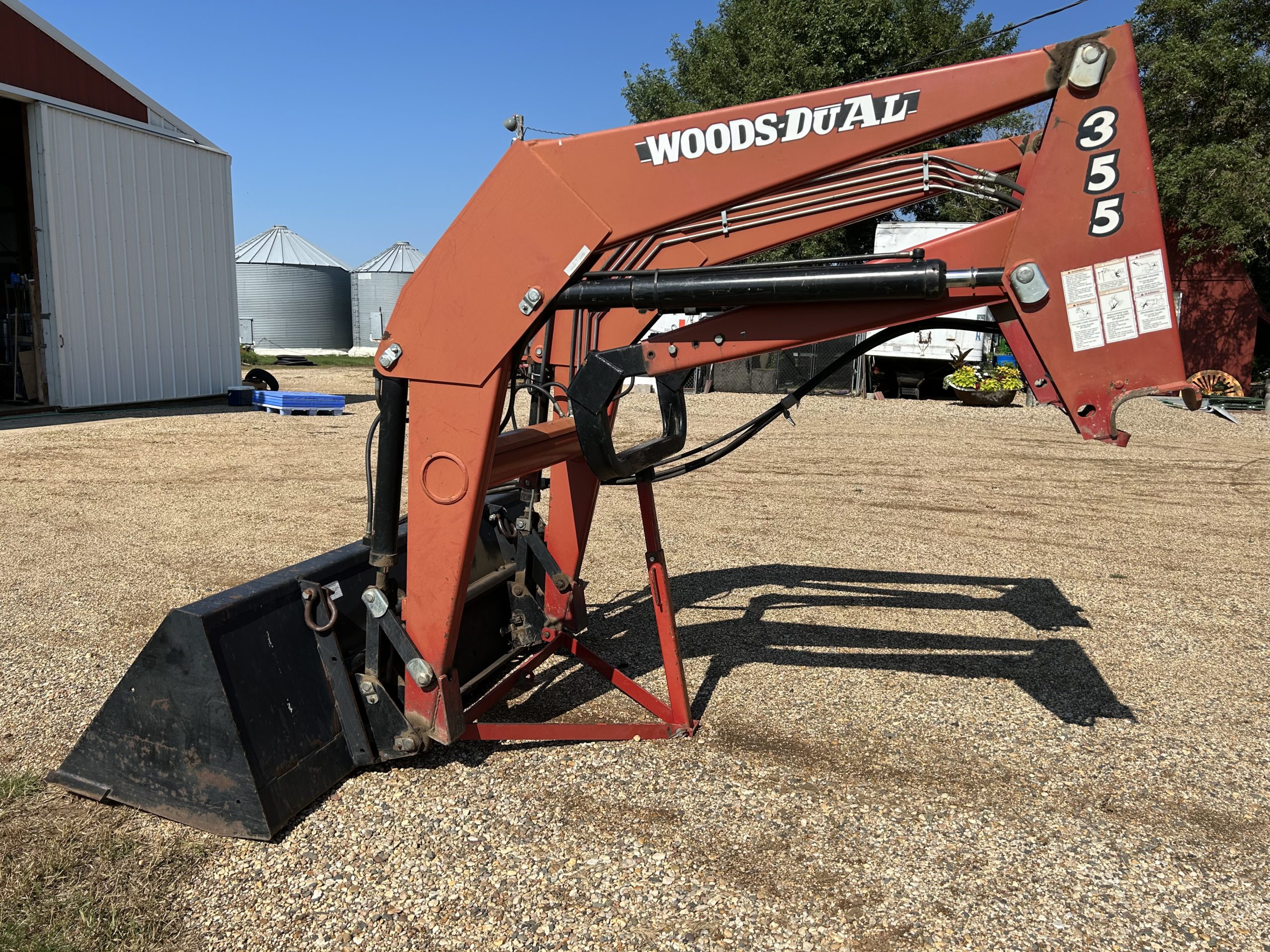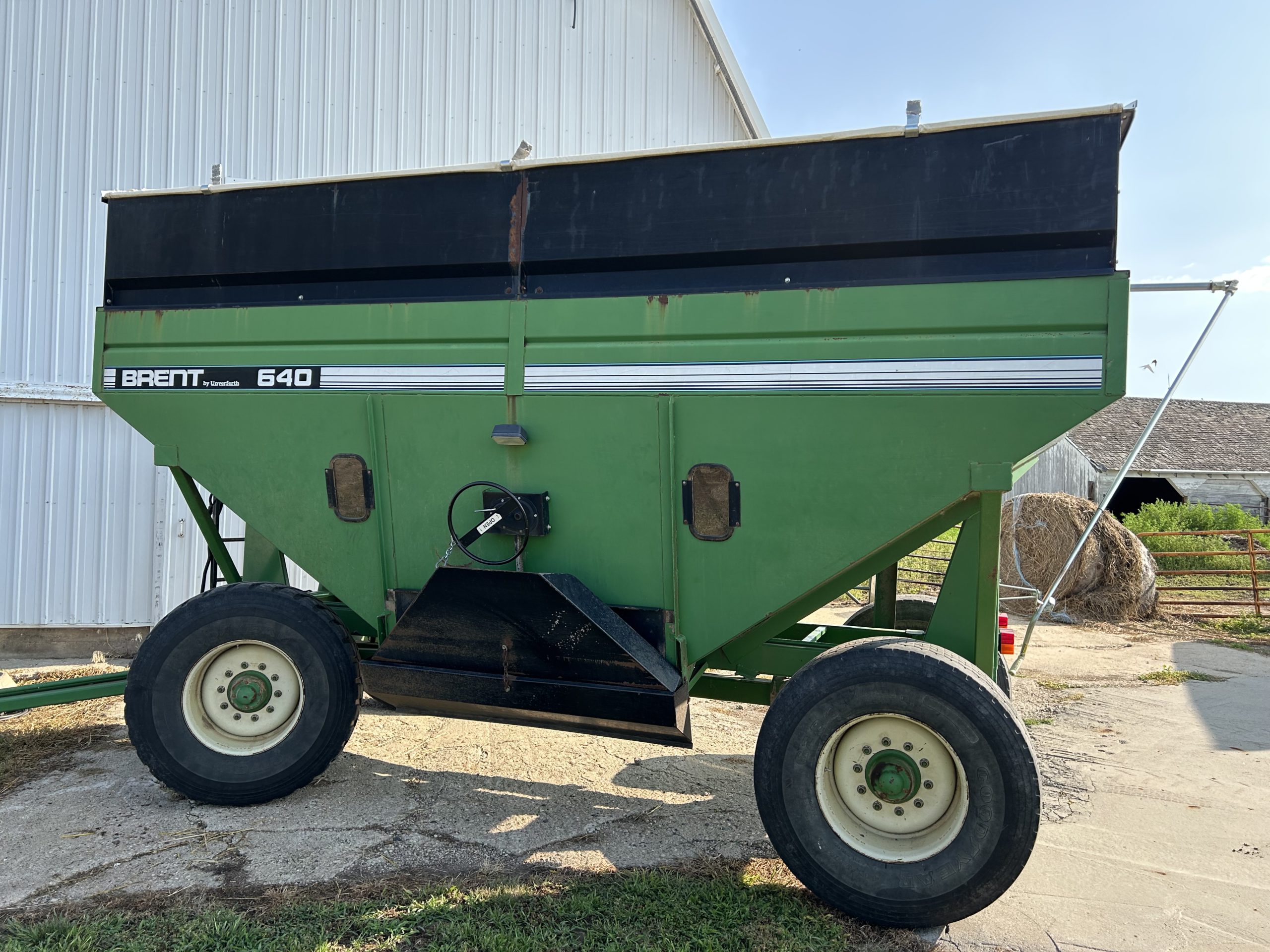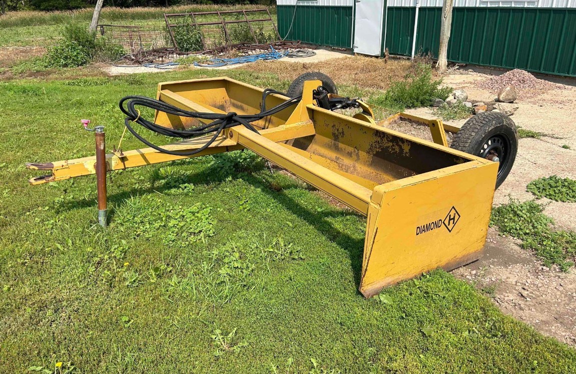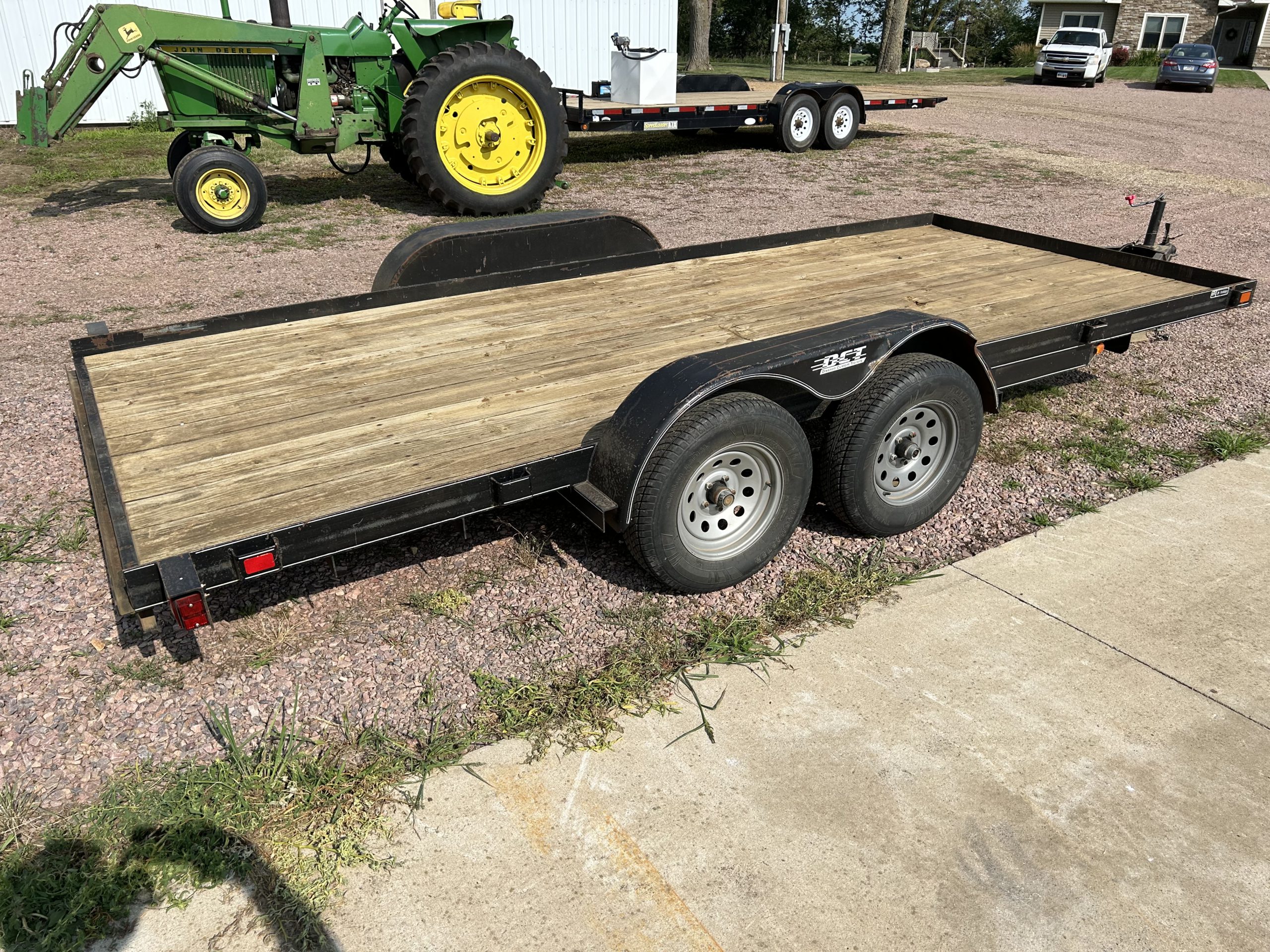 Misc.: Dressen 7’X16’ car trailer, ramps, 3500lb. axles, nice; MDS 7’ rock bucket with grapple, like new! JD 7’ bucket and grapple; 2- set 20.8-38 duals; 1 set JD wheel weights; 2-10 bolt JD dual hubs, off 4640; 2-JD Cat II/III cast quick hitches; 5’’ 10 bolt dual spacers; 76-gallon JD front diesel tank; brand new 22.5 10 bolt rim and tire for Brent 640 wagon; new 12.5-15 tire and rim.