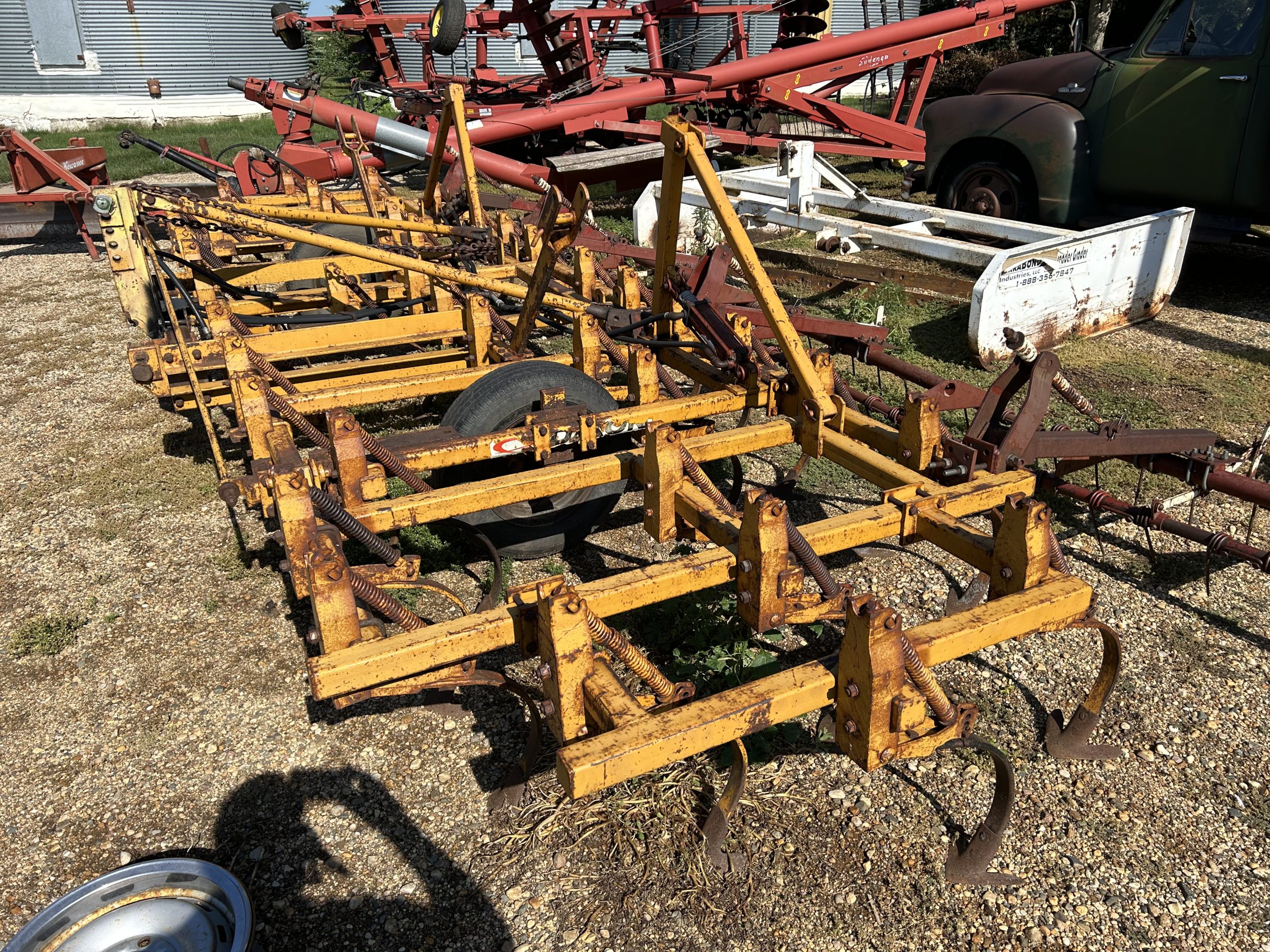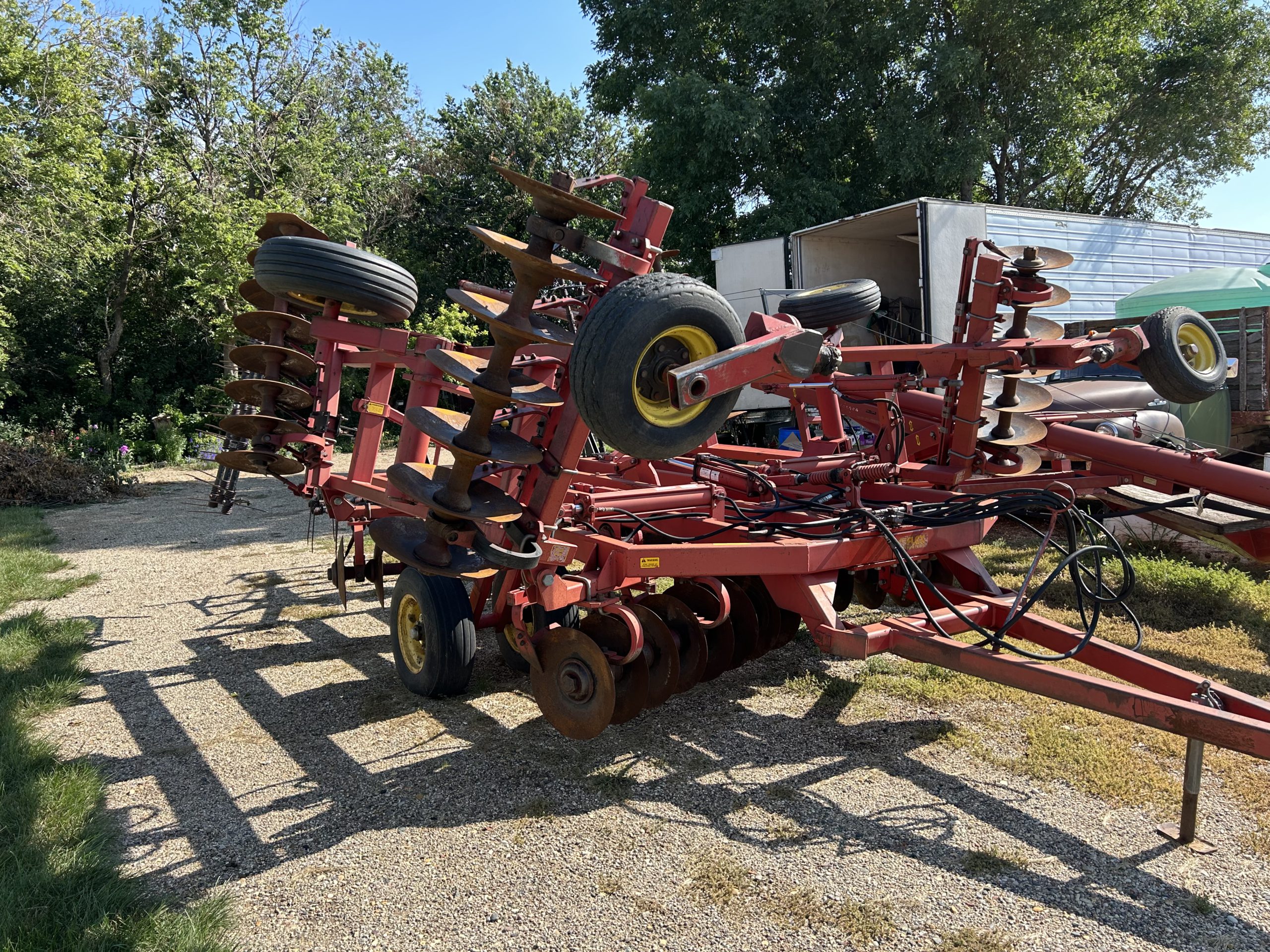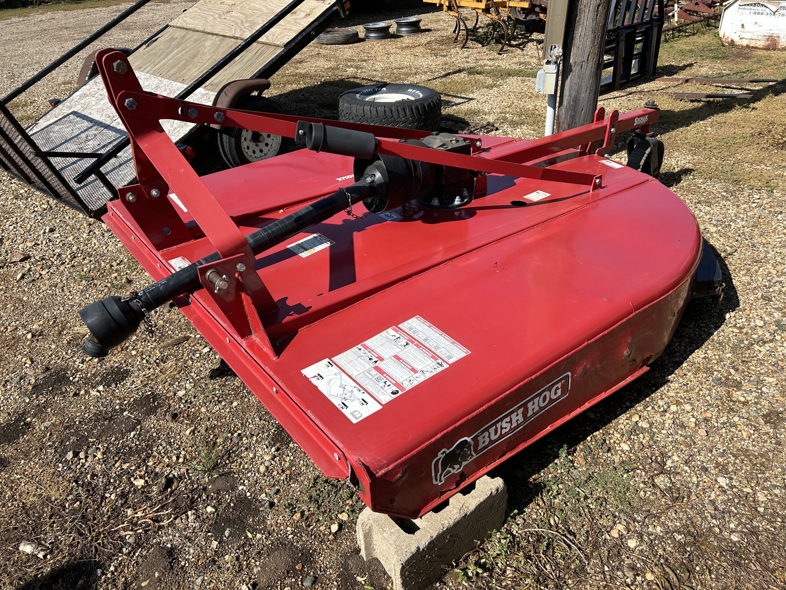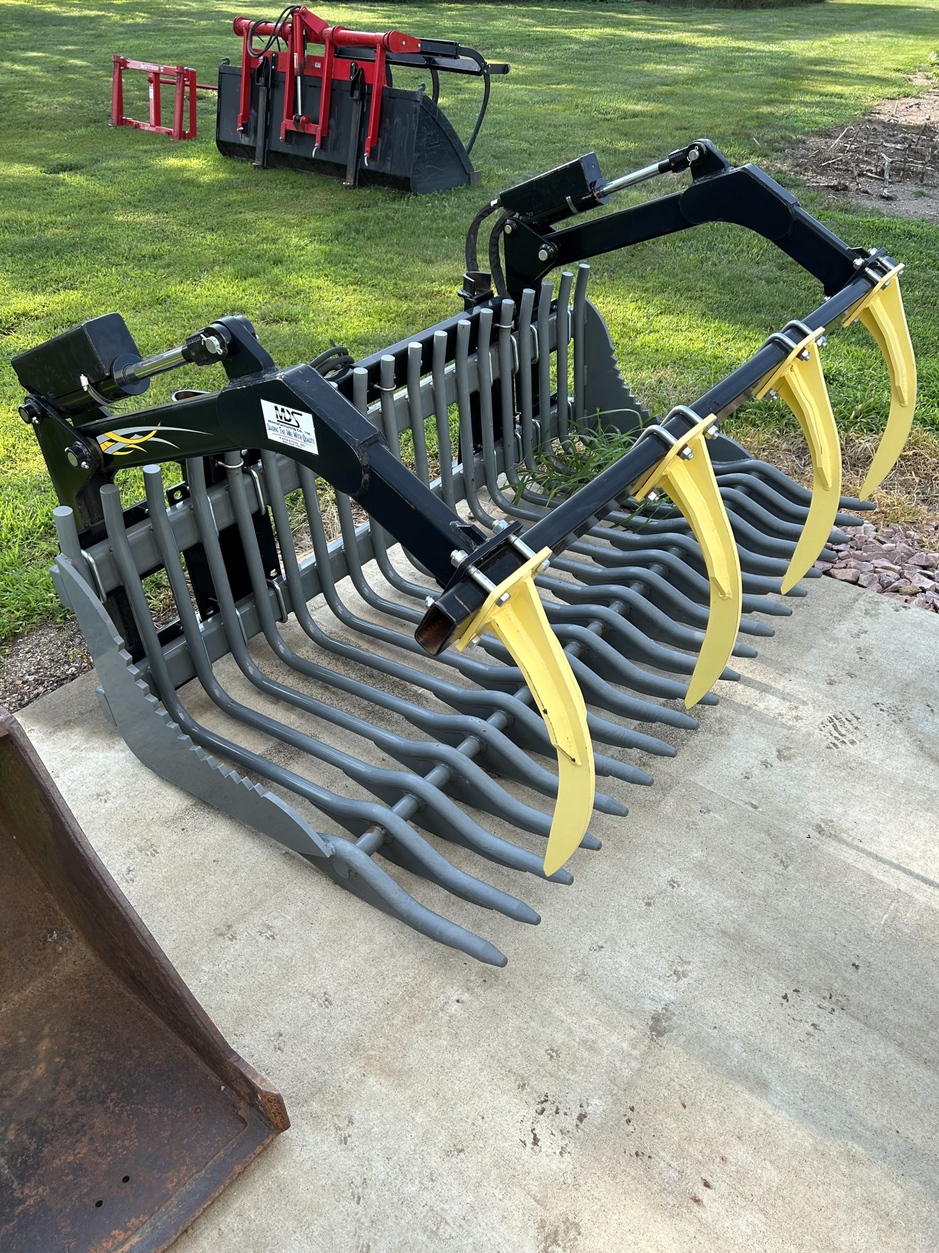 Misc.: Dressen 7’X16’ car trailer, ramps, 3500lb. axles, nice; MDS 7’ rock bucket with grapple, like new! JD 7’ bucket and grapple; 2- set 20.8-38 duals; 1 set JD wheel weights; 2-10 bolt JD dual hubs, off 4640; 2-JD Cat II/III cast quick hitches; 5’’ 10 bolt dual spacers; 76-gallon JD front diesel tank; brand new 22.5 10 bolt rim and tire for Brent 640 wagon; new 12.5-15 tire and rim.