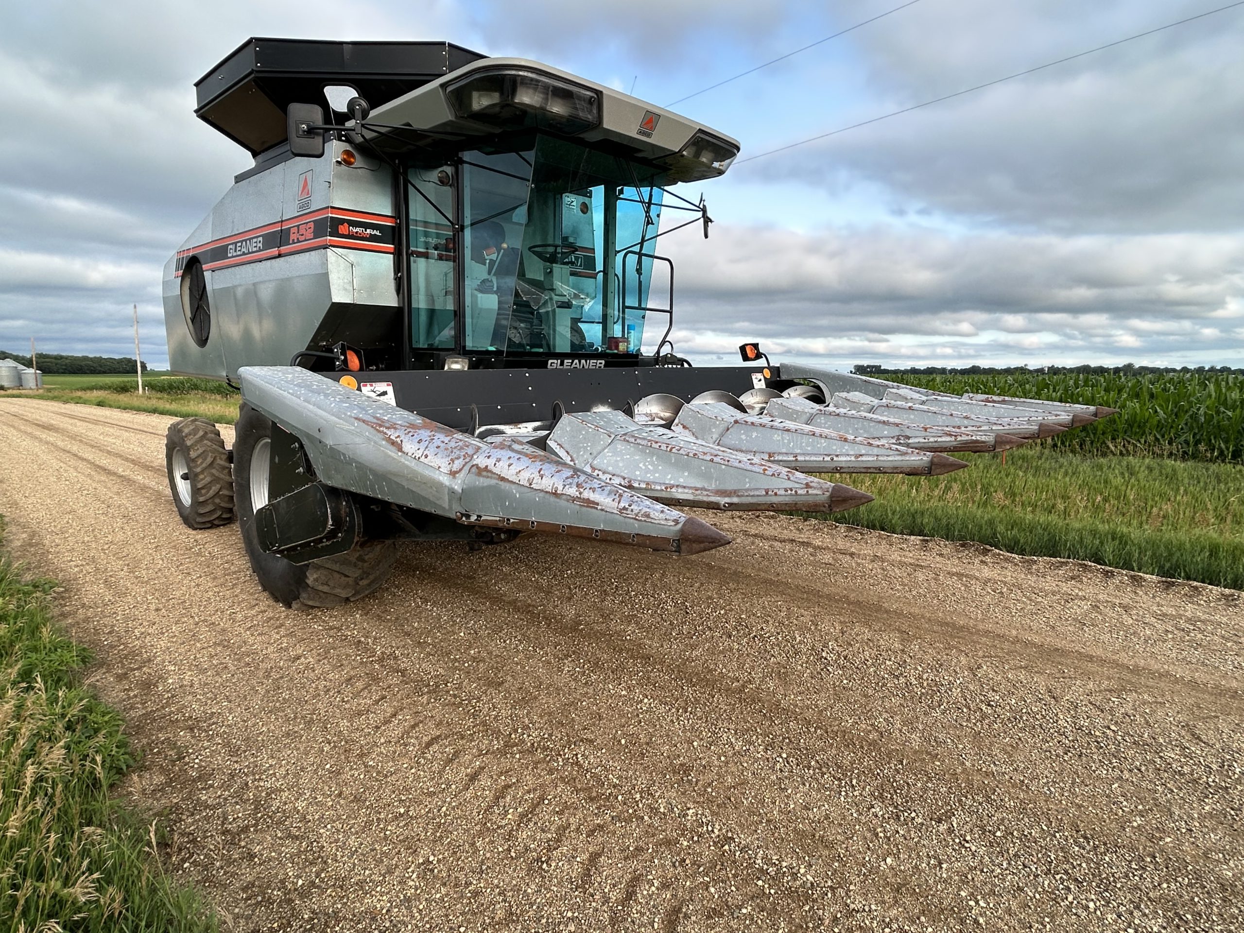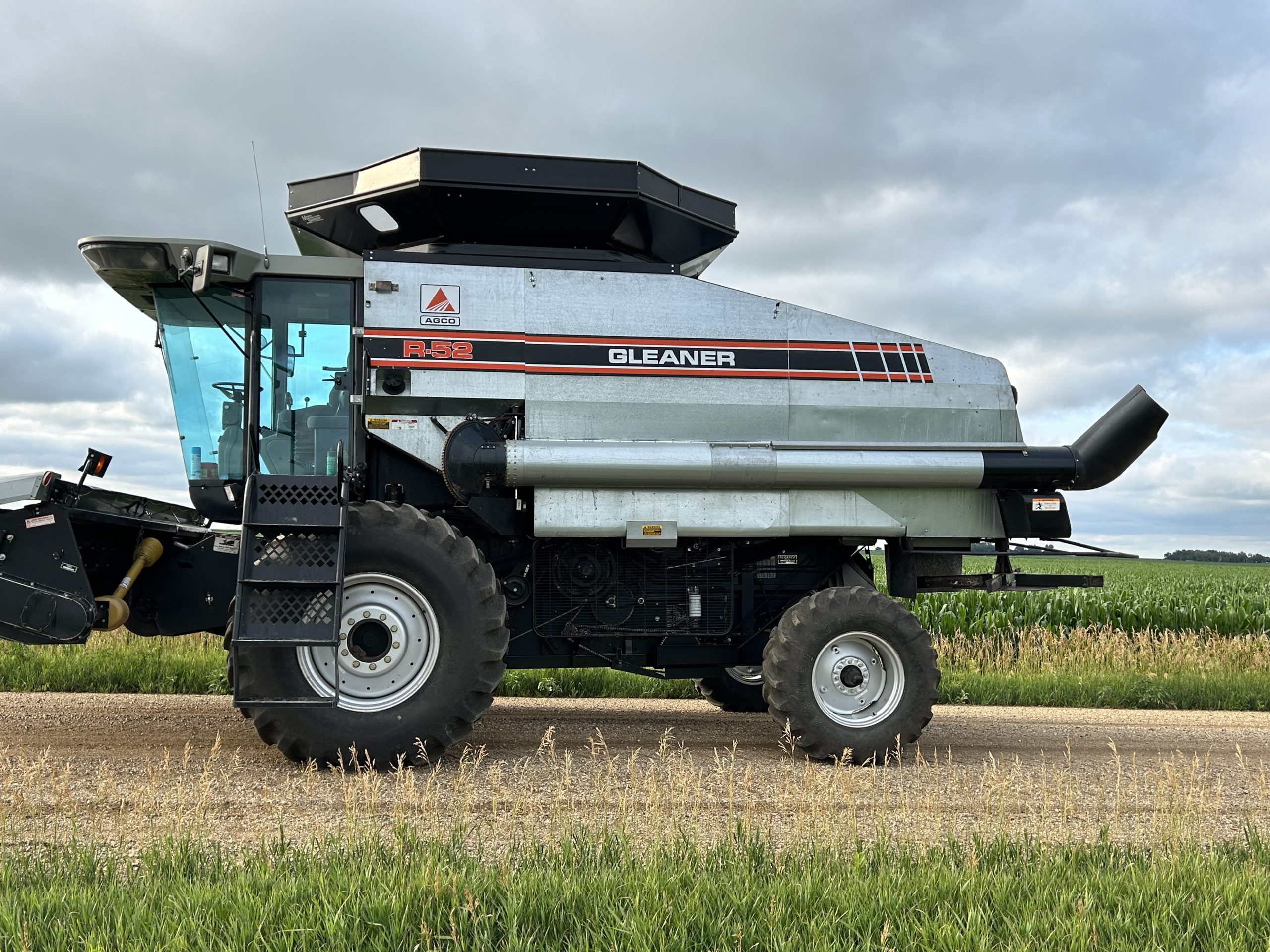 Combine/heads: Gleaner R52, 24.5-32 tires, spreader, grain tank ext., 3,749/2,622 hrs., Deutz engine; Agco 6RN corn head; Agco 20’ bean head sold with 25’ cart; F2 Gleaner combine, 1,923/1,285 hrs., runs, spreader; 15’ bean head.