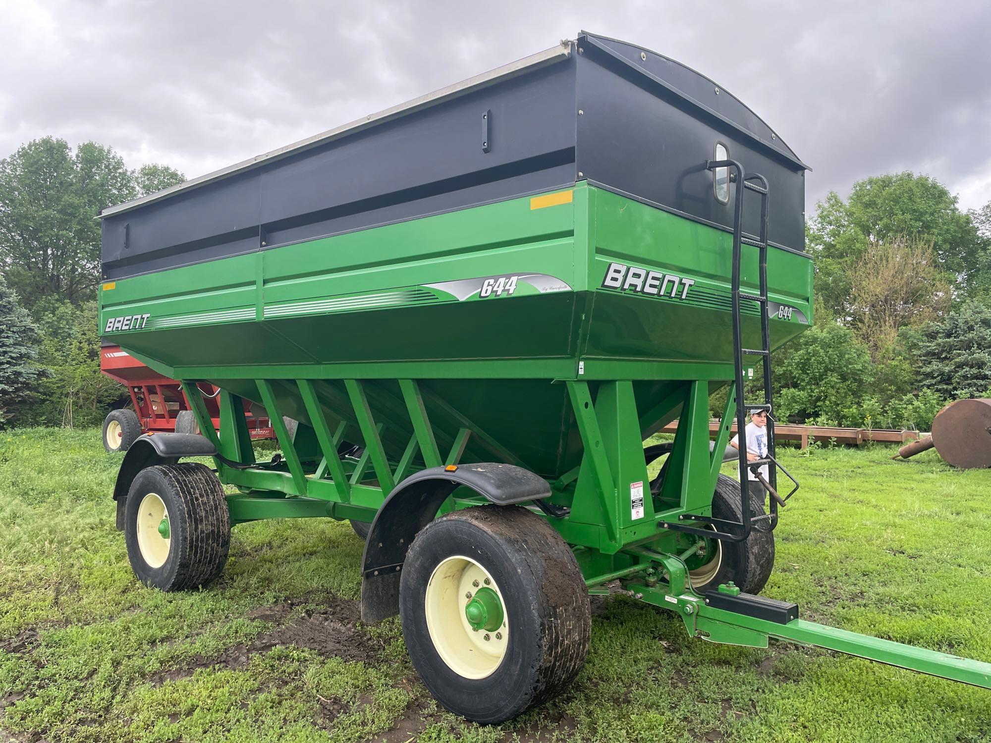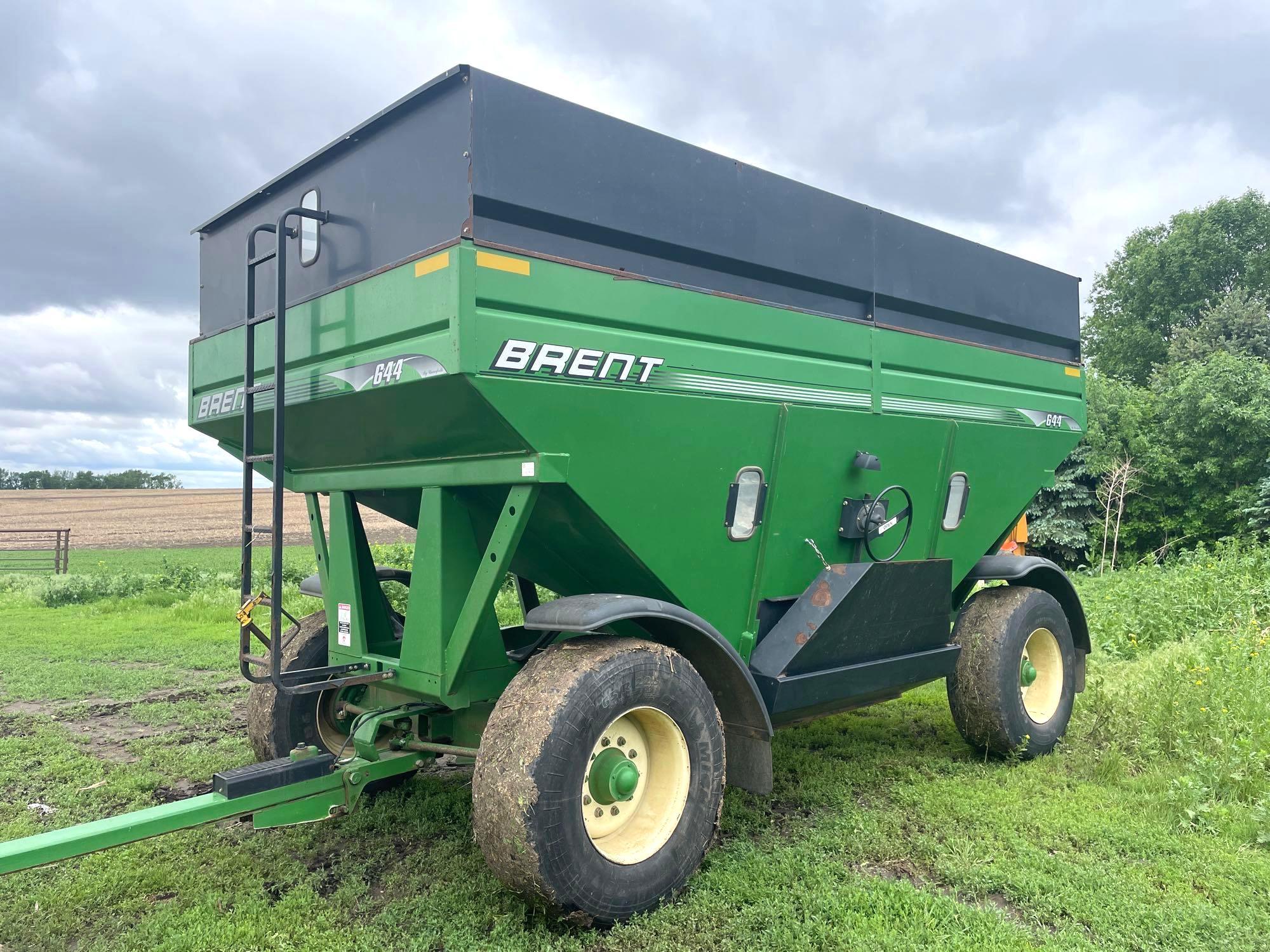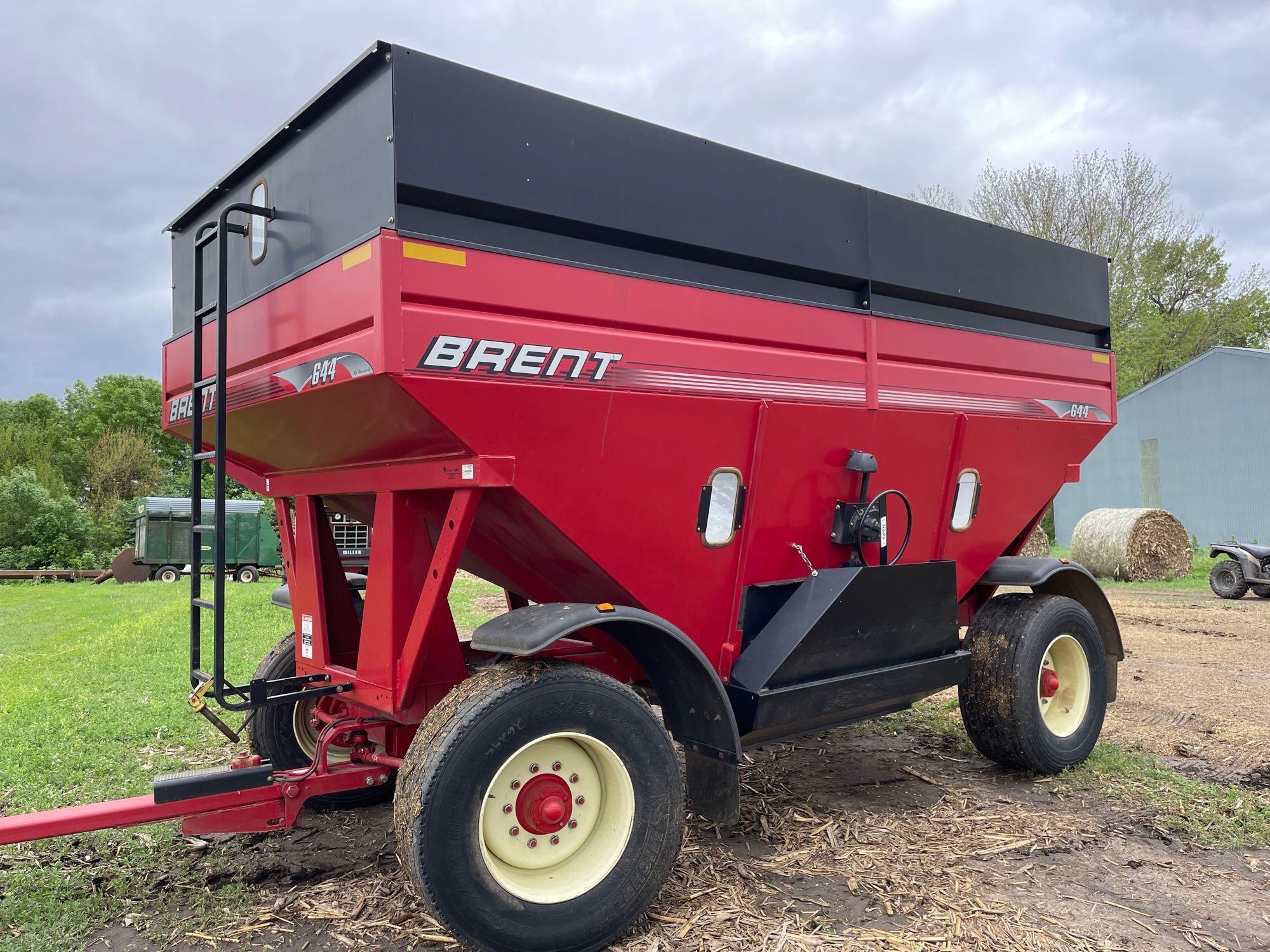 Gravity Wagons: 3—Brent 644 Gravity Wagons-fenders, front/rear brakes, 1 has a roll tarp, 2 green and 1 red: Demco 365bu Gravity Wagon-12 ton gear, 385/65R22.5 tires, lights: Demco 325bu Gravity Wagon-12.5L-16 tires: