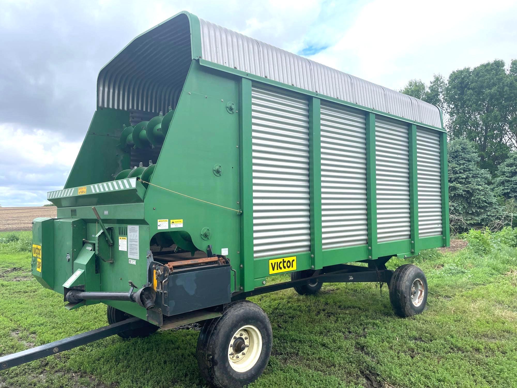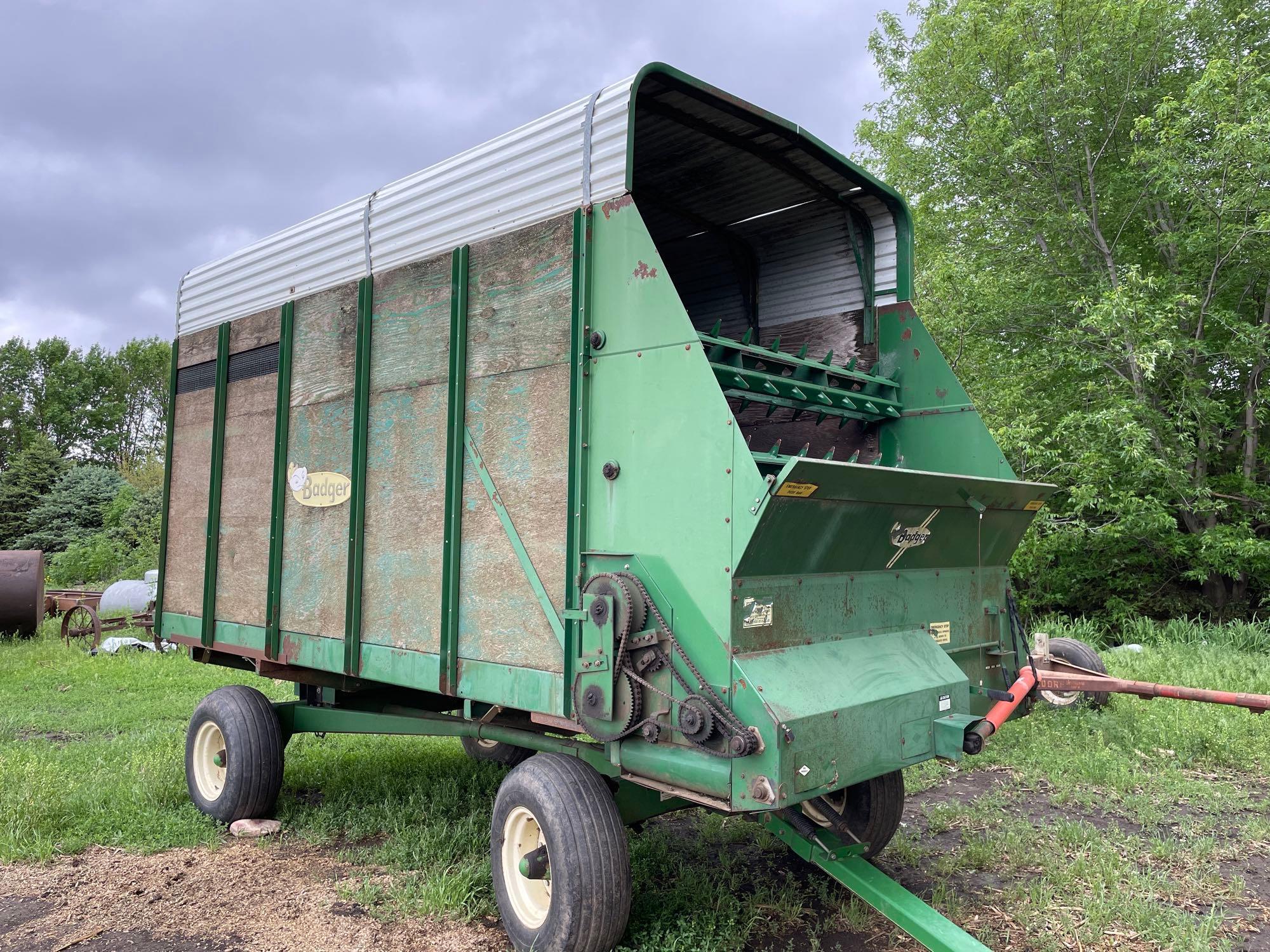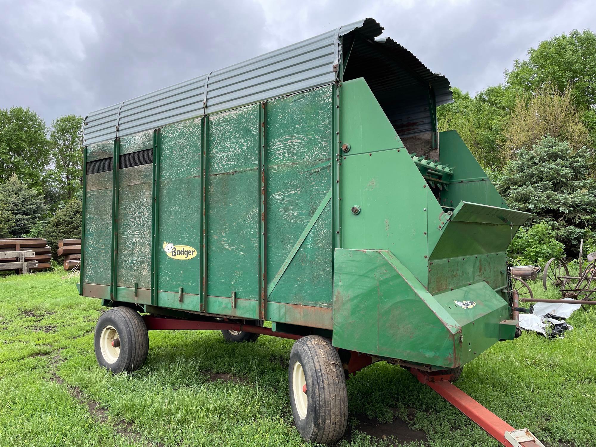 Silage Wagons: 2—Victor Model 20F 18ft Front Unload Silage Wagons—16ft wagon, 2ft unload auger, 18ft total, 12 ton gear, 540 pto, wood floor, roofs: 2—Badger 16ft front unload silage wagons—8 bolt 12 ton Demco gear, 12.5L-16 tires, roofs, 540 pto: 12ft steel Roorda rear unload silage wagon—6 bolt Westendorf gear: