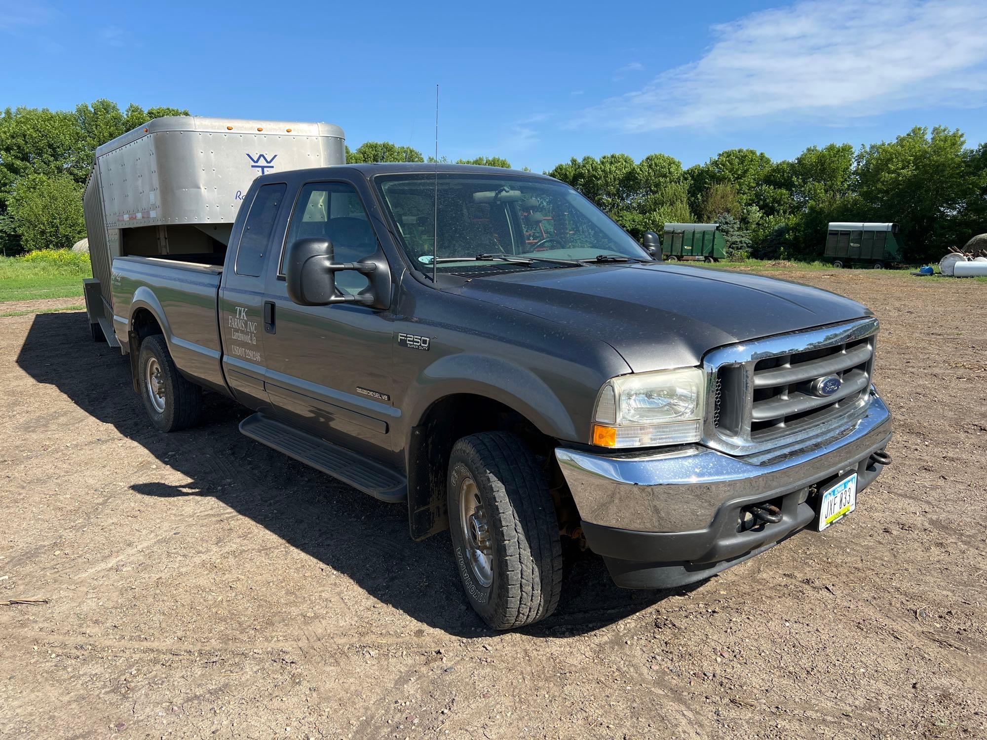 Pickup: 2002 Ford F250 XLT Pickup—VIN-1FTNNX21F52EB26666, shows 154,000 miles, 7.3L powerstroke diesel, cloth interior, 8ft box, ext cab, tonneau cover, fifth wheel hitch, 4×4, salvage title, 265/75R16 tires, spray in bedliner, automatic, radio, heat, a/c: