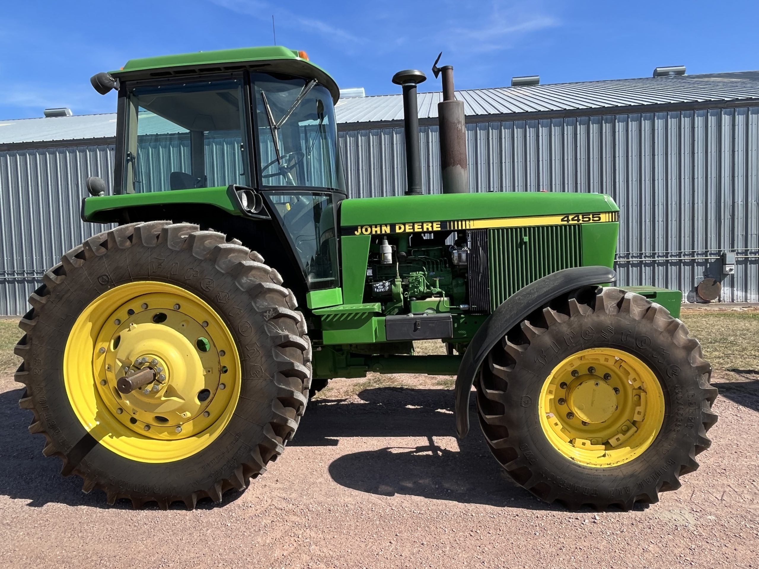 1992 John Deere 4455, SN: RW445523053, MFWD, front fenders, powershift, 18.4-42 rear tires, 16.9-28 front tires, tach shows 6,235 hours, toolbox, 3 hydraulics, 20 front weights, quick hitch, hammer strap.