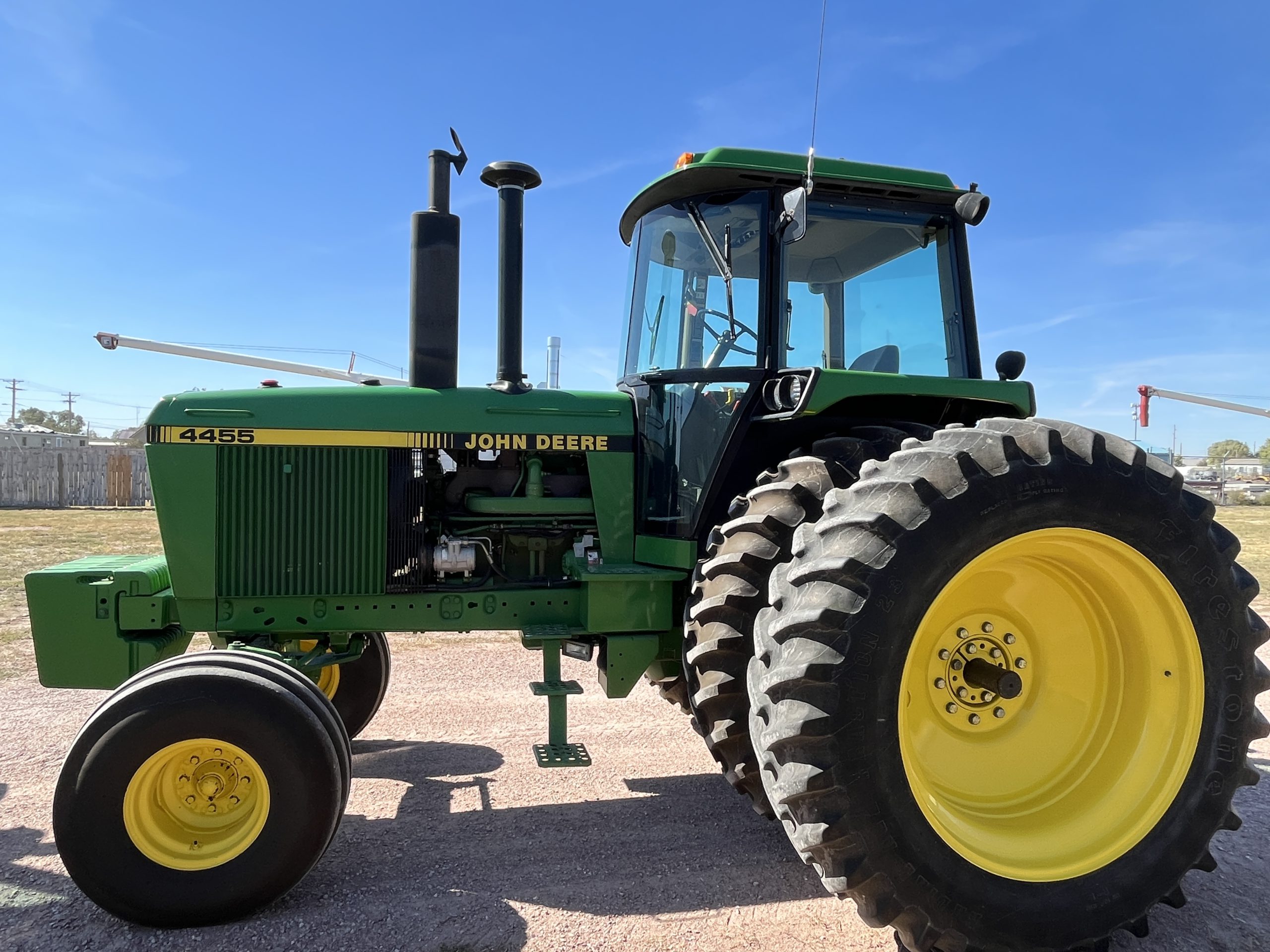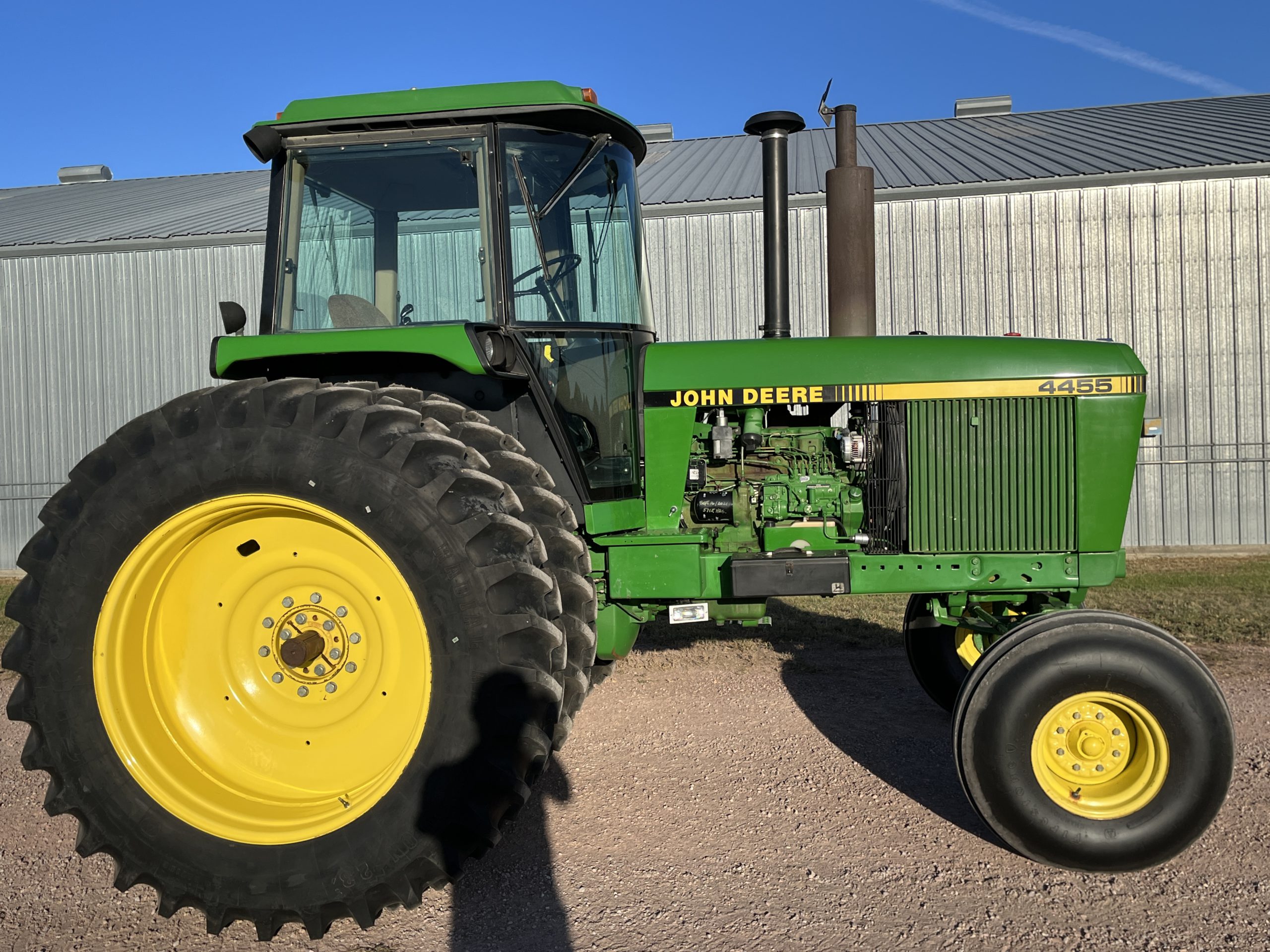 1992 John Deere 4455, SN: RW4455P021169, 2wd, bare back, new cab kit, powershift, new 18.4-42 rear tires, 11.00-16 front tires, duals, 3 hydraulics, toolbox, tach shows 5,718 hours, 450 lb. rear weights, long axles, side light option, hammer strap.