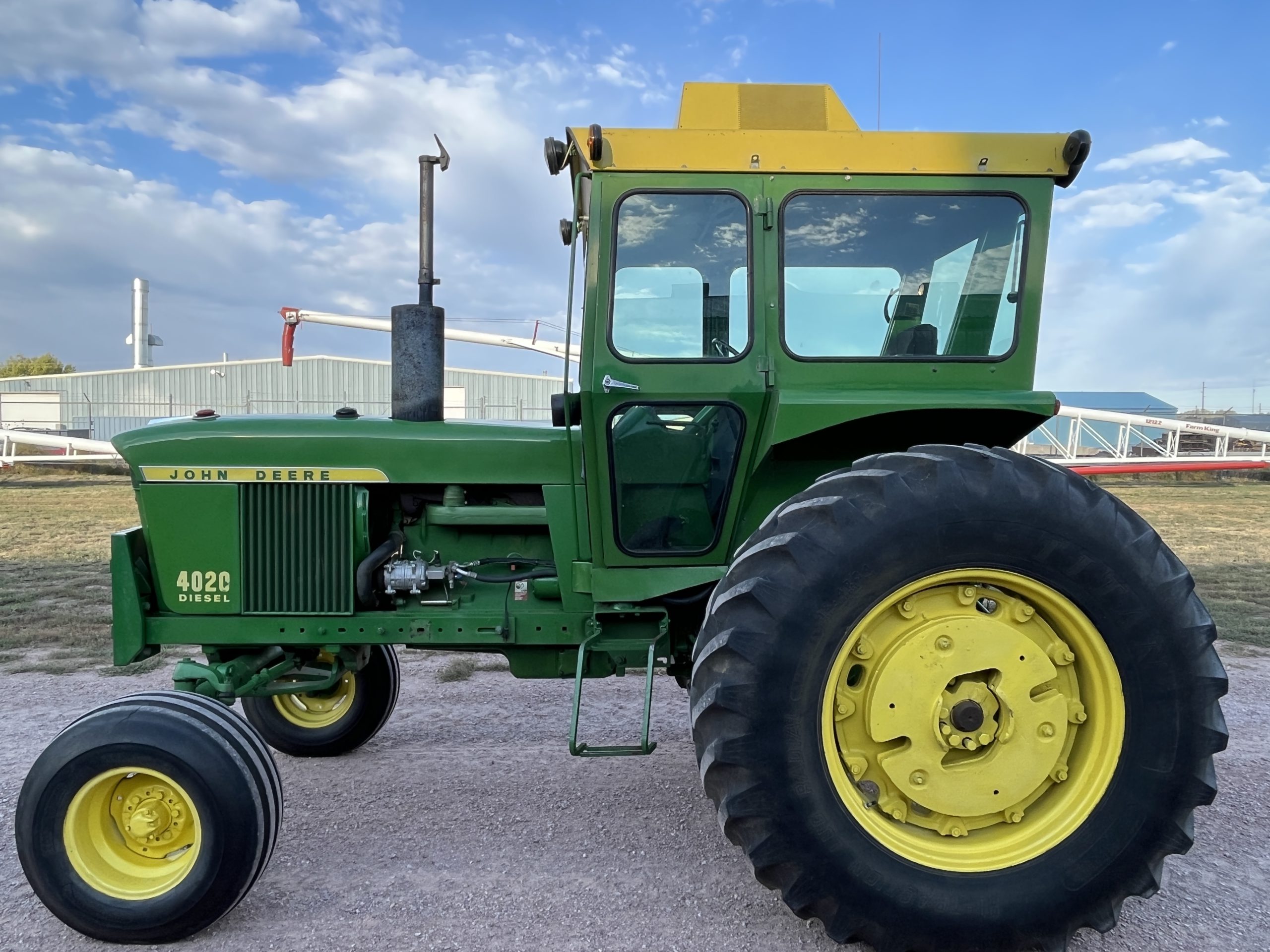 1972 John Deere 4020, SN: T213P267310R, powershift, genuine factory built HFWD, open station, 3 hydraulics, 18.4-34 rear tires, 14.9-24 front tires, toolbox, hydraulic pump disconnect option, exceptional original condition, tach shows 10,109 hours.