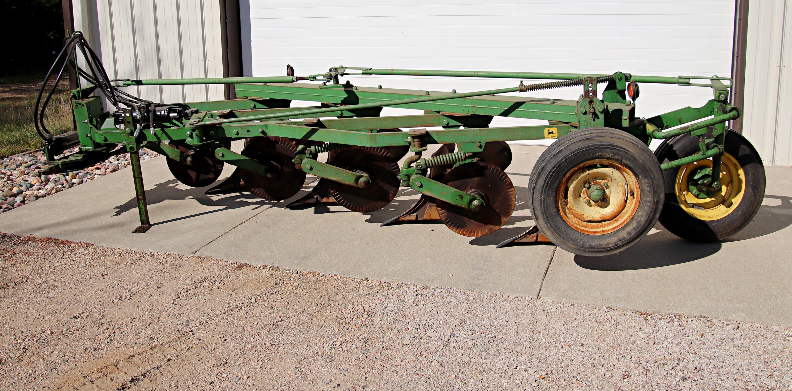 John Deere 145A Plow: #110211, 4-16’’ bottoms, landing hitch, on-land gauge wheel, all new shares, shins and landslides (JD parts), 2 black JD cylinders included, 4-spring coulters, original paint.