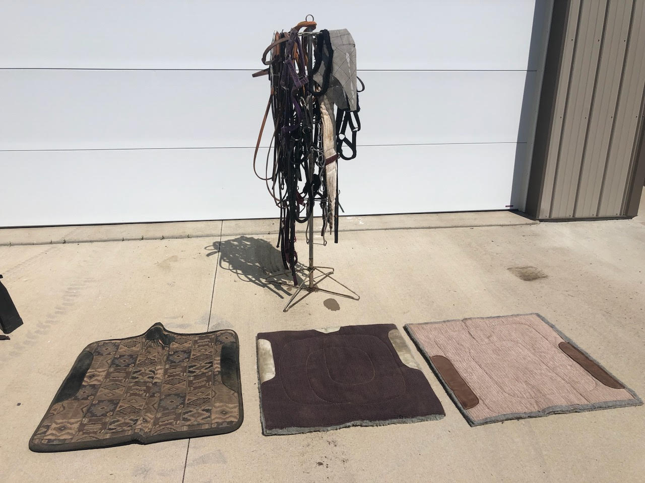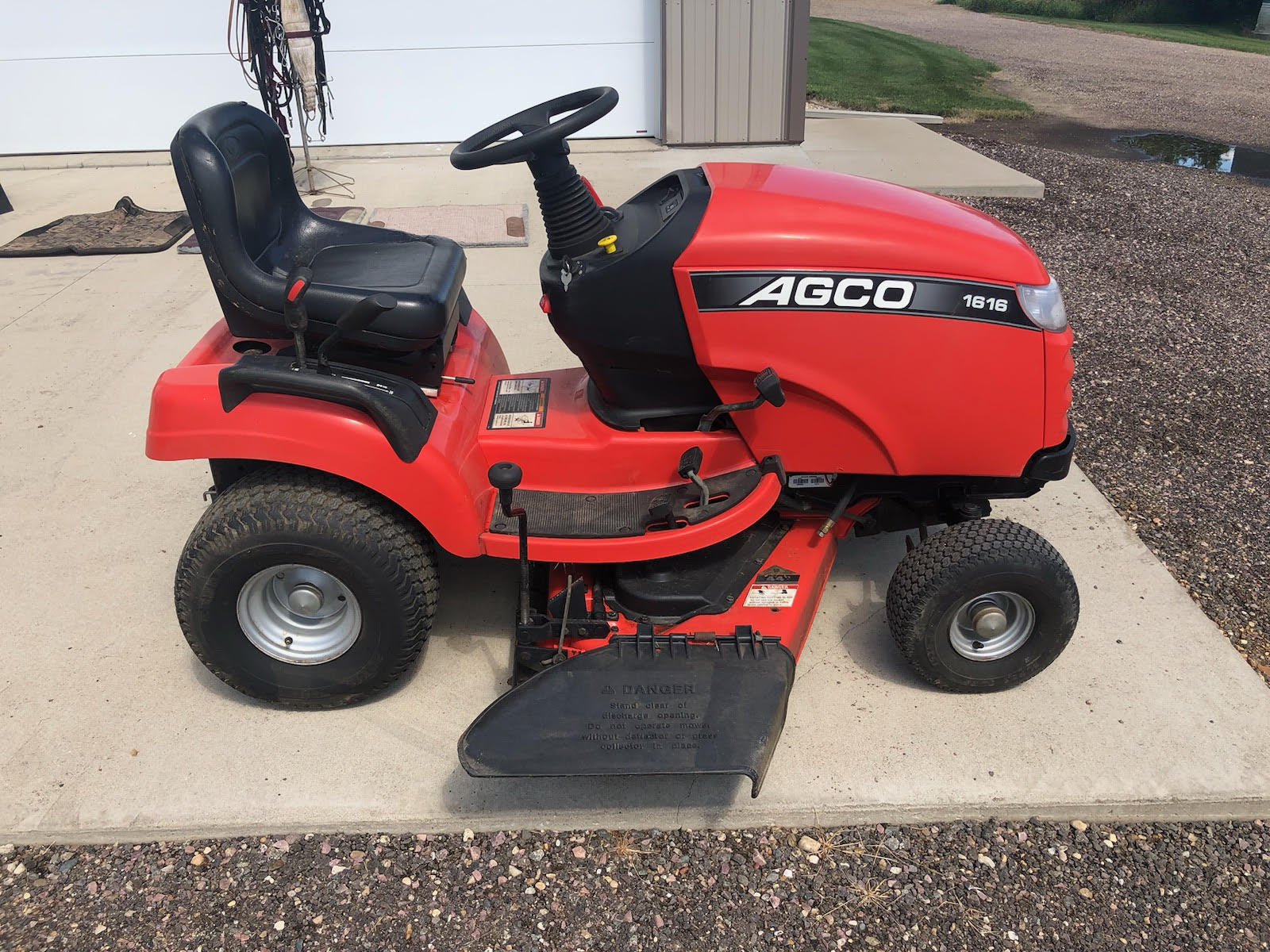 Misc.: Agco 1616 lawn mower, 341 hrs., 16hp, 44″ deck; 3 sets of JD wheel weights, JD Cat 3 QH; JD 9 bolt hubs; JD wheel spacers; heavy duty tow rope; saddles/bridals; misc. tires, misc. tools plus many more items!