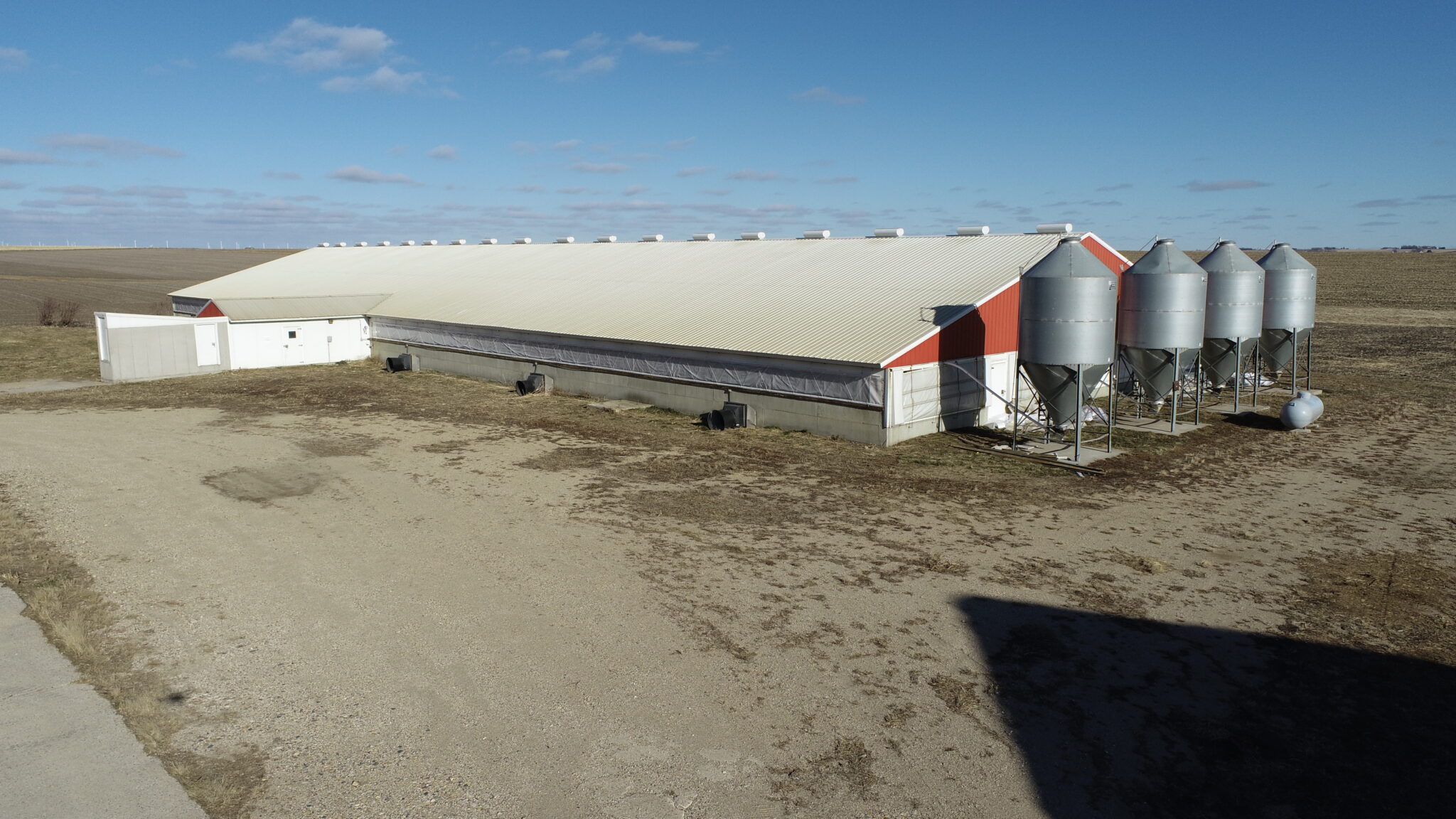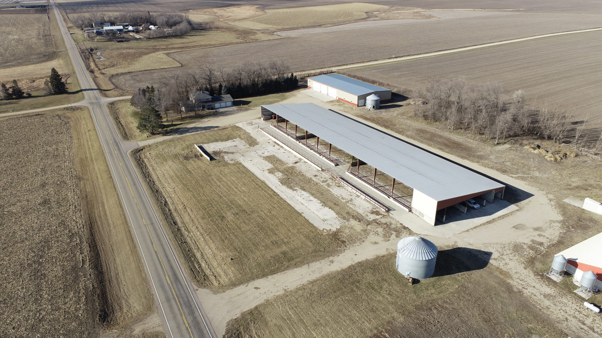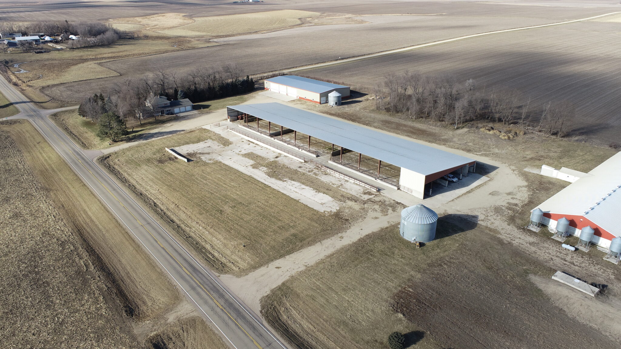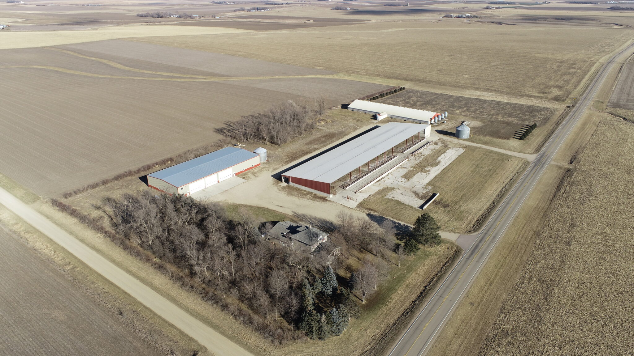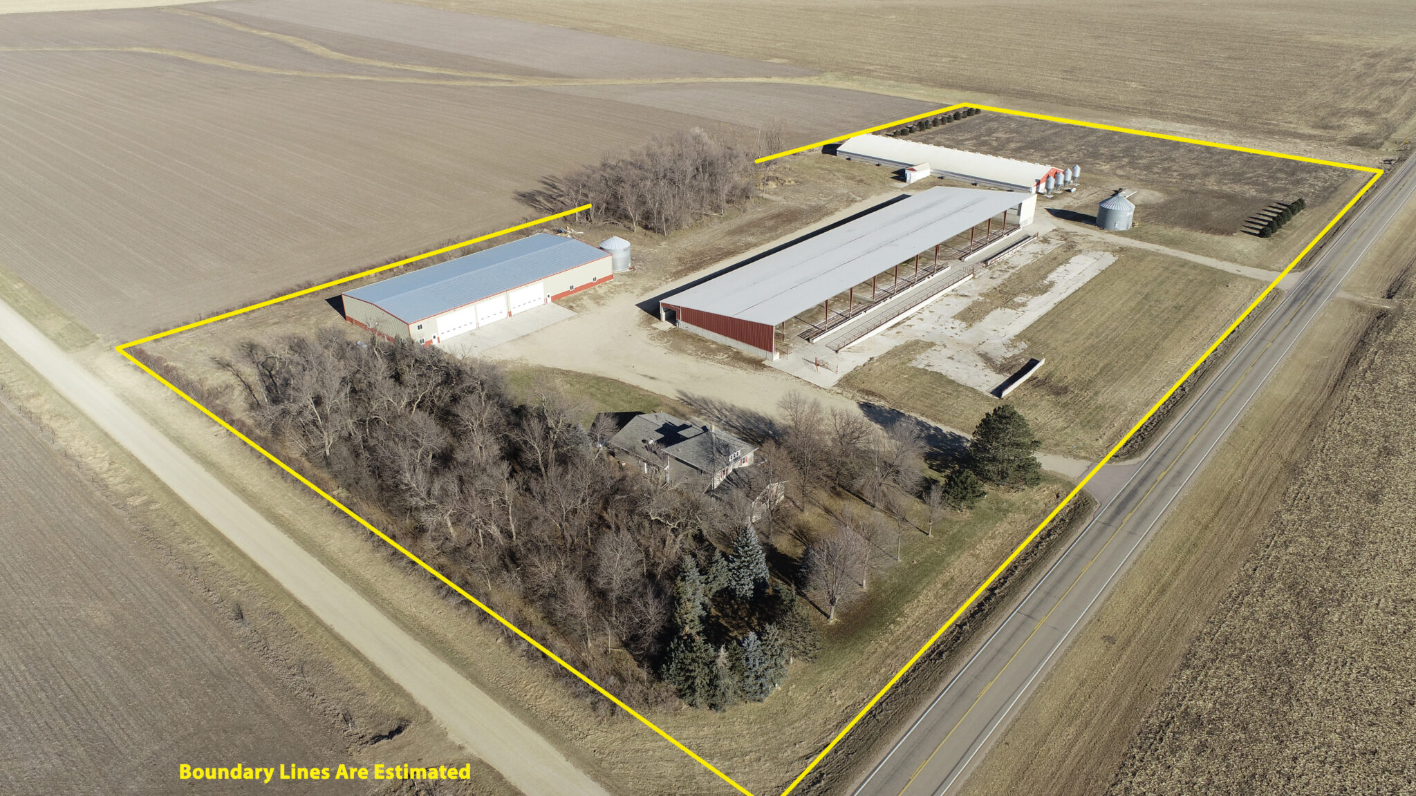 This Acreage Features a 2 Story Home, a 100 x 390 Monoslope Cattle Building With Attached Commodity Bays Built In 2006, A 2400 Head Hog Finisher Built In 2001, A 80 x 180 Machine Shed With Shop Area & Cold Storage Built In 2014 & This Acreage Is Located Adjacent To A Hard Surface Road!