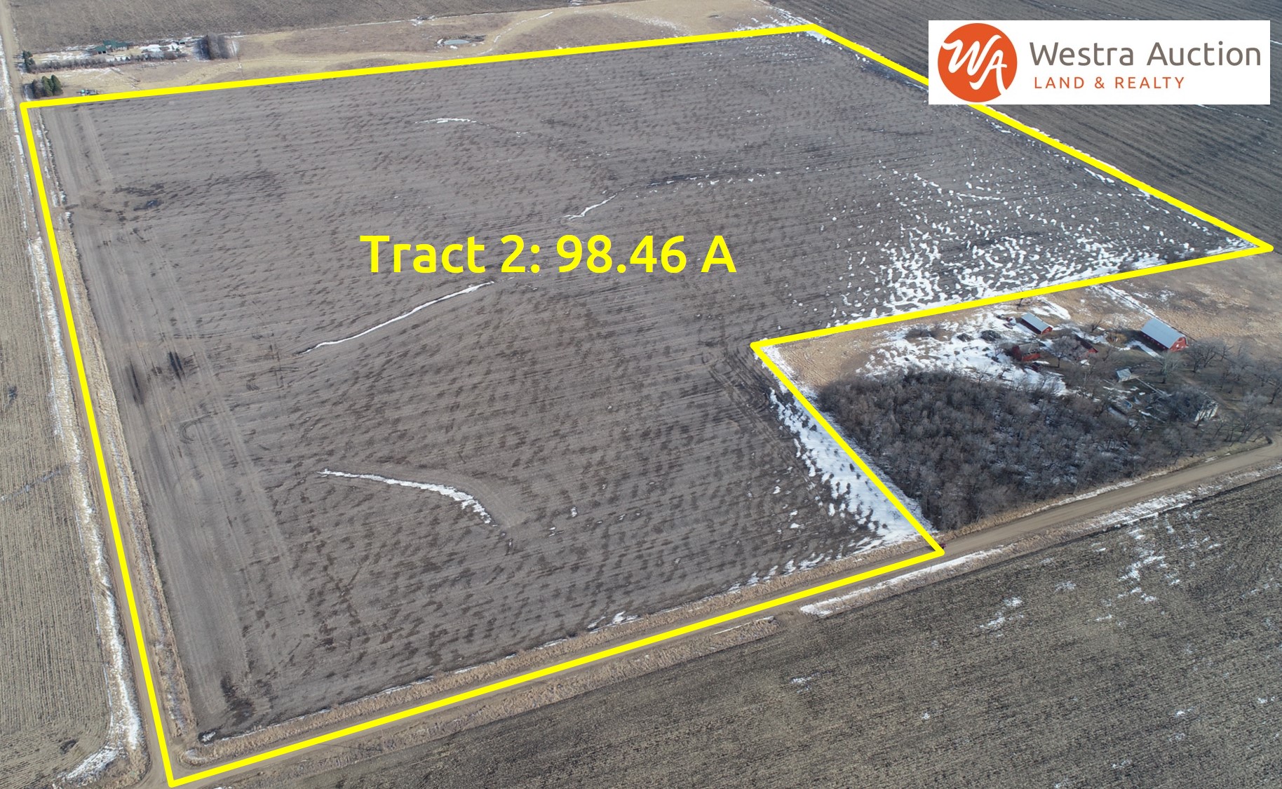 Tract #2 98.46 acres: NW ¼, Except Tract A & Except Tracts 1 & 2 of Winterboer’s Addition, 14-98-52, Turner County, SD. Located in the southeast corner of the intersection of 462nd Ave and 281st St. FSA estimates there is 94.5 acres of cropland with a 44.58 acre corn base, 160 bushel PLC yield and a 45.19 acre soybean base, 45 bushel PLC yield. Soil rating: 0.854. According to Surety/Agridata the land has a productivity rating of 85.4, predominate soil is Wentworth-Chancellor-Wakonda silty clay loam, 0 to 2 percent slopes. Taxes $2,697.60. Includes 2 housing eligibilities.