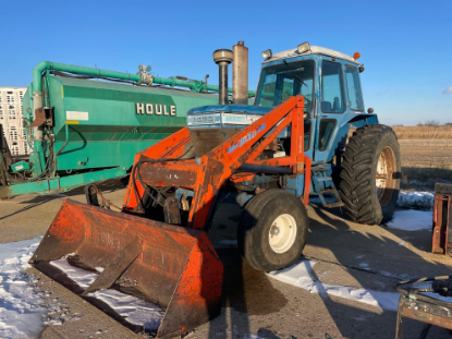 2WD Tractors: Ford 9700 Tractor w/ Loader–Shows 1338 hours, Dual 3100 loader, 11.00-16 front tires, 18.4-38 rear tires, 3pt, 1000 pto, 3 remotes, 1 set of rear wheel weights, 8ft bucket, radio