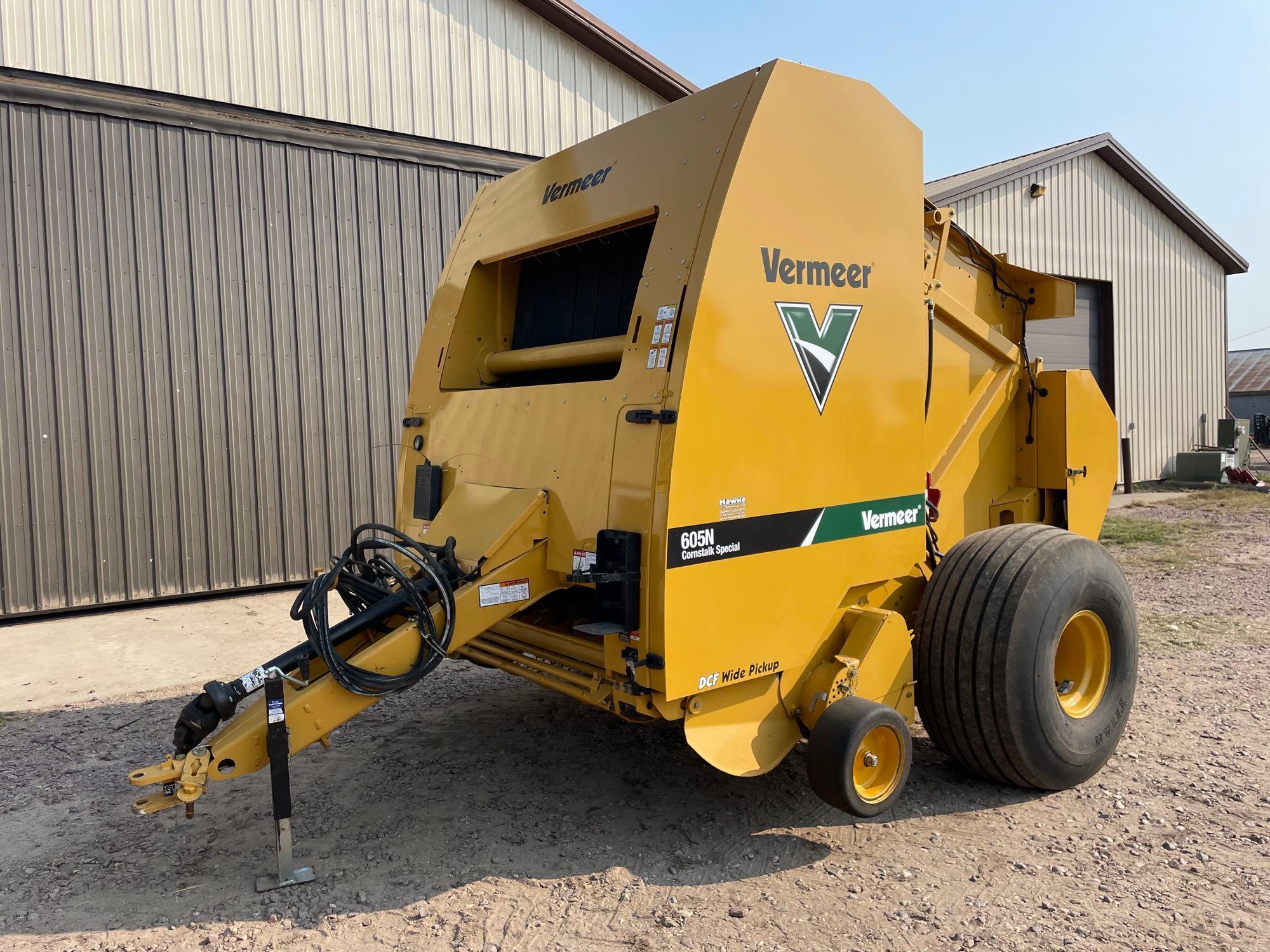 Round Baler: 2018 Vermeer 605N Round Baler–1 Owner—SN:1VRM16146J1007050, DCF wide pickup, scale, moisture sensor, 5,039 total bales baled, bale kicker, 21.5L-16.1 tires, monitor included