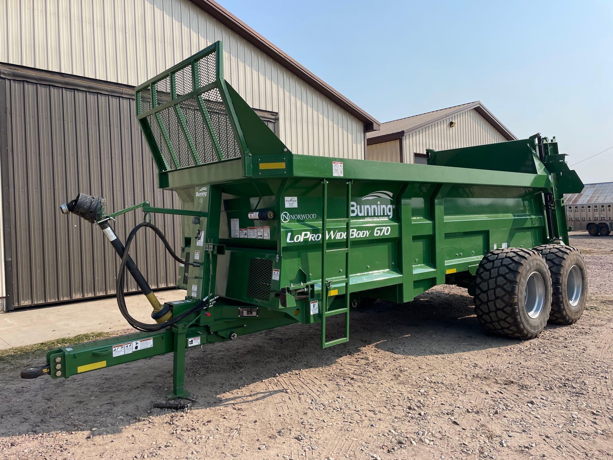 Manure Spreader: 2021 Bunning Lo Pro Wide Body 670 Manure Spreader LIKE NEW–1 Owner—SN:2144N, 600/50R22.5 tires, dual Vertical beaters, poly floor, clevis hitch included also