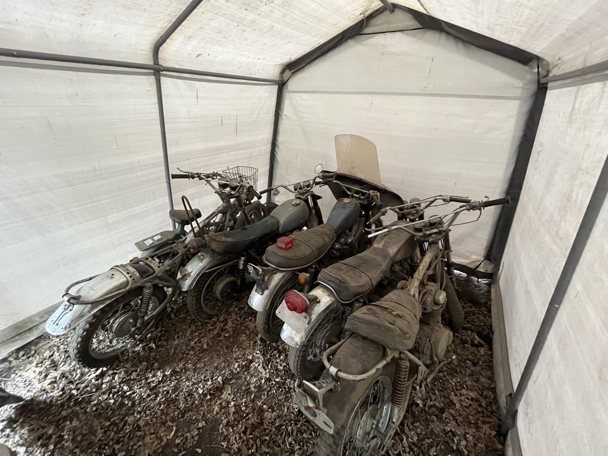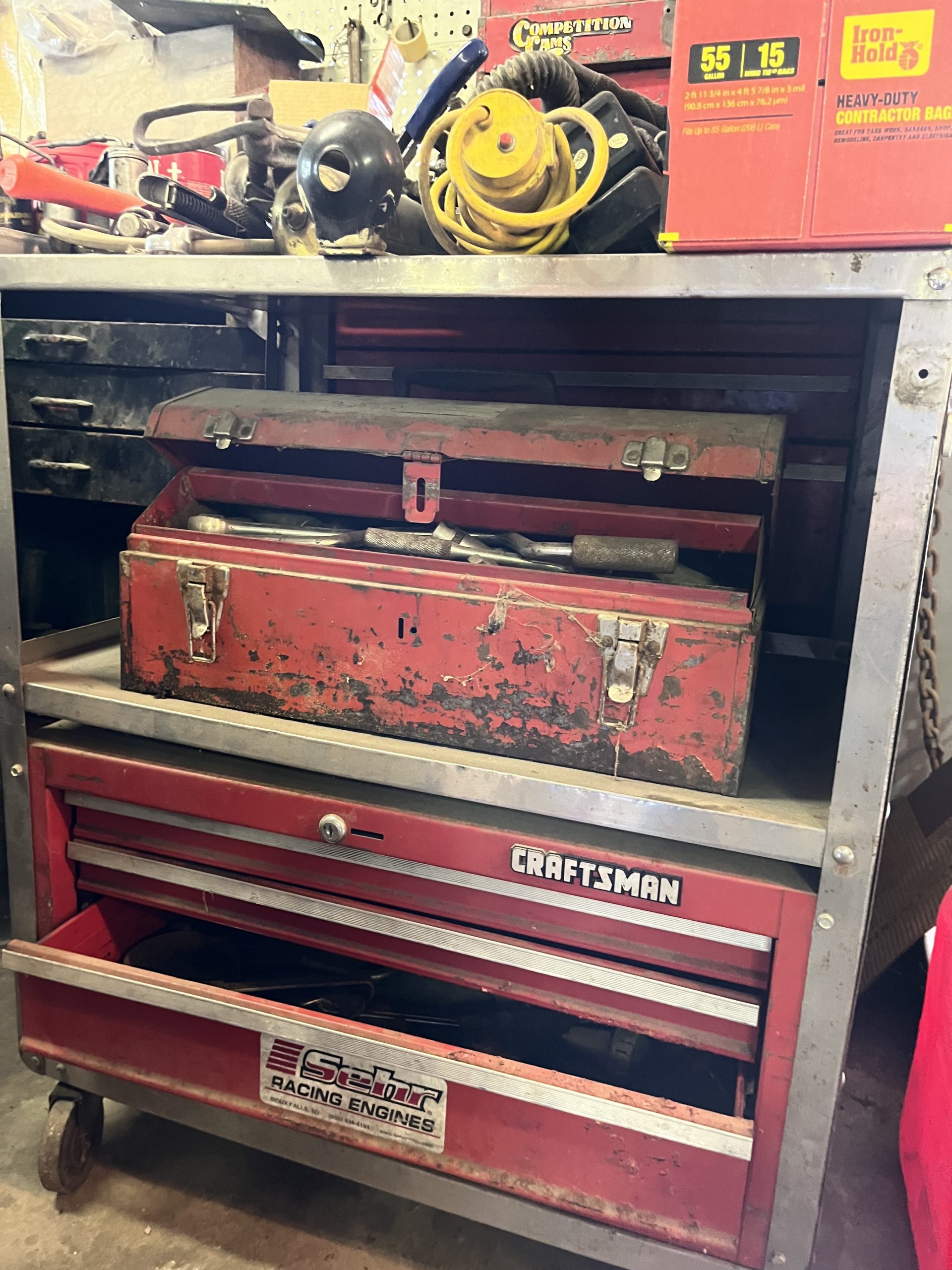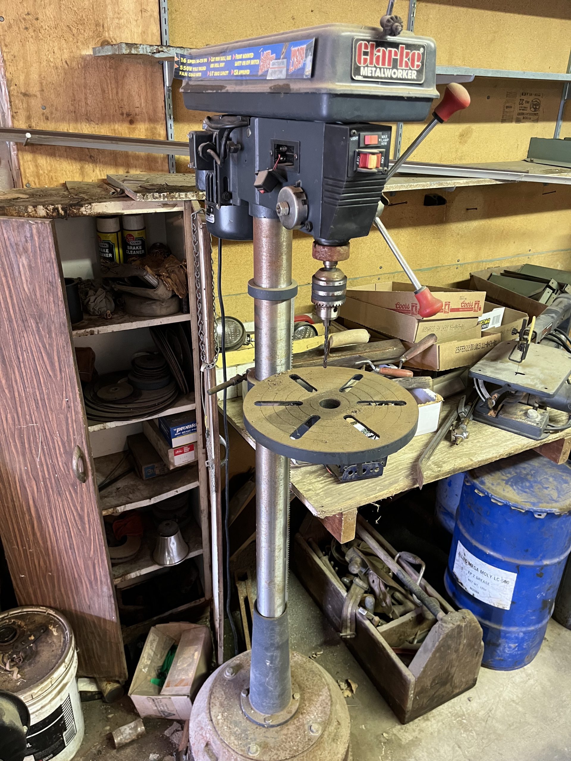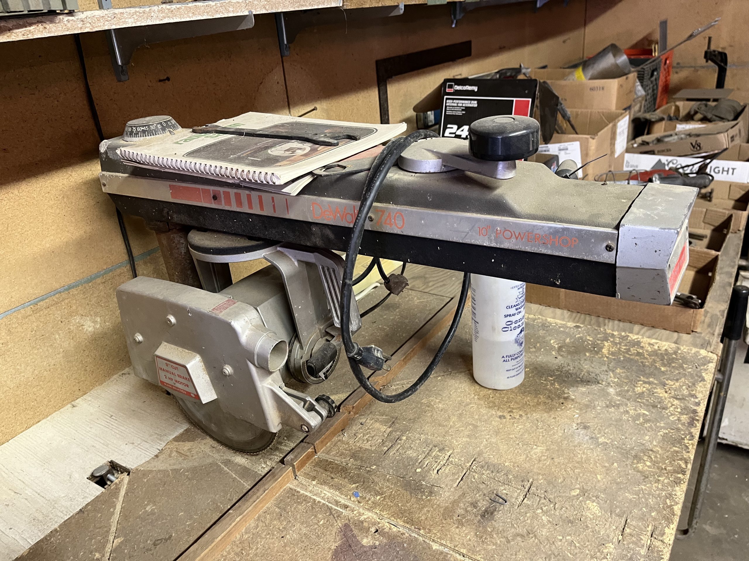 JD Model E 1 ½ hp stationary engine; 2-wheel car dolly; 6 Honda motorcycles, Moto Guzzio moped all not running; Honda Super Sport 550 motorcycle, needs work; Miller Matic 200 electric welder; Coats 2020 SuperStar tire changer/wheel balancer; Clarke drill press; Dewalt 740 power shop radial arm saw; jacks, grinder; vise; Gorilla ladder; Powermate 3750 watt generator; cement tools, Mac rolling tool chest; Matco tool box, cordless drills; battery chargers; engine stand; Walker body jack kit; jigsaws; ramps; ammo boxes; misc rims and tires; bicycles; old wheels, motor parts; telescope; plus more.
