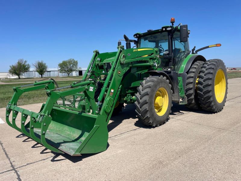 John Deere 6215R MFWD Tractor w/ Loader–SN:1RW6215RCJD032623, shows 3506 actual hours, left hand reverser, radio, heat/ac, 420/90R30 front tires with fenders, 18.4R46 rear tires with duals, 900lbs rear wheel weights, 540 pto, 4 remotes, 3pt, LIKE NEW 2022 John Deere 680R Loader with 8ft bucket with bolt on cutting edge and grapple, buddy seat, IVT transmission, cab suspension, TLS, LED lights, auto steer ready, Tech prep ready