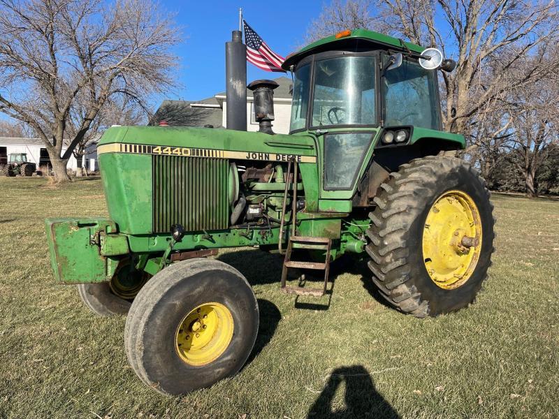 2WD Tractors: 1980 John Deere 4440 Tractor—SN:4440H030666R, shows 7432 hours, 540/1000 pto, 3pt, 2 remotes, Firestone rear tires, 14L-16 front tires, 8 front suitcase weights, quad range, heat works, new rear tires;