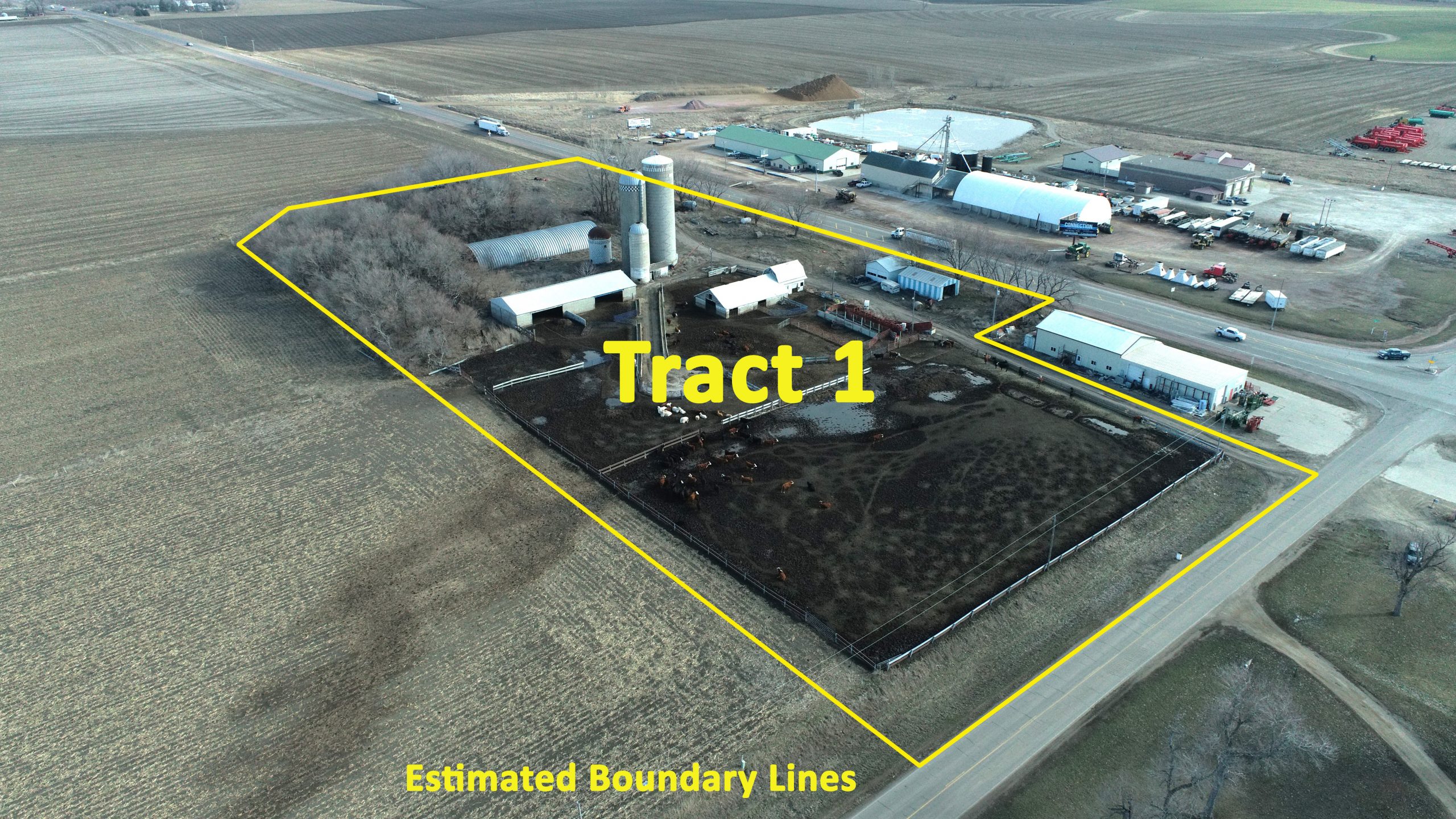 General Description of Tract 1 (Building Site): According to the recent survey, this property contains 7.65+/- gross acres. This property is currently being utilized as a feedlot however offers many other possibilities in addition to its current use! Buyers are responsible to check with Sioux County, IA zoning if buyers potential use will be permitted on this property. This property is located adjacent to US HWY 75 just NW of the intersection of the two major highways of HWY 75 and HWY 18 centrally located between Hull, IA, Sioux Center, IA, Rock Valley, IA & Rock Rapids, IA! This property has frontage along HWY 75 on the East side of the property and frontage on 320th St. on the South side of the property offering two access points to the property! This property has several buildings on the property which include an approx. 44ft x 120ft Quonset shed with concrete floor, a 24 x 40 machine shed, a 40 x 95 cattle shed with concrete walls/floor, an approx. 36 x 58 cattle shed with concrete walls and dirt floor. There is a well on this property not in use. This property is serviced by Mid America for elec and Rock Valley Rural Water for water. This is an outstanding opportunity to purchase a property near the busy intersection of HWY 75 and HWY 18! This type of property in these types of locations are not easy to find! If purchased in conjunction with Tract 2 offers the opportunity to purchase a large 30.61+/- acre tract of property in a prime location! The current tenants on the property own all of the feed bunks, waterers, gates, fencing, T walls, working facilities including loadout, chute, alleys etc., and an approx. 24 x 36 building which is on the property, and all equipment and personal property located on the property. The current tenant’s leases have been terminated by the seller’s attorney. Buyer of the property is responsible to verify with Sioux County, IA zoning that the buyers intended use of the property will be permitted. This property has a permanent ingress/egress access easement on the property which grants ingress/egress access to the adjoining landowner located to the Southeast of the property. This property also will receive from and will grant to the adjoining farmland parcel (Parcel H) a permanent ingress/egress access easement for the access off of HWY 75.
