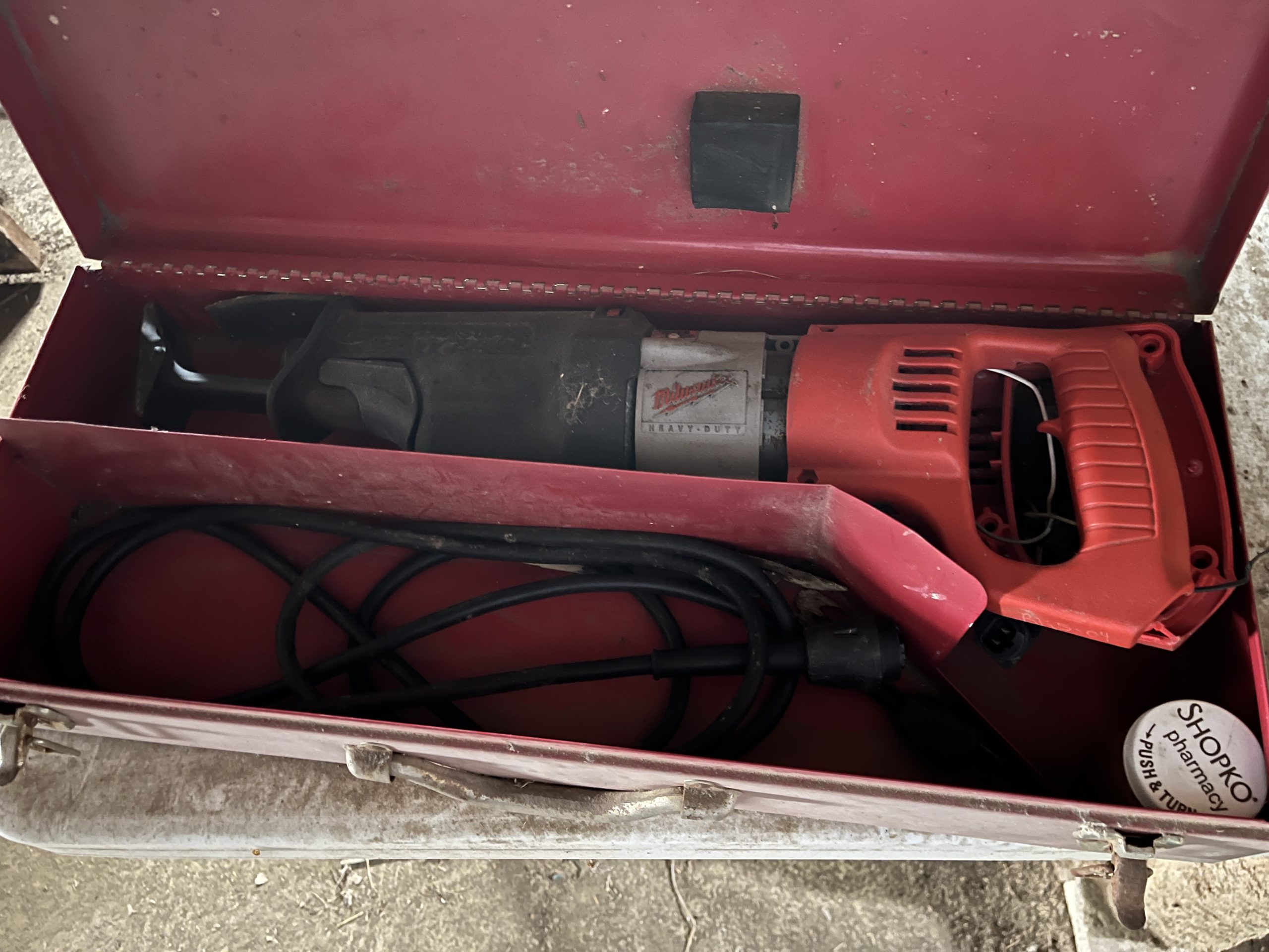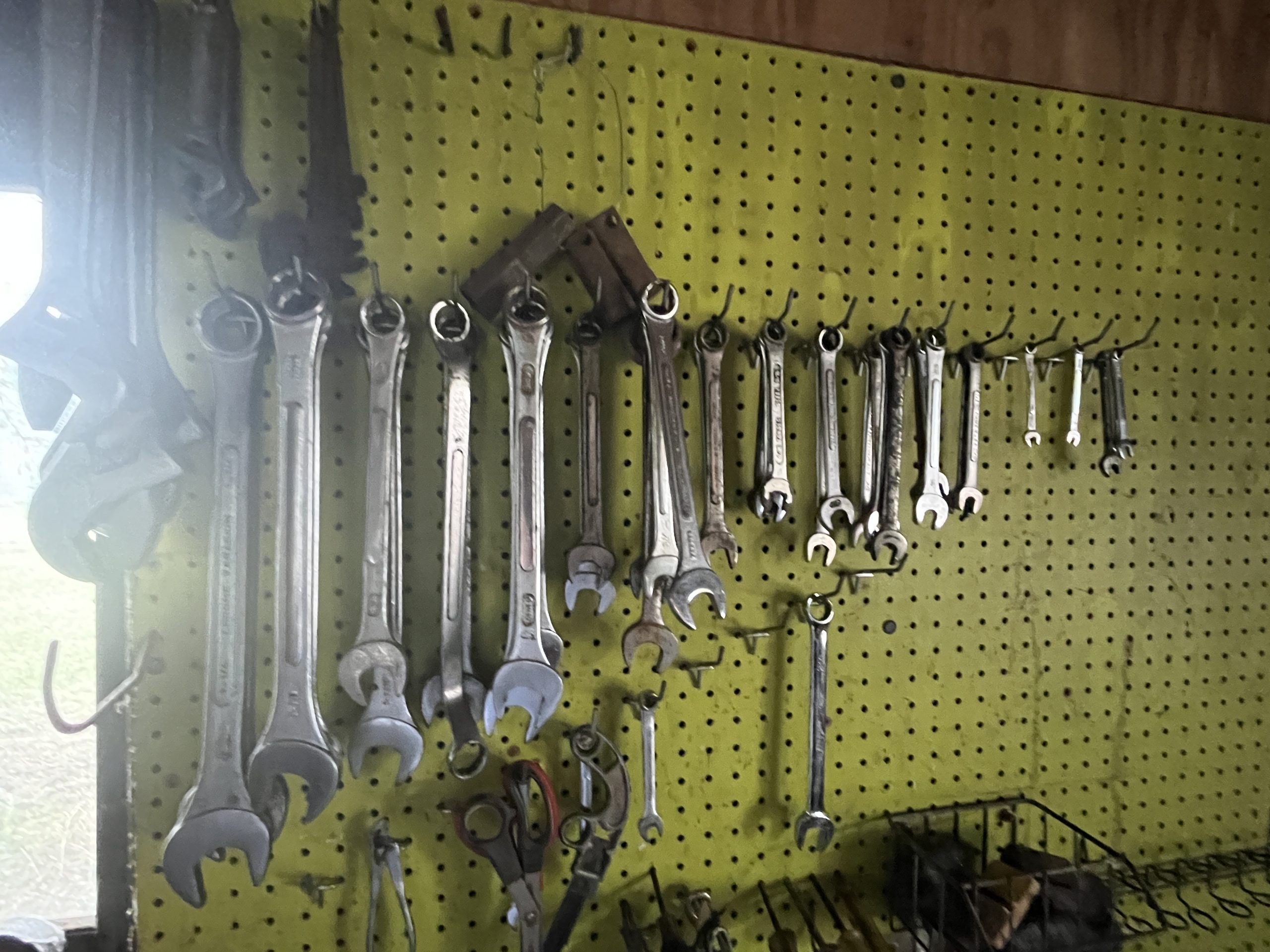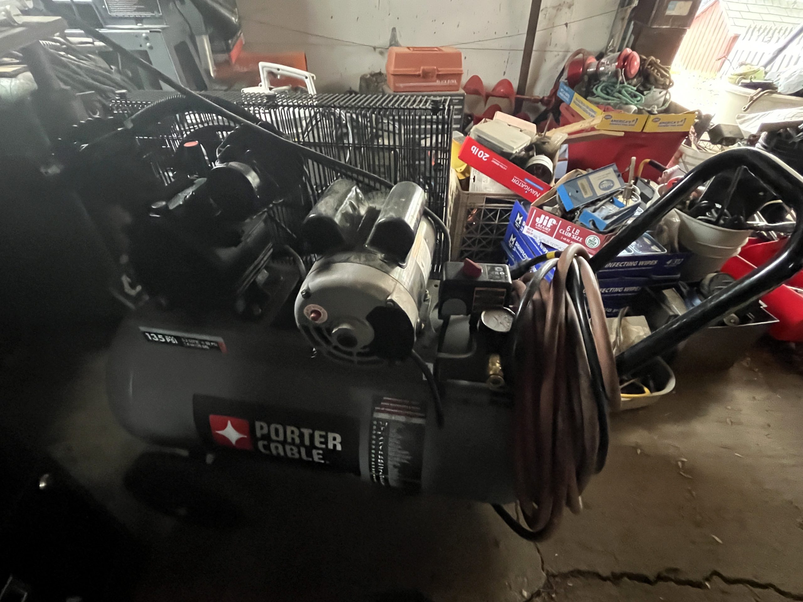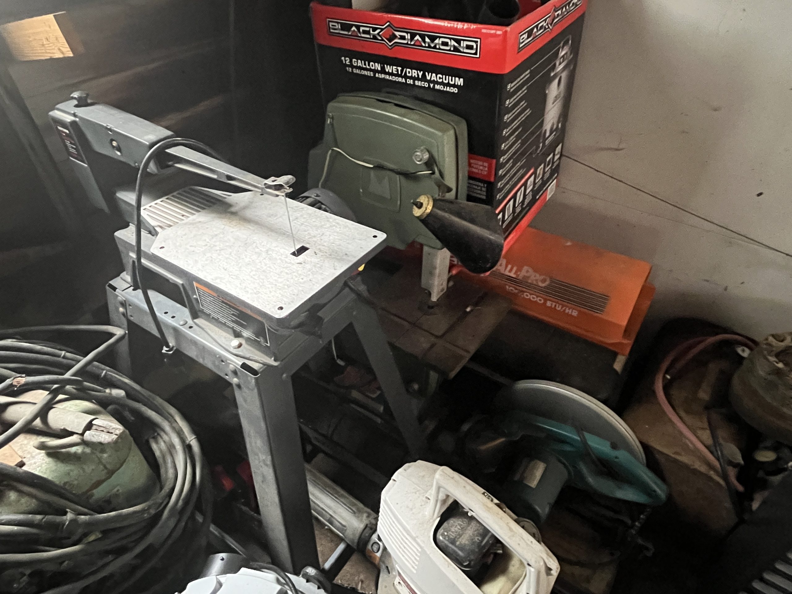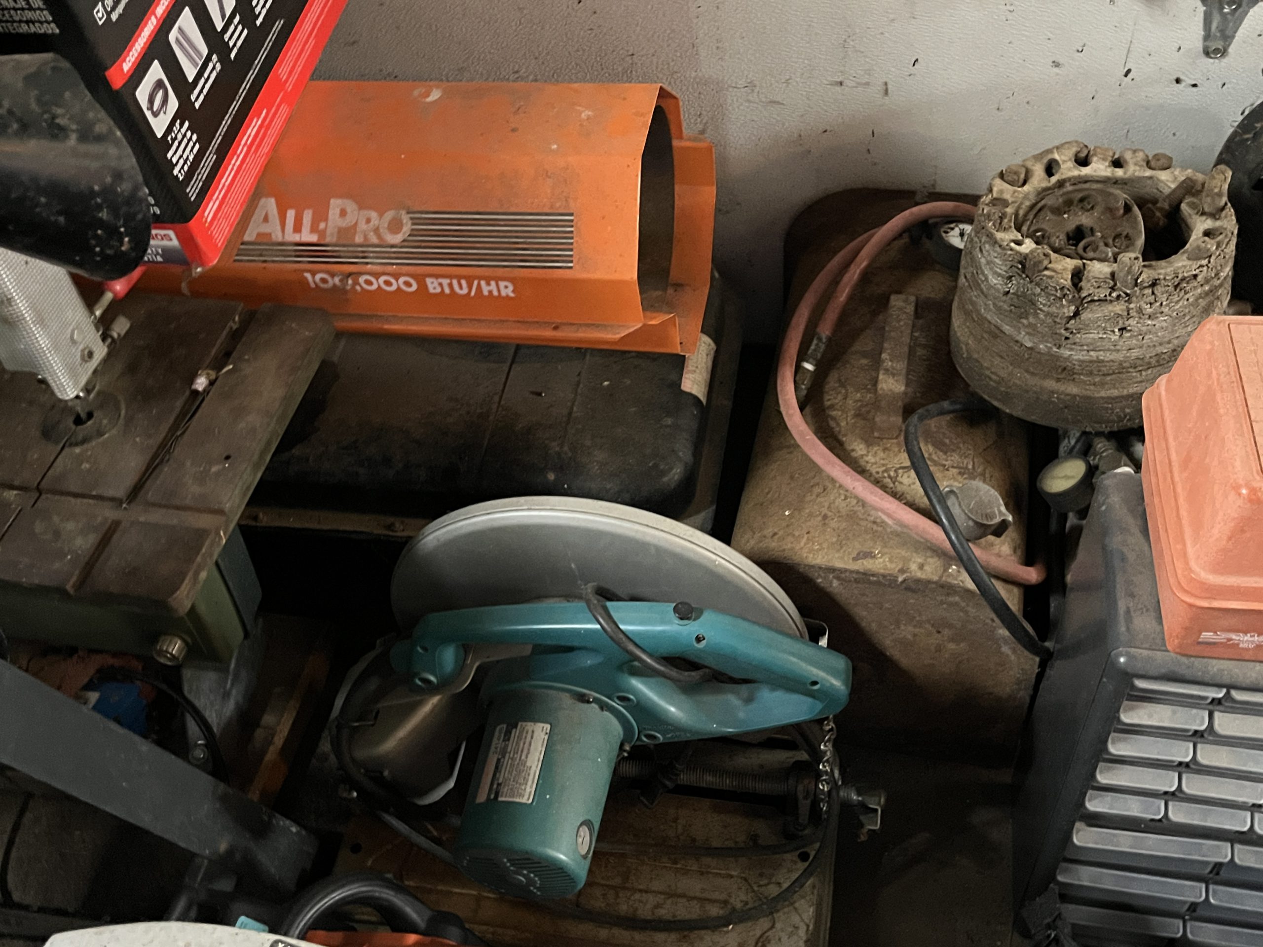 Tools: Welding torch, tanks, cart; 2- Stihl chain saws; Arc welder; 2-Chop saws; Hand tools; 2-Air compressors; 10” table saw; Drill press; 12” planner, Radial arm saw; Scroll saw; Router; Kerosene heater; 2-weed trimmers; shop vac; bench grinder; jacks, battery charger; garden tools; ladders; gas powered ice augers; plus more.