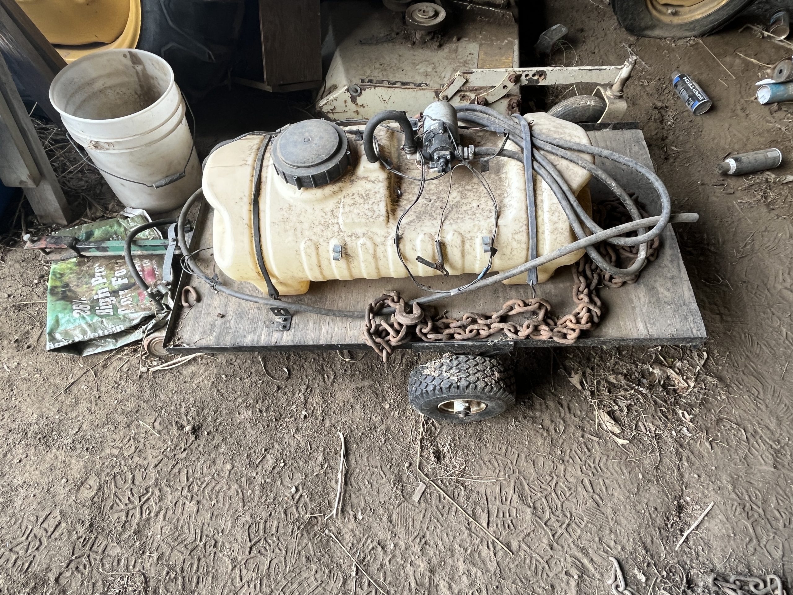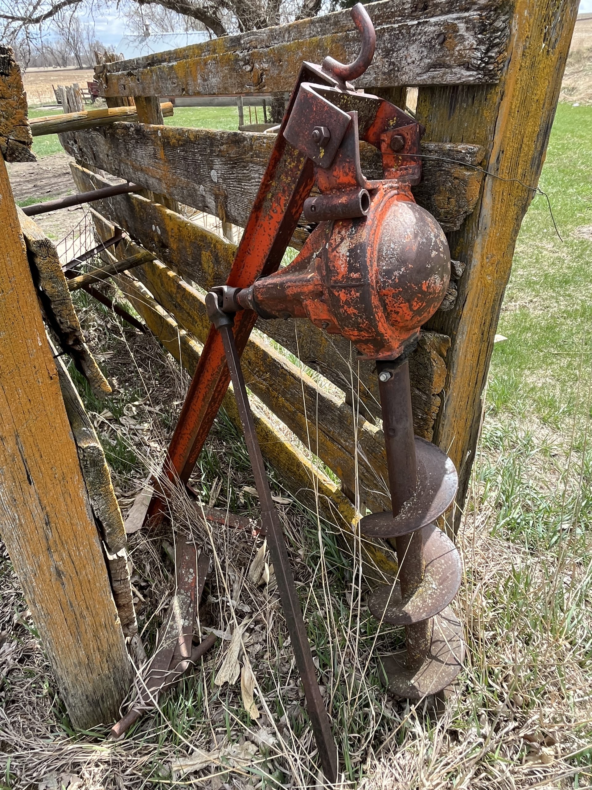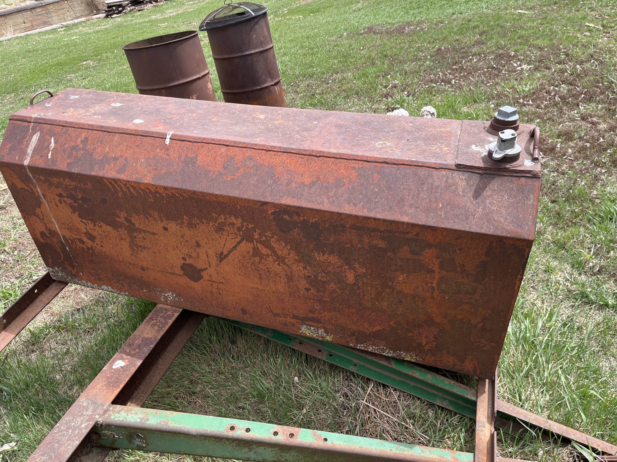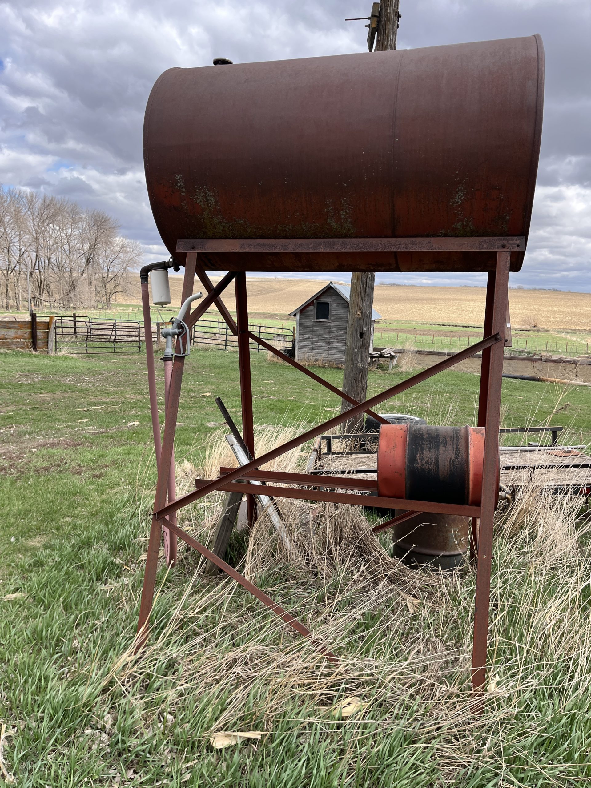 Farm Misc: 250-gal pickup water tank; NIB gas powered post hole digger; Pax hog feeder, good; Pallet racking; Foremost head gate; Dehorning table; 21’ bin sweep; Tractor chains; Diesel & gas fuel tanks, stands; 110-gal diesel transfer tank; transfer pump; log chains; Barb wire; ATV garden disk & sprayer; Wood & steel posts; plus more.