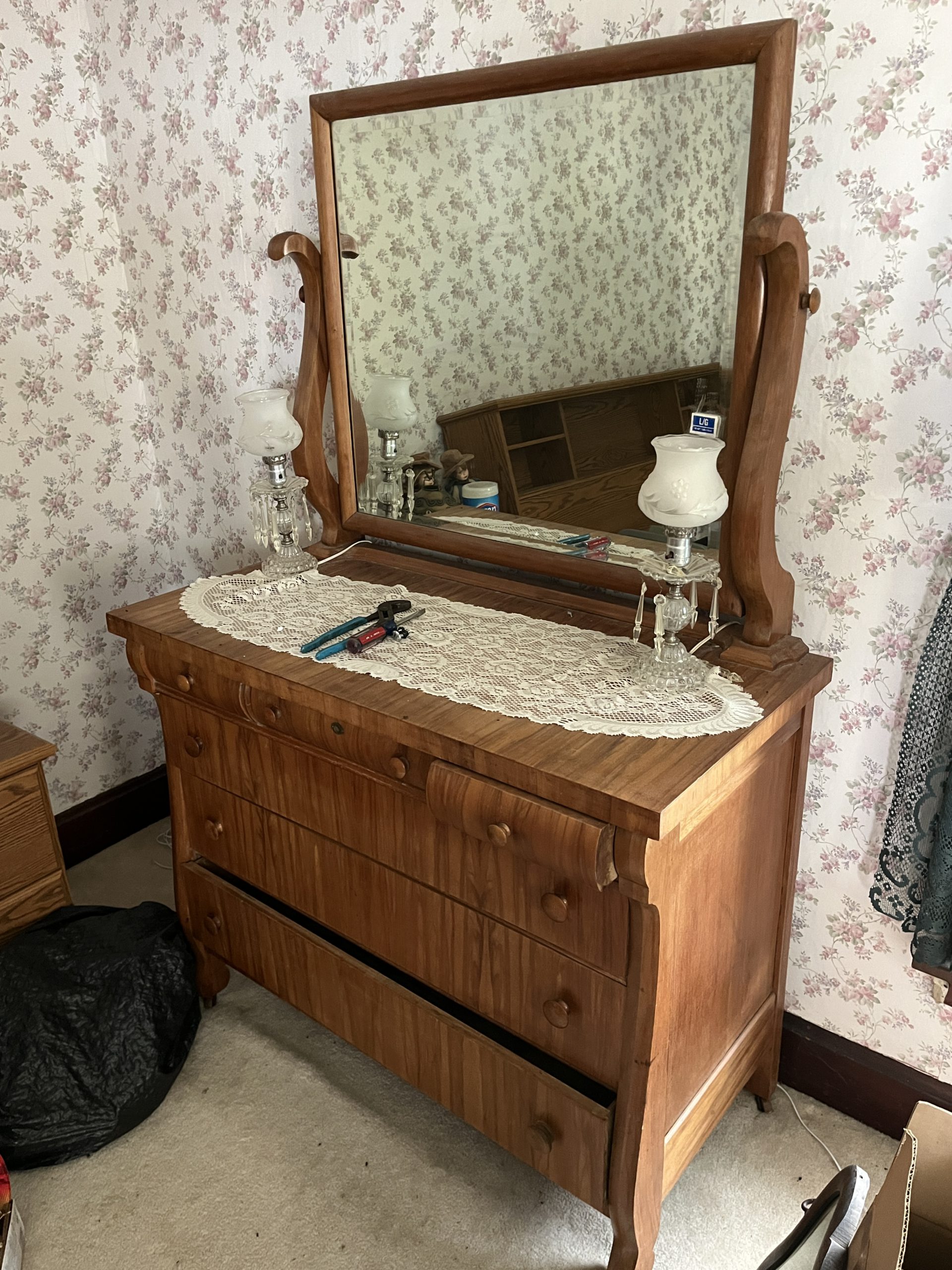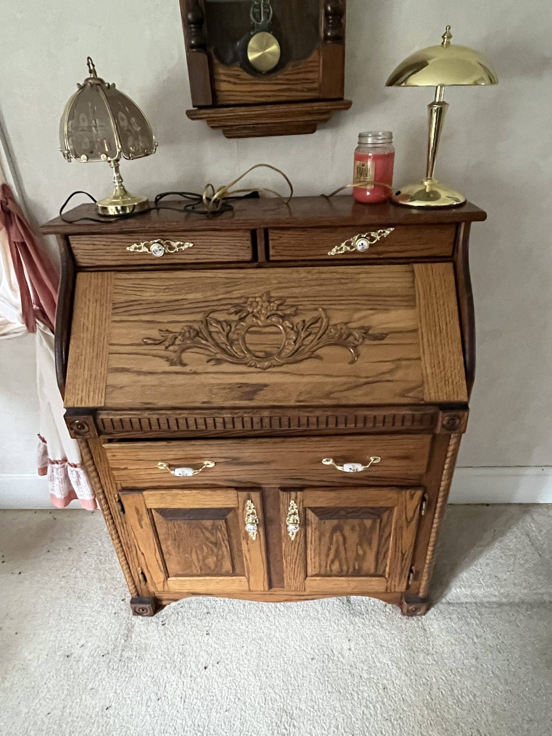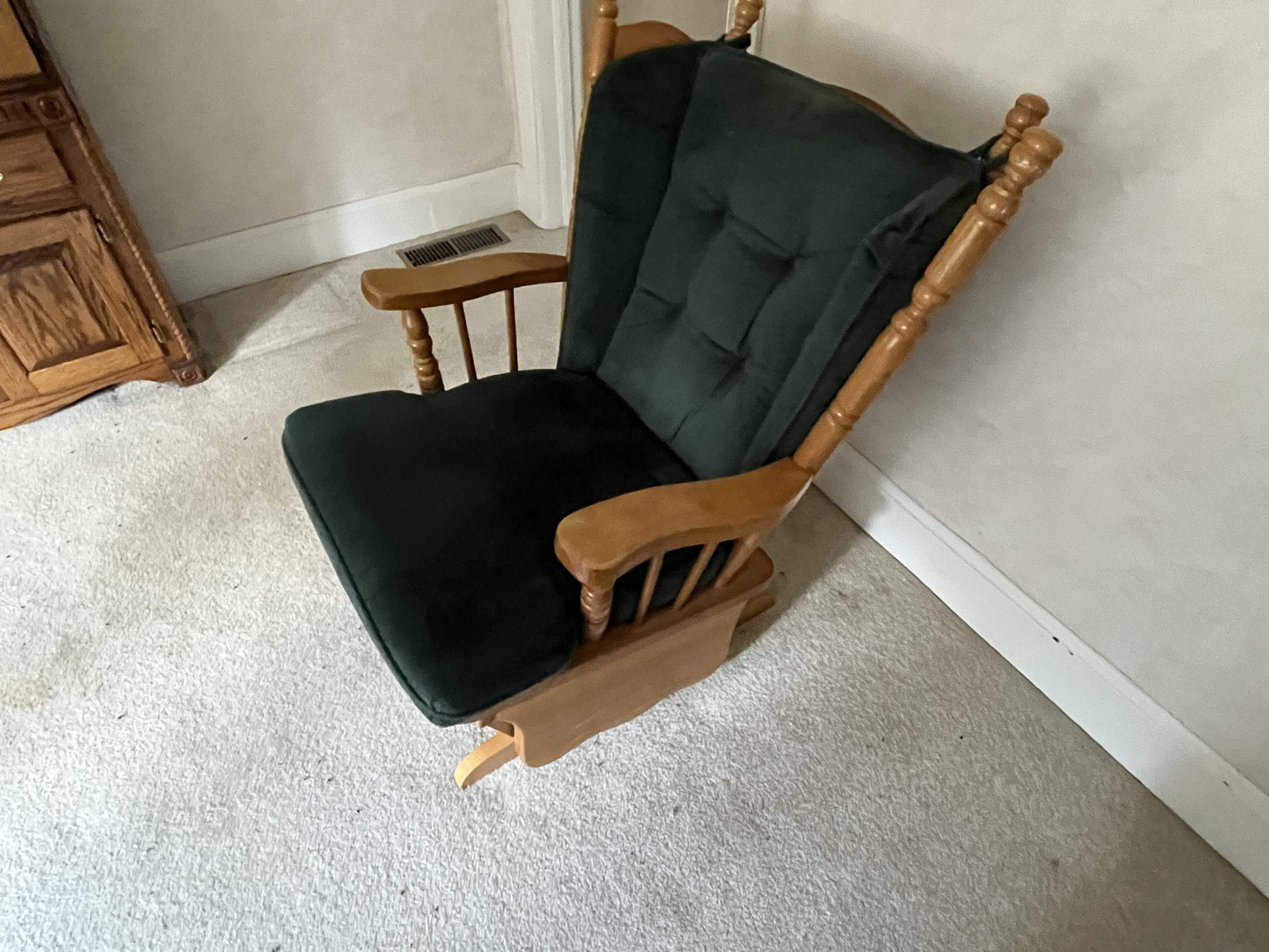 Household: Gas grill; Patio table & chairs; Secretary desk; Bicycles; Cookbooks; Dresser set; Bar stools; China cabinet; Dining room table, 4 chairs; Lamps; Glider rocker; Kitchen wares; Dolls & games; plus more.