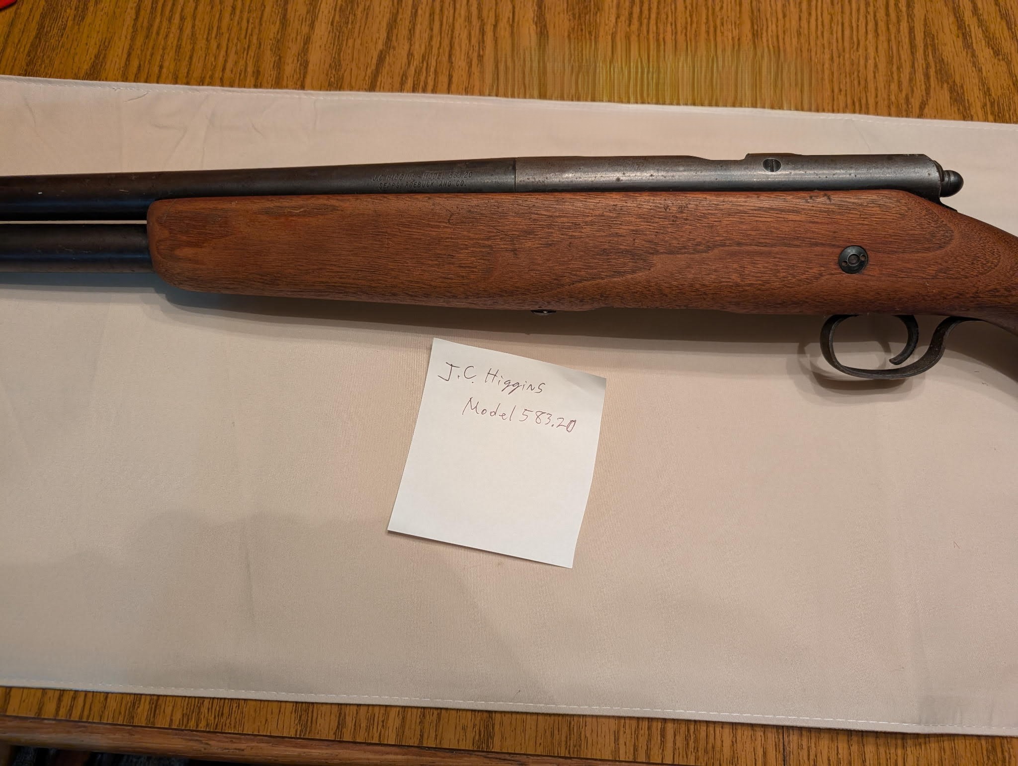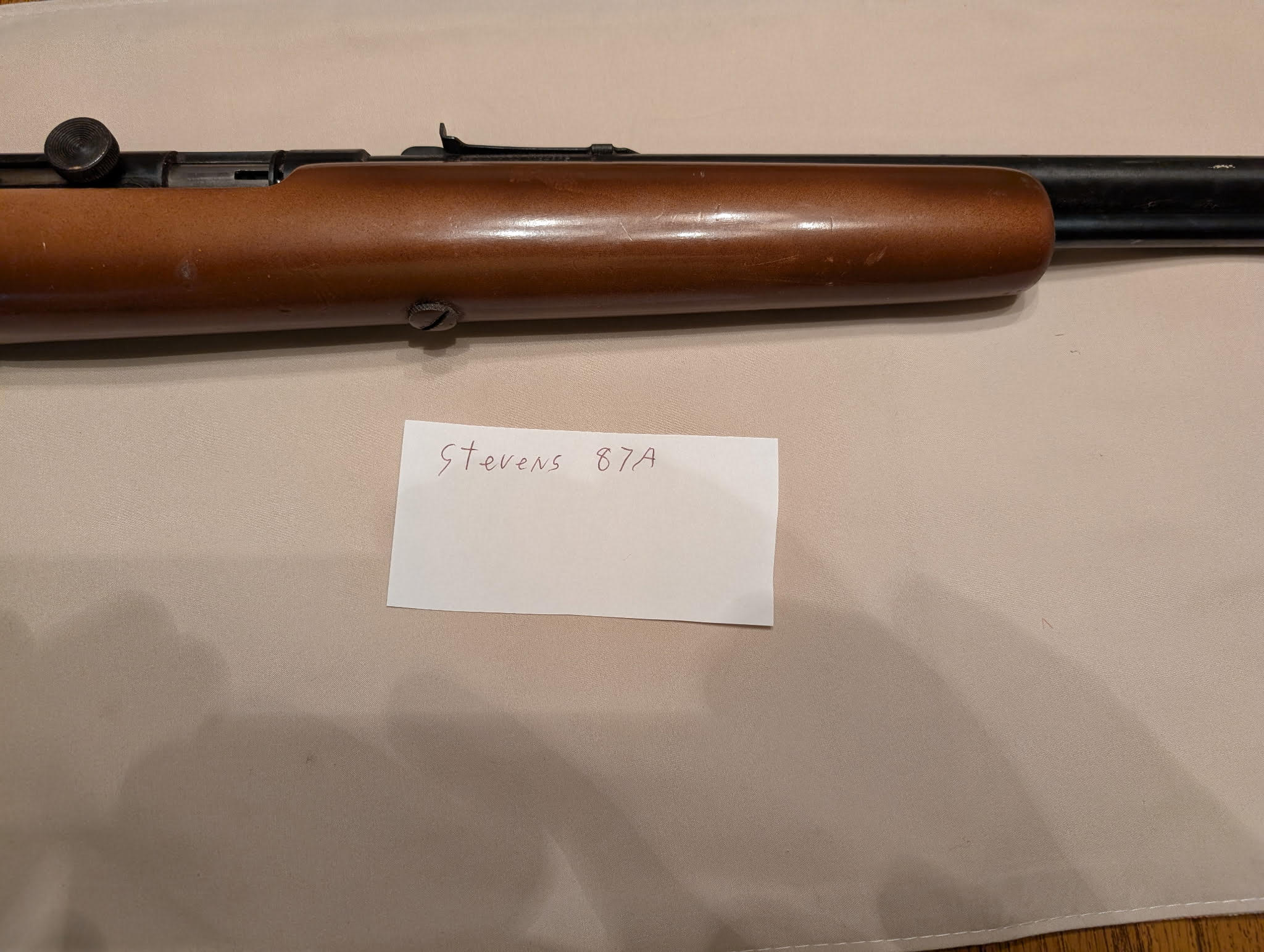 Guns: JC Higgins 12ga Shotgun, model 583.20; Remington 22 cal rifle, model 34, Springfield 22 cal rifle, model 87A; Stevens 22 cal rifle, model 87A.