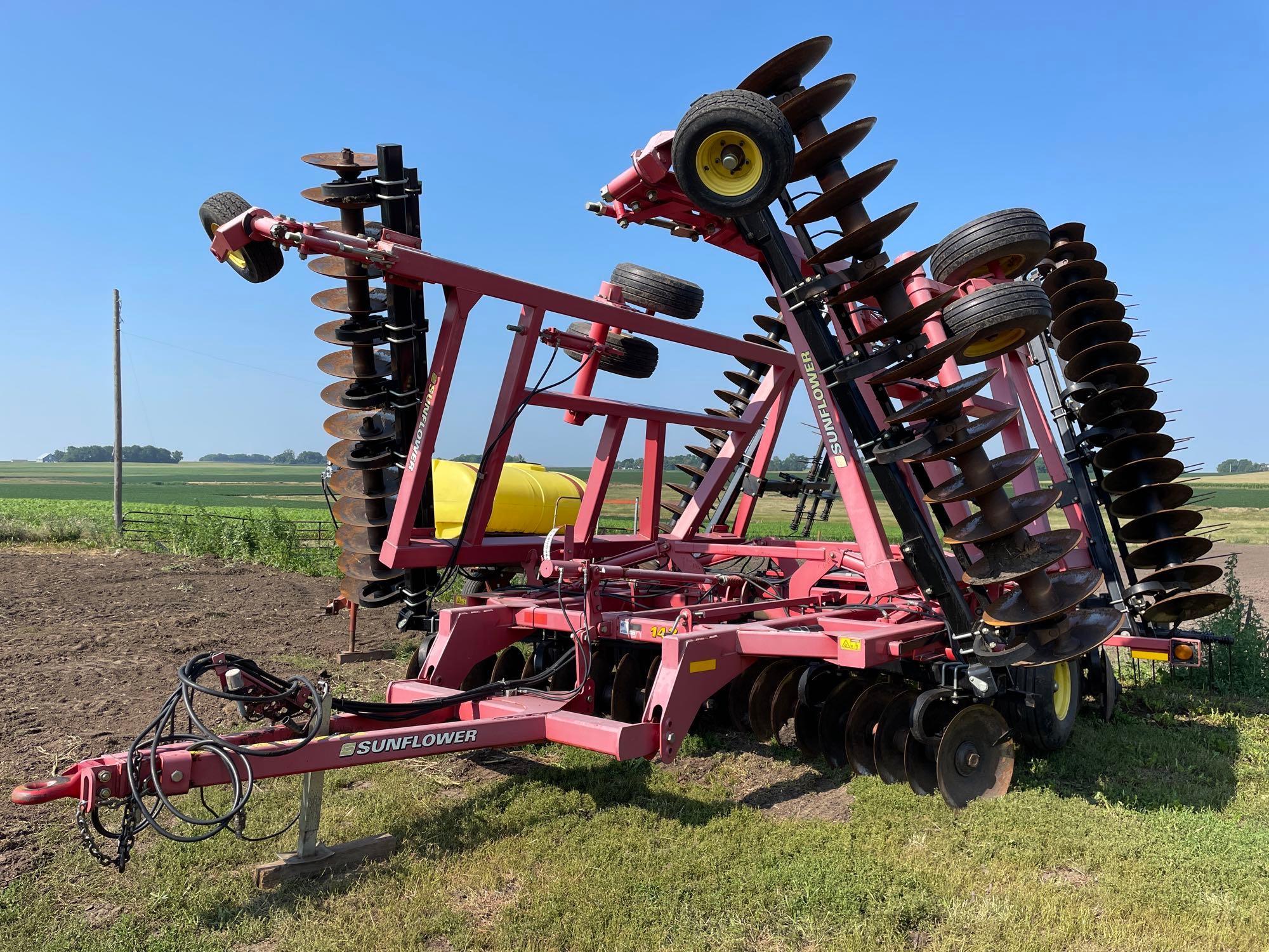 Disk: Sunflower 1435 36ft Disk—SN-1435JO8433, hyd leveling, 3 bar Gates harrow, 8 1/2” spacing, 23 1/2” front blades, 23 1/2” rear blades, hyd fold: