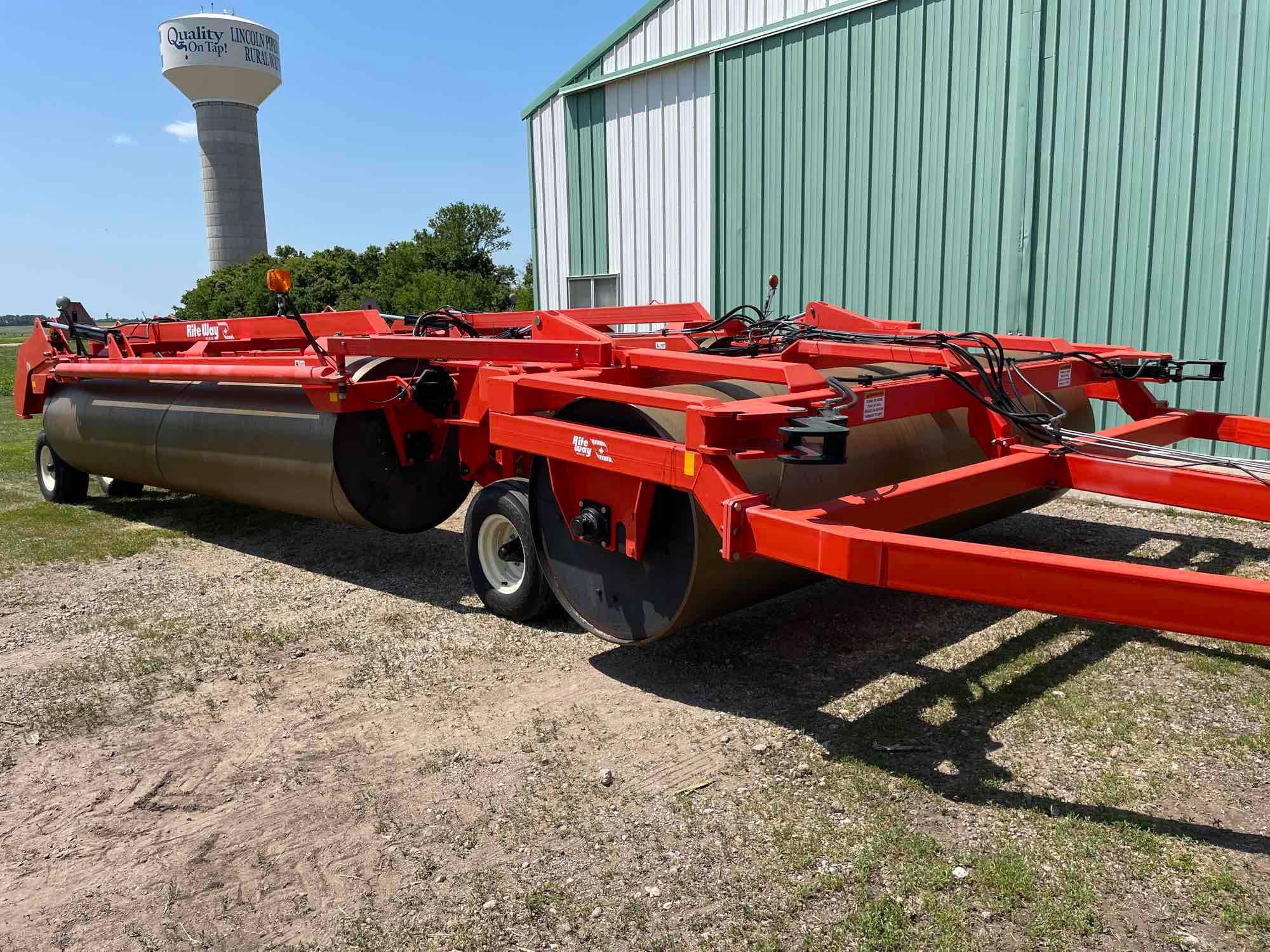 Land Roller: Riteway 42ft Land Roller—1 Owner, SN-12-1162, model FFS, hitch had a small crack but has been repaired, 11L-15 tires, hyd fold, approx. 8,000 acres total through this roller: