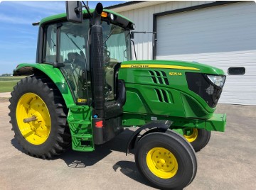 Tractors: 2013 John Deere 6125M 2WD Tractor-1 Owner-SN:1L06125MVDH775861, 1,142 original hours, 16.9R38 rear Firestone tires(80%), front fenders, 10.00-16 front Firestone tires, 2 wheel drive, 540 pto, 3 remotes, 16 speed power quad transmission, left hand reverser, 4.5L 4 cylinder diesel eng., buddy seat, heat/ac, radio, 3pt