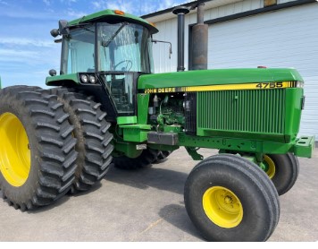 1991 John Deere 4755 2WD Tractor—1 Owner—SN:RW4755H007504, 5,072 original hours, Quad range, 1000 pto, 3 remotes, 520/85R42 Firestone rear tires with dual (80%), 16.5L-16.1 Firestone front tires, 2 wheel drive, step ladder, radio, heat/ac, quick hitch, 2 sets of rear wheel weights, tractor has had new alternator approx. 1 year ago, tractor has also had new starter and ac approx. 3 years ago, Very nice clean good running tractor!!