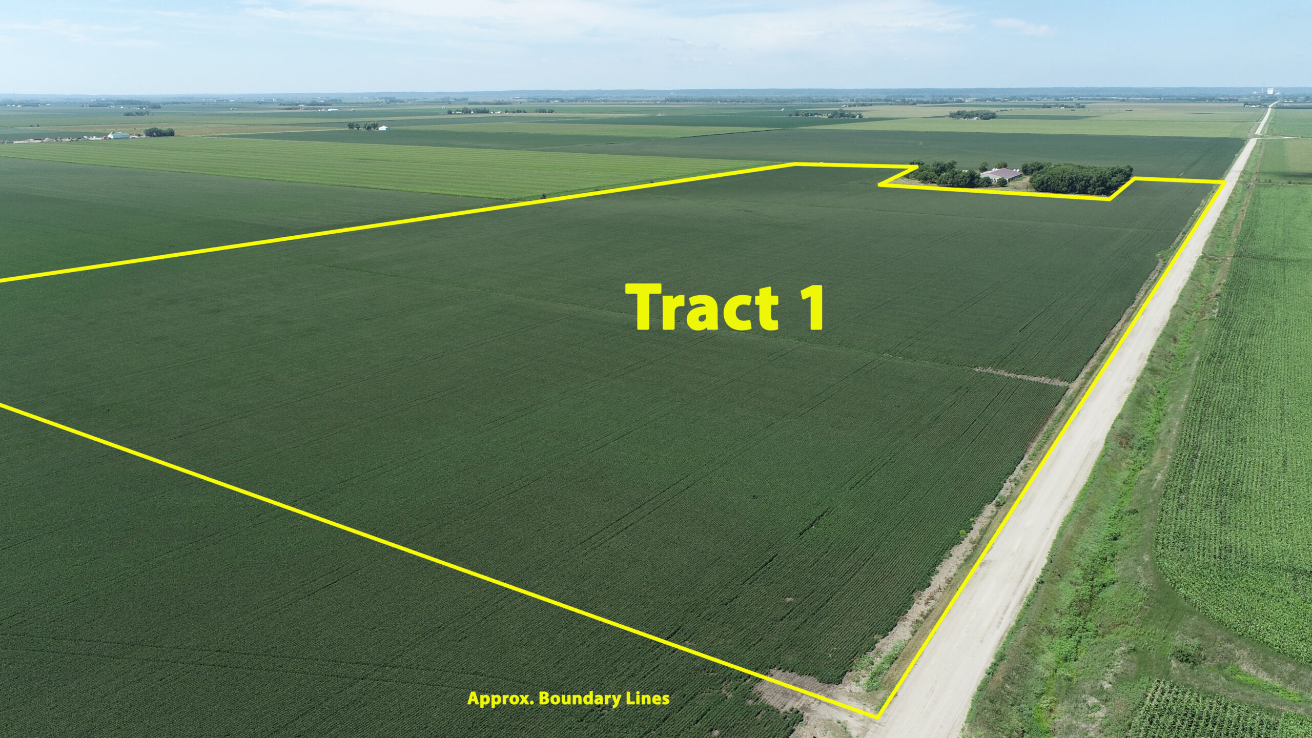 Method of sale: Tract 1 & Tract 2 will be offered in the choice method. The first successful bidder will be permitted to select the tract of their choice or they may select both tracts. If the first successful bidder only selects one of the tracts then whichever tract is remaining will then be sold. The tracts will not be combined in any way. If the first successful bidder of the first round of bidding selects both tracts then the auction will be over. Tracts will be sold with the final bid price times the gross surveyed acres. Auction to be held at the site of the farmland.