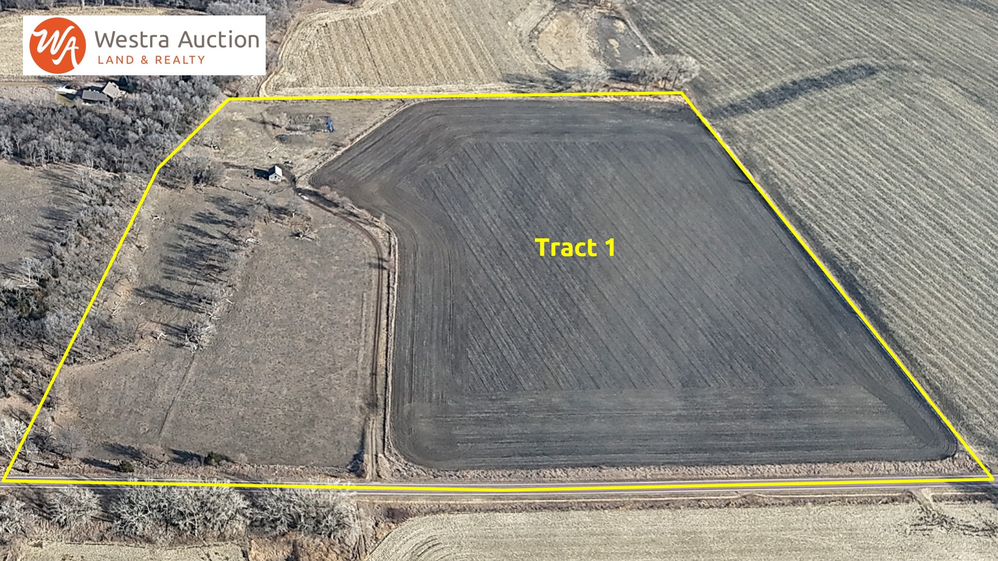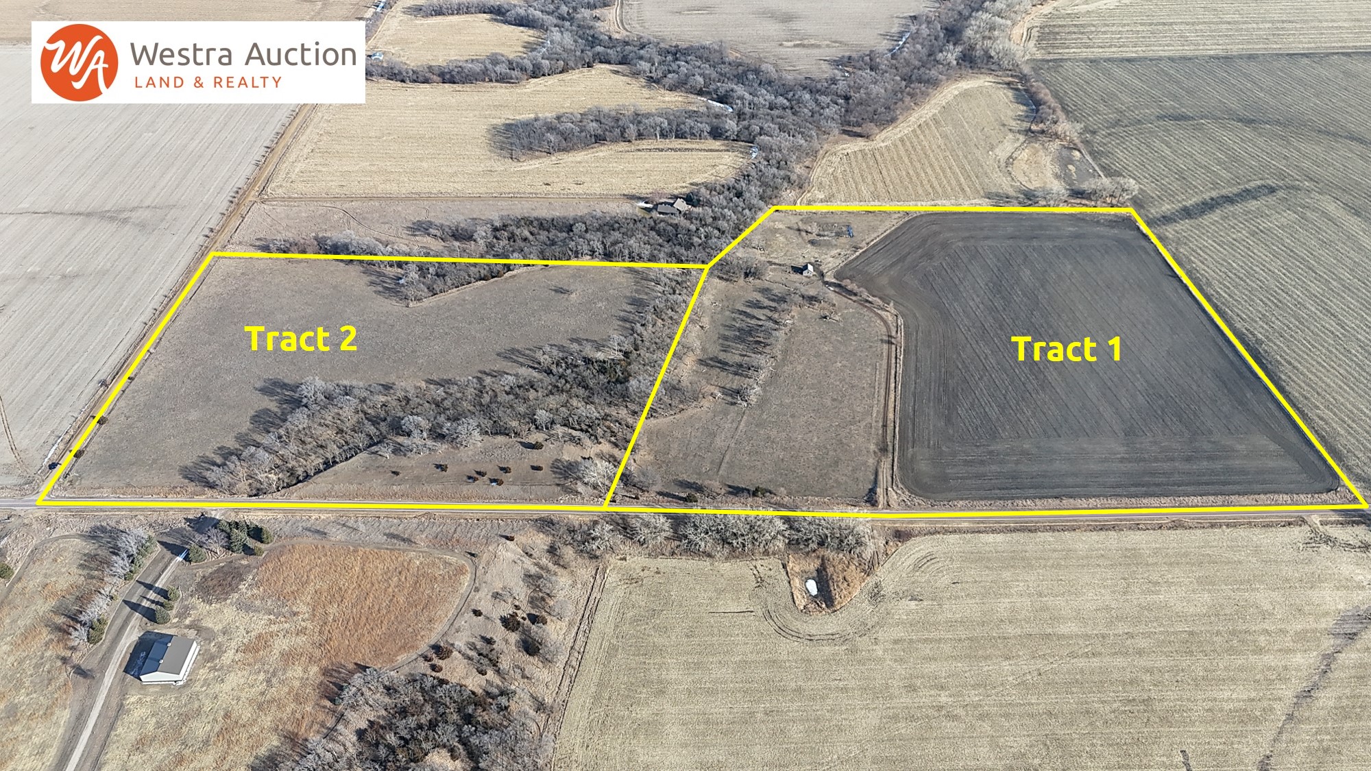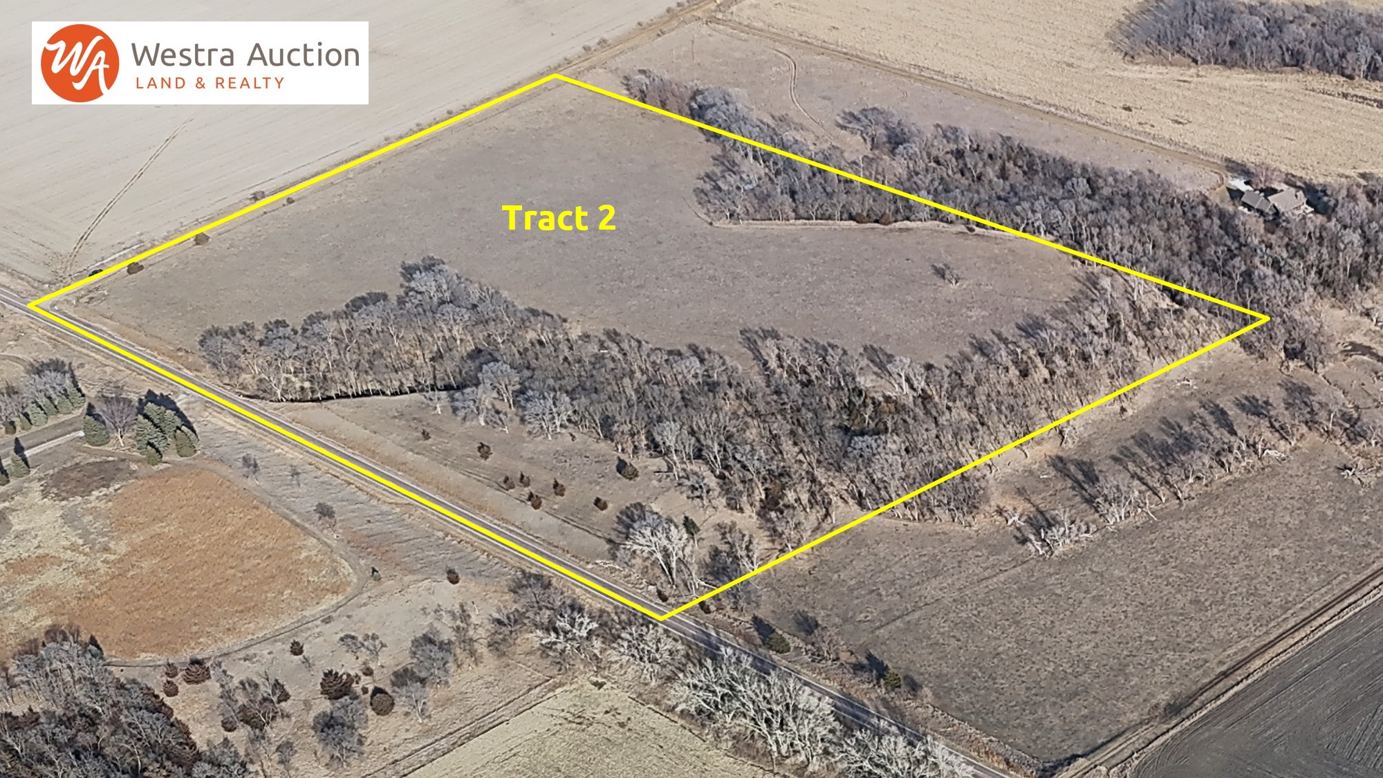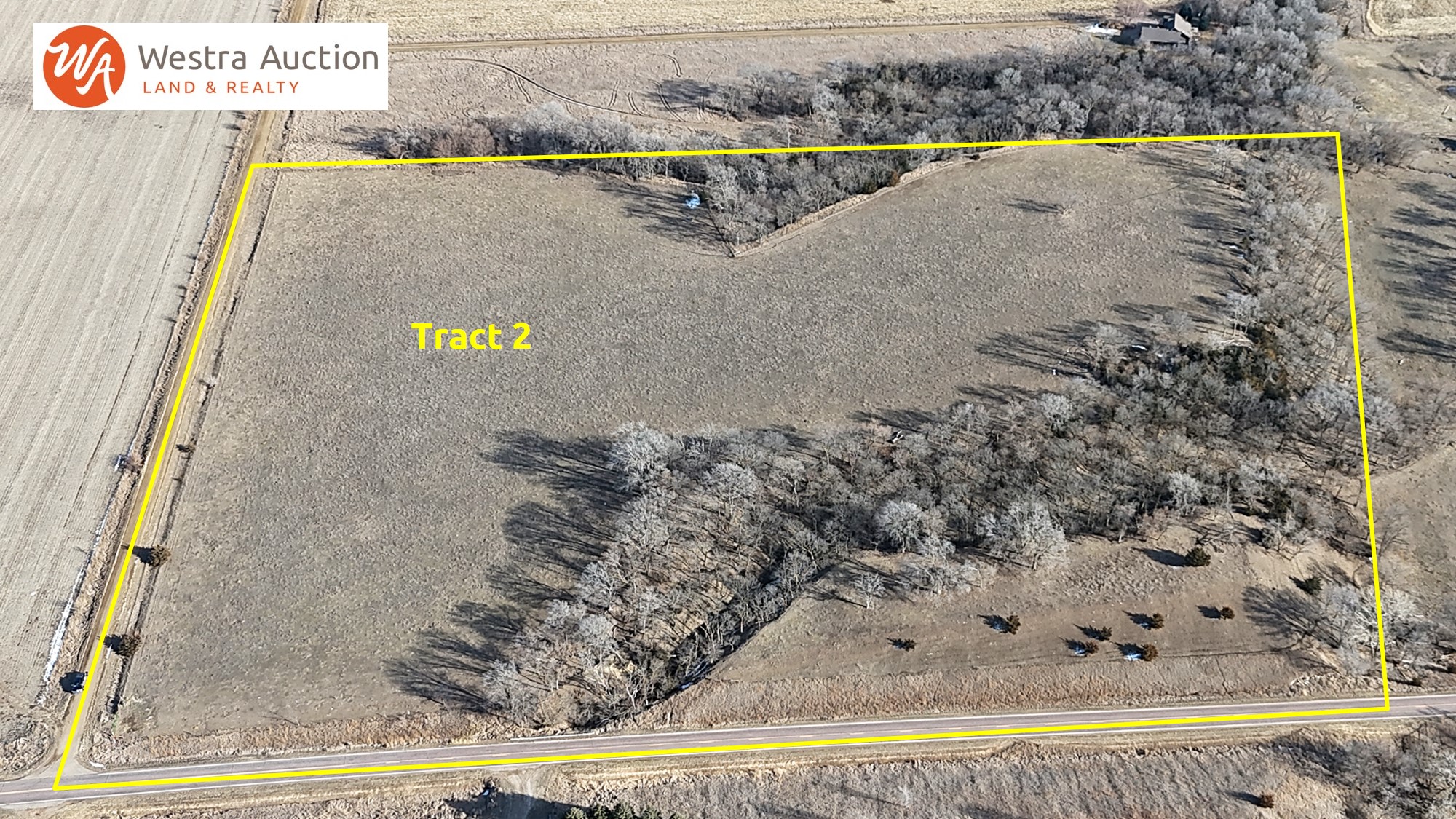 Tract 1:  39.43 +/- acres, 1 building eligibility.  The land includes approximately 25 acres cropland with the balance of the land in pasture, trees, dugout, well and older outbuildings.  According to Surety-AgriData, the land has a productivity index of 82.2. The cropland is leased for the 2025 crop year and the buyer will be credited the 2025 crop lease payment.