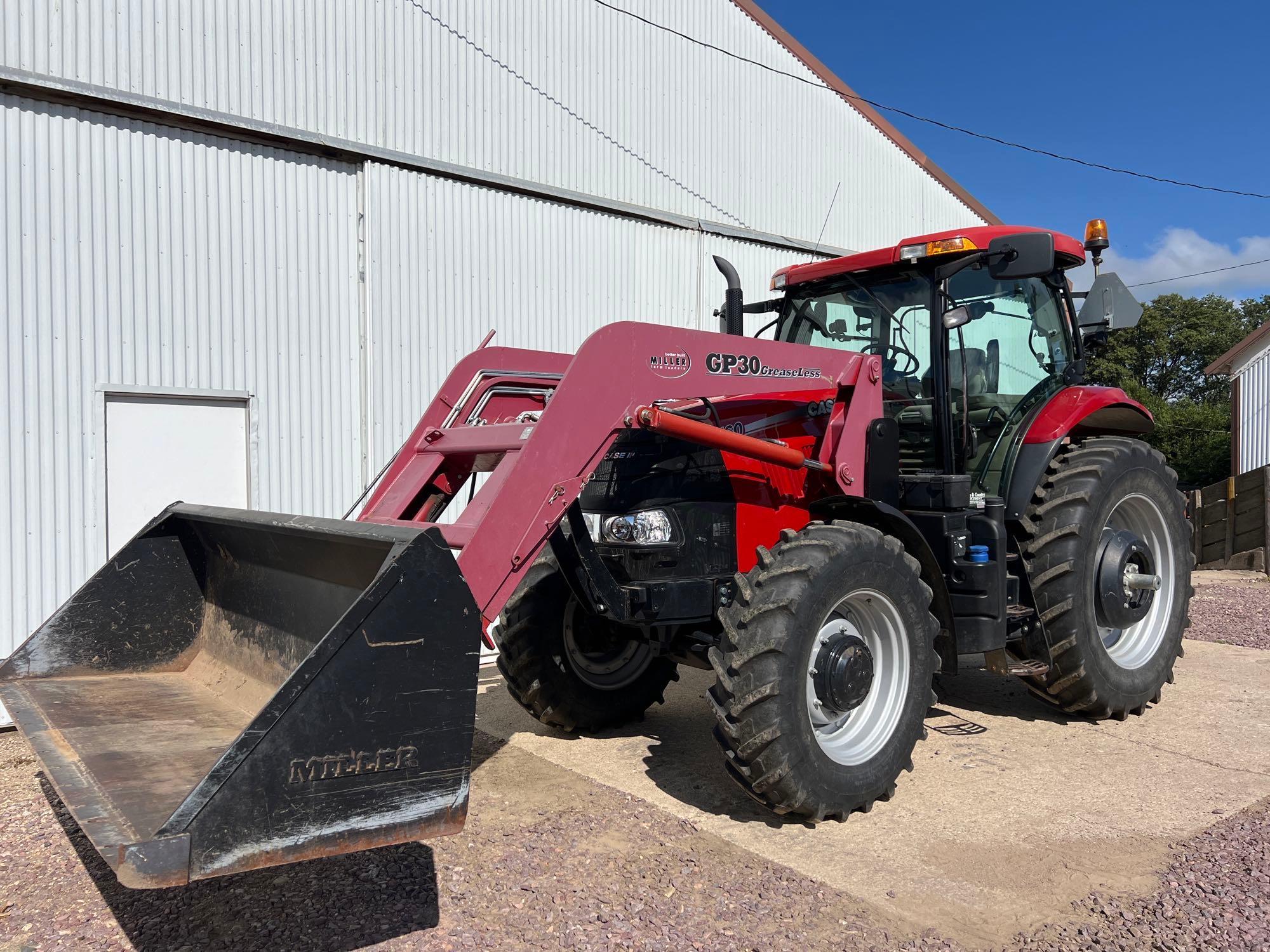 2012 Case IH Puma 160 MFWD Tractor w/ Miller GP30 Loader—1 Owner—SN:ZCBP21806, 1695 hours, powershift transmission, 540/1000 reversible pto, 3 remotes, 3pt, 480/80R42 rear tires, 380/85R30 front tires, Miller GP30 loader with 9ft bucket, left hand reverser, buddy seat, 110v cold weather package, beacon light, suspended deluxe cab, deluxe suspended seat, front fenders, this tractor was inspected in February of 2024 and inspection report is available. CLICK HERE FOR BUILD SHEET/INSPECTION