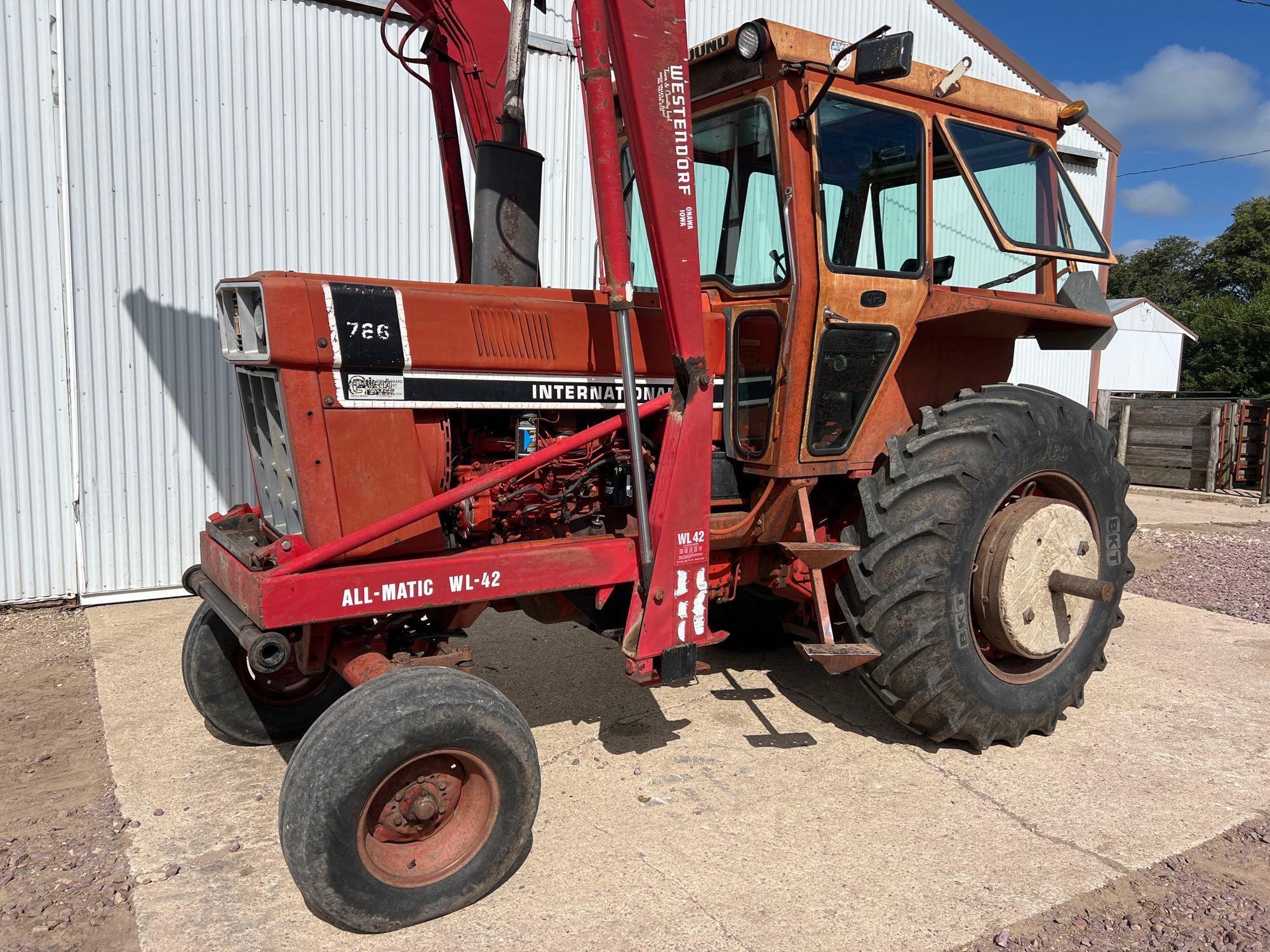 International 766 Black Stripe Tractor w/Westendorf WL42 Loader—2nd Owner—SN: 2490191-U017567, shows 7455 hours, rear cement wheel weights, 18.4-34 rear tires, Year-a-round Qt-1 cab, 2 remotes, 540/1000 pto, Westendorf WL42 loader with 7ft bucket