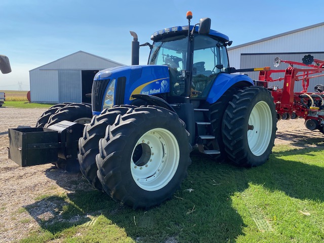Tractors: 2011 NH T8.390 tractor, 1,955 hours, front duals with suspension, 50’’ rear tires, 380/80/R38, Mega Flow hyd. with 6 outlets HD drawbar, rear weights, 19 speed powershift (30 MPH), 200 lb. front weights; 2008 T8050 tractor, front duals and fenders, 50’’ rear tires, deluxe cab, 2,217 hours, Mega flow hyd. with 5 outlets, 18 speed, rock box; 2003 NH TG285, 2,742 hours, 46’’ tires, 4 hyd., 40 gpm pump, brand new 34’’ front tires, super steer, foot throttle, sold with Miller M35 loader (2016), loader is slightly sprung, 8.5’ bucket, single point hook-up, pallet forks sold separate.