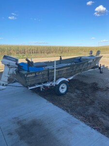 Jon Boat: 1996 1648 Lowe Big Jon Boat-30hp Johnson 2-stroke,electric start, 2” ball, Led Lights, Rod Holders, Bimi Top, 2- seats, Bildge pump, Livewell, Hummingbird 898 with side and down imaging, new battery, shore lander trailer, no leaks, runs good