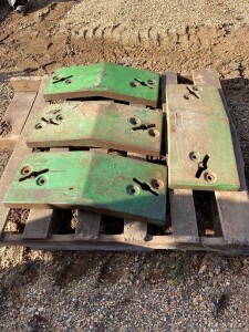Miller 48 inch loader pallet forks: 1 set of Tractor Chains-App 28” wide, 152” Long. Straight Bars: Rock box/toolbox: 5 sets JD wheel weights: JD starter weights & 6 slabs: