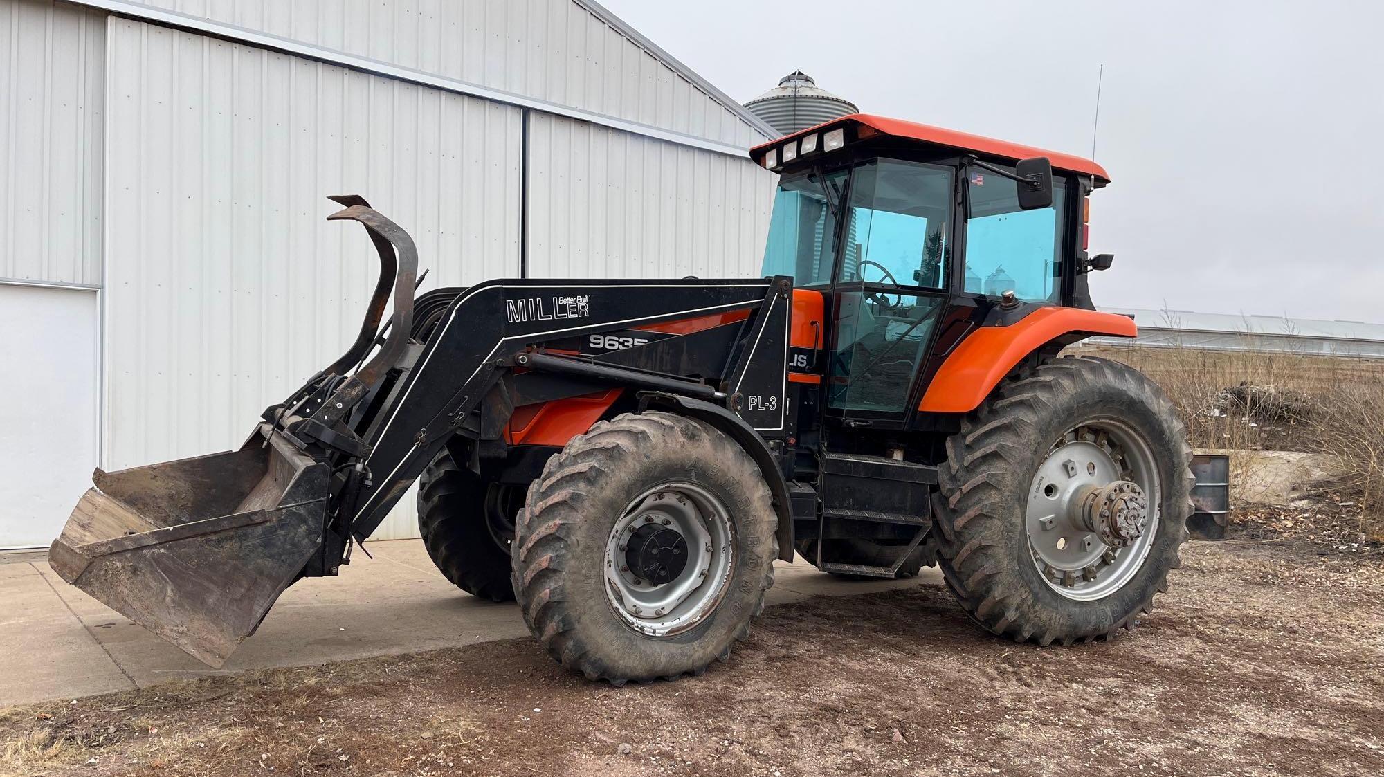 Tractors: Agco 9635 FWA Tractor w/ Miller Loader–Shows 3197 hrs, 18 speed Power Shift, Front wheel assist, 3 remotes, 18.4R42 rear tires, 16.9R28 front tires, 540 pto, radio, air, heater, front fenders, Miller PL-3 loader with 8ft grapple bucket