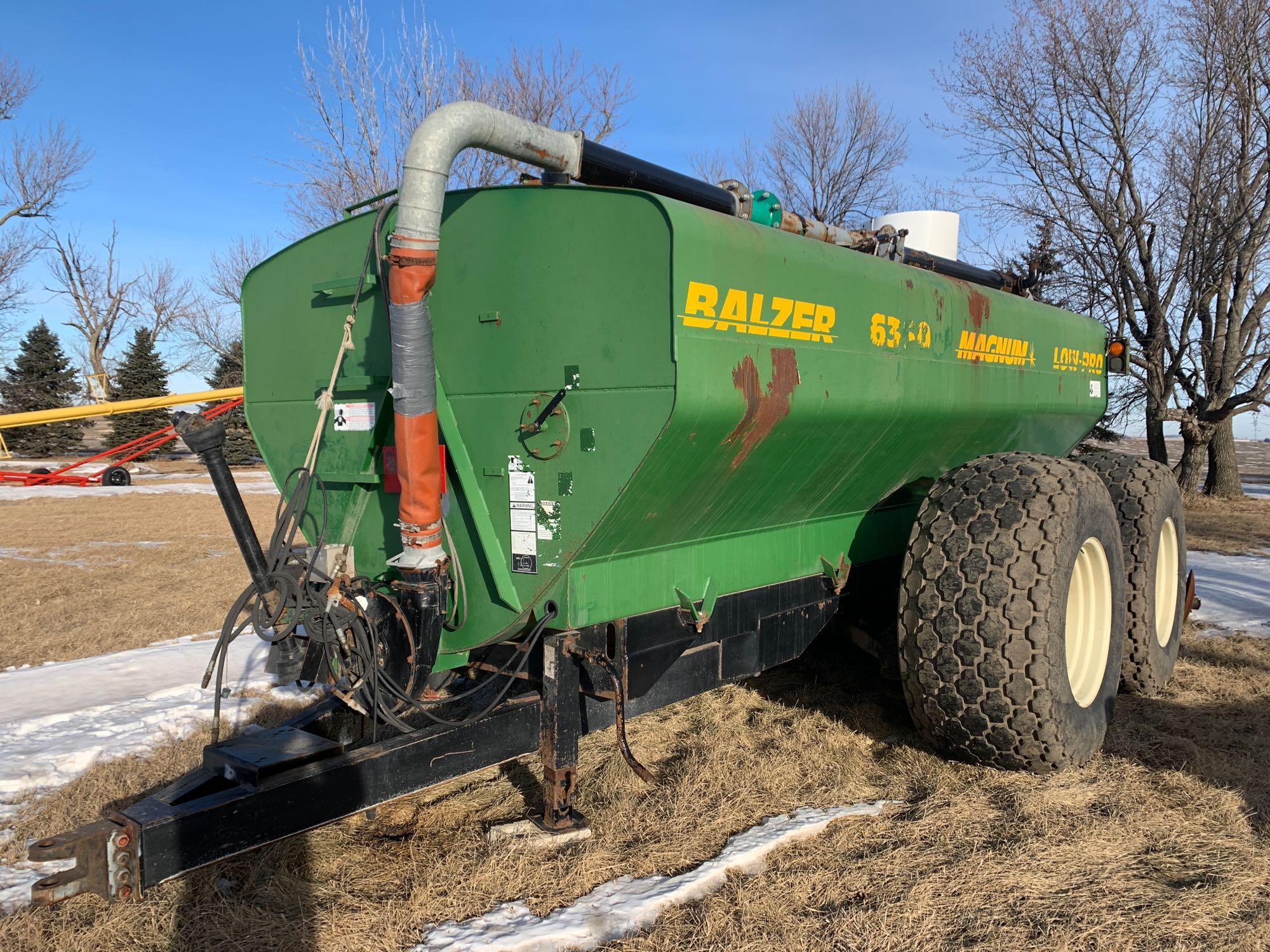 2002 Balzar 6350 Magnum Manure Tank: sn-lp6351t30tstb, sn-6348, 5rw38 custom made toolbar, tandem axle, 30.5-32 tires, small 1000 pto, could add flow meter, is not sold with a meter, brakes, no leaks on tank, some hoses could use replacement, fully functional