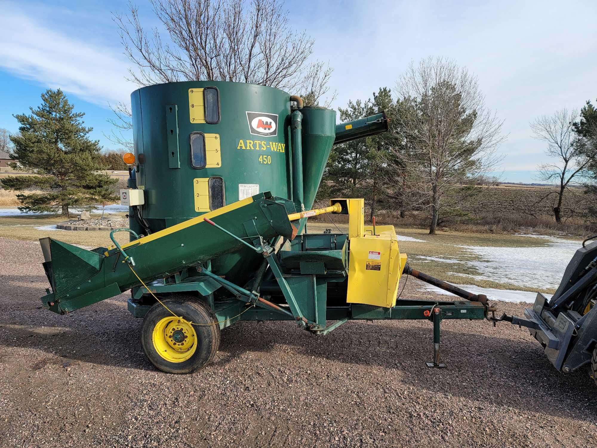 Arts-way 450 grinder mixer–1 Owner: always sheded, 1 owner, scale, knives never turned, 15ft auger, extra screen, little use, has dent in front shield (see picture), nice shape.